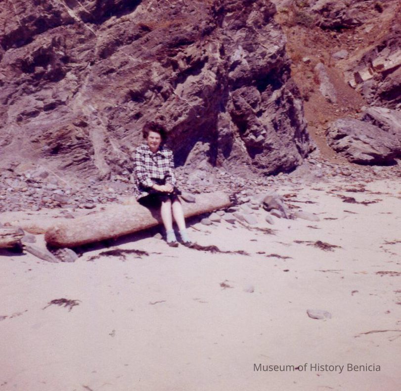 Color Photograph of an unidentified woman sitting on a log near a beach