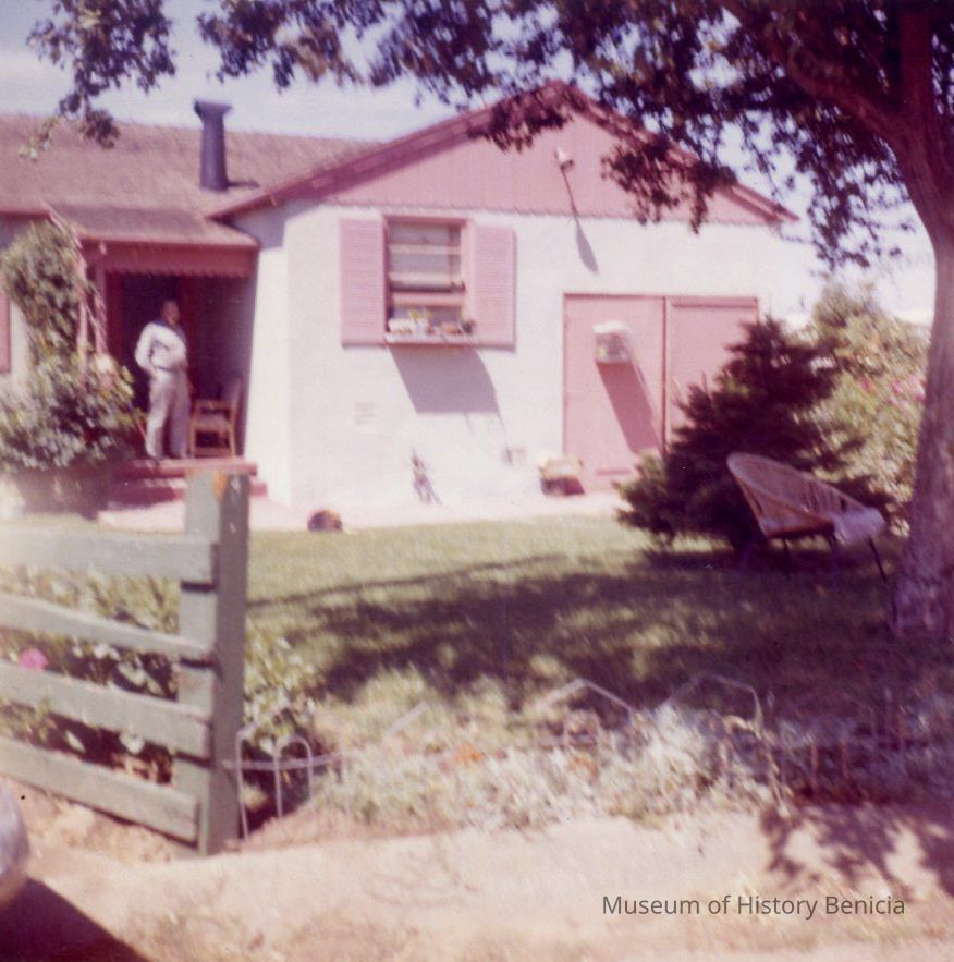 Color Photograph of a person standing on the porch of a house in an unknown location.