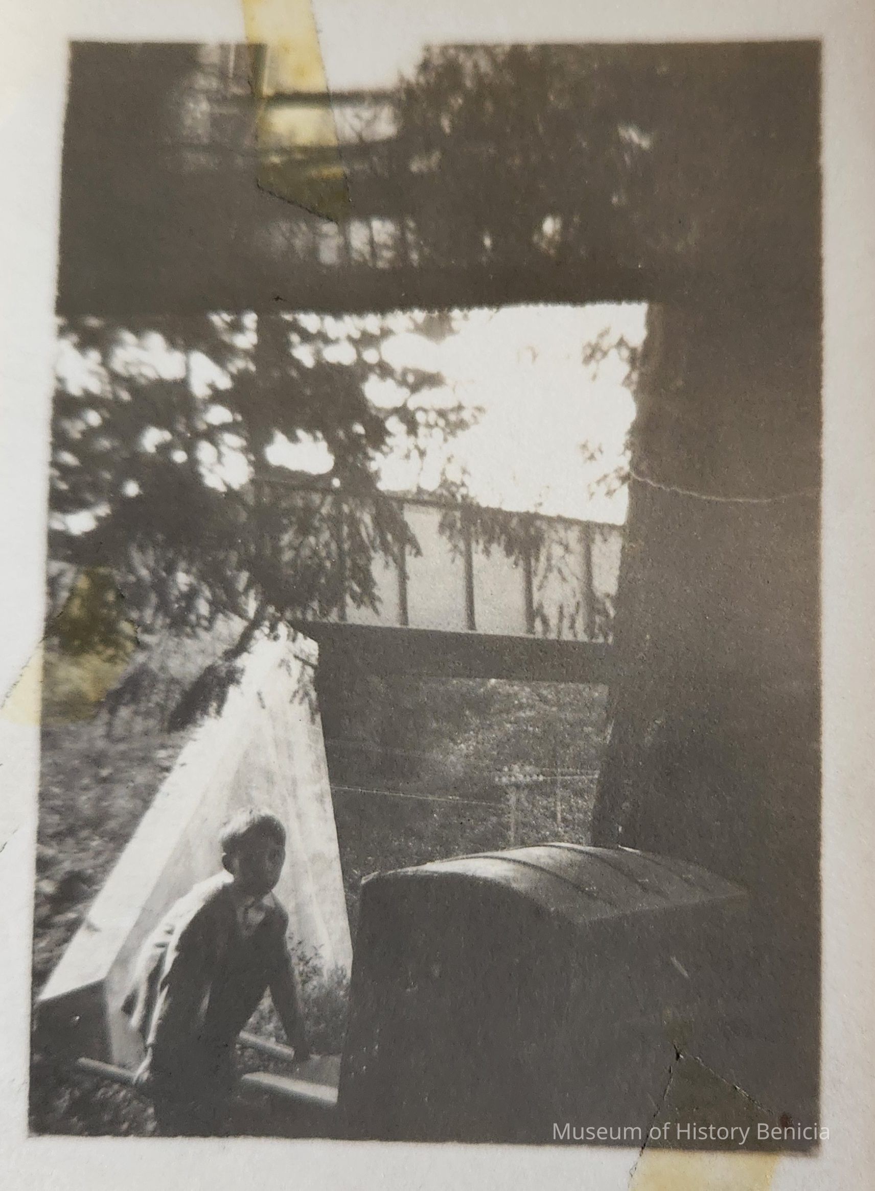 B/W Photograph of a young boy with a trunk on a cart. The boy is holding the handles.