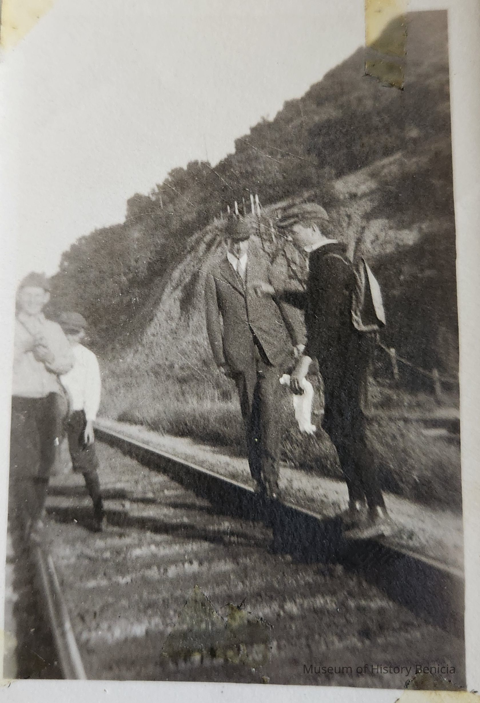 B/W Photograph of some boys and teens standing on some railroad tracks.