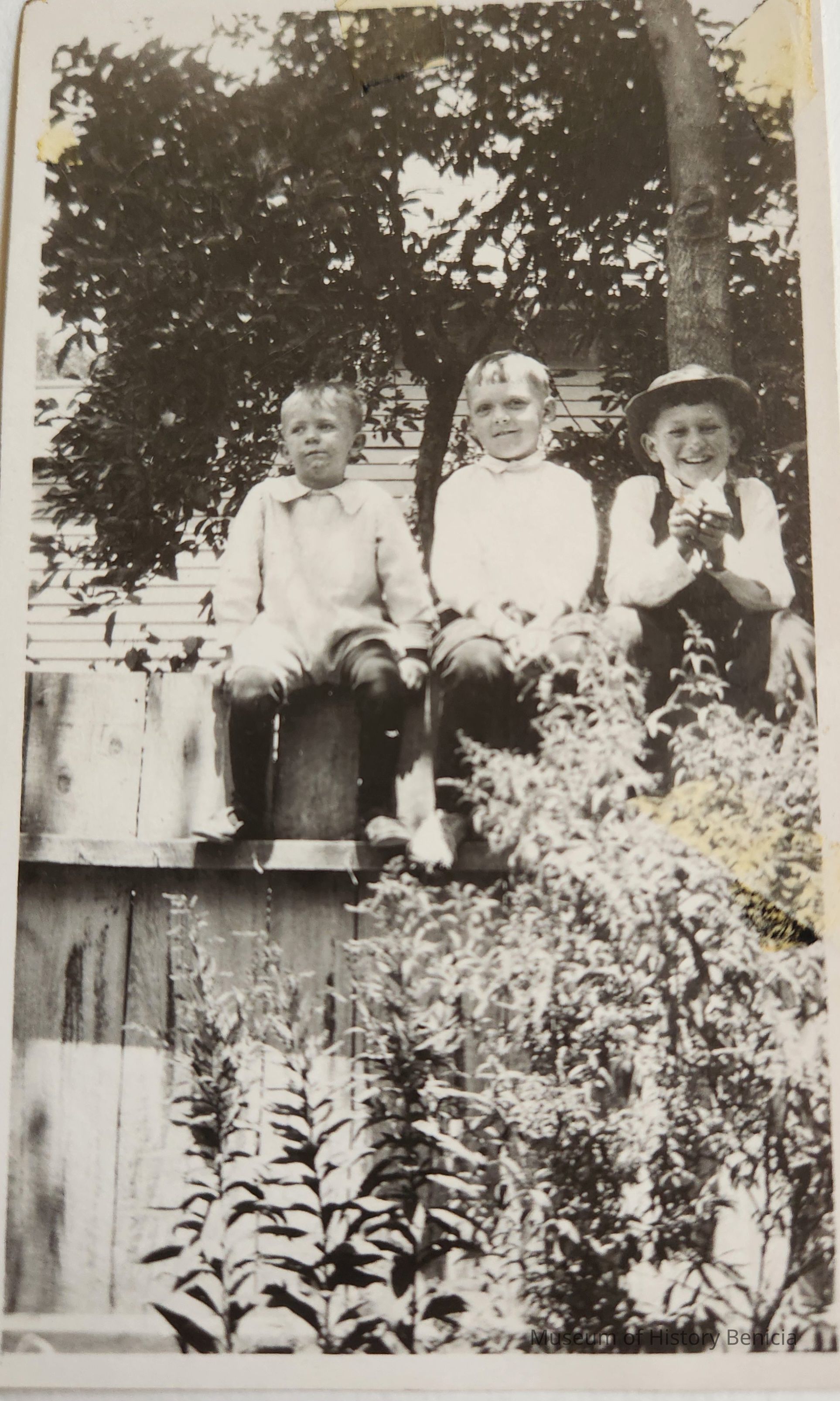 B/W Photograph of three young boys sitting on a fence