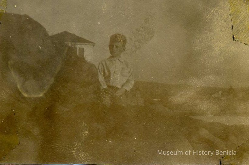 B/W Photograph of an unidentified boy standing by some rocks near a body of water.