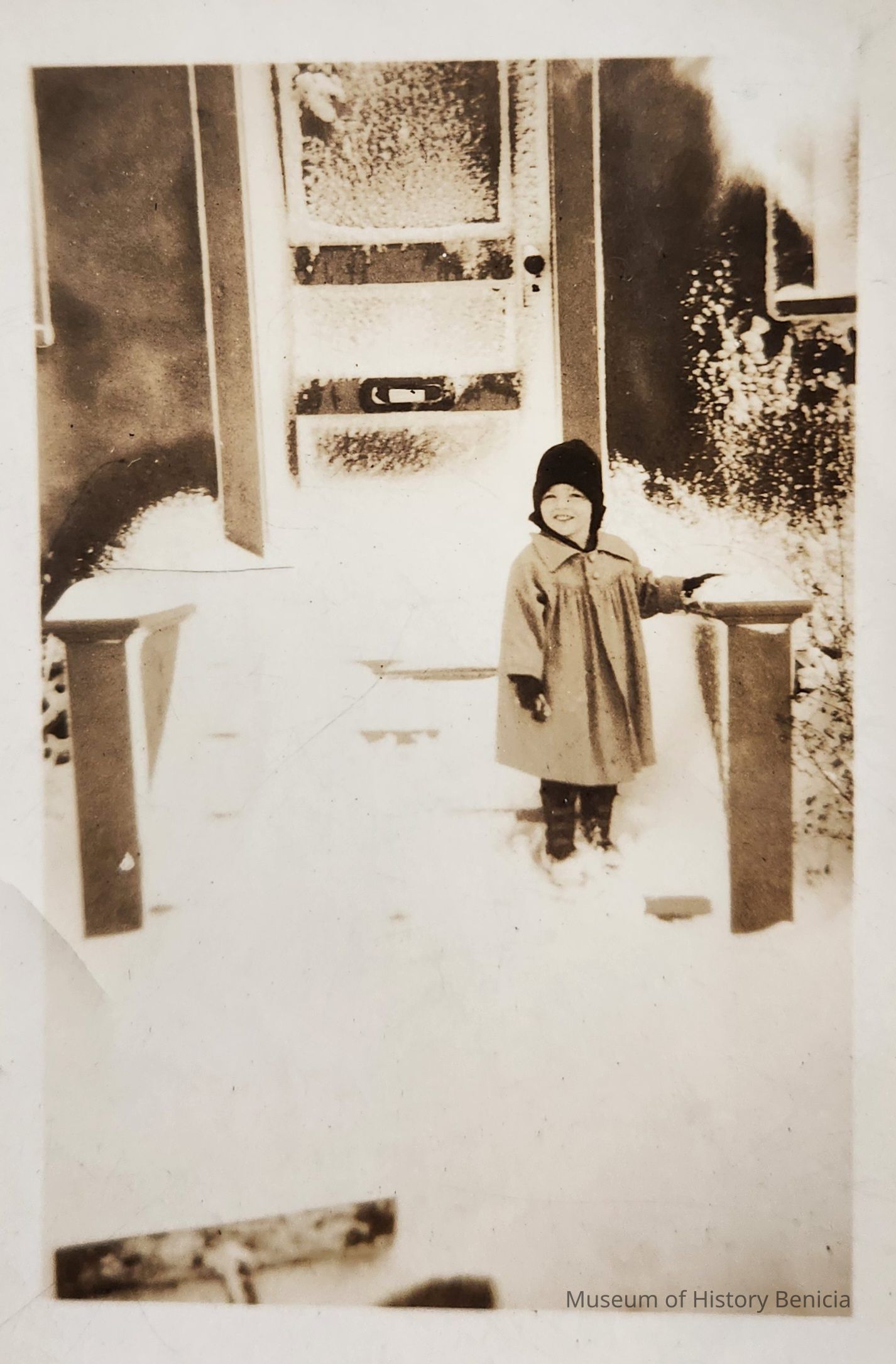 B/W Photograph of an unidentified young girl standing on a snowy porch.