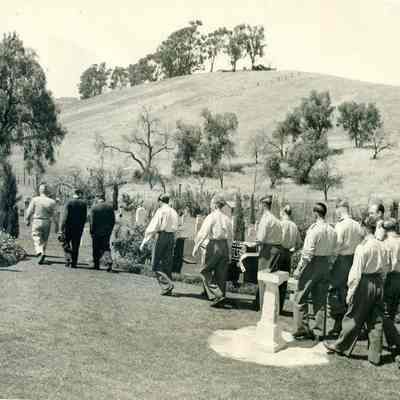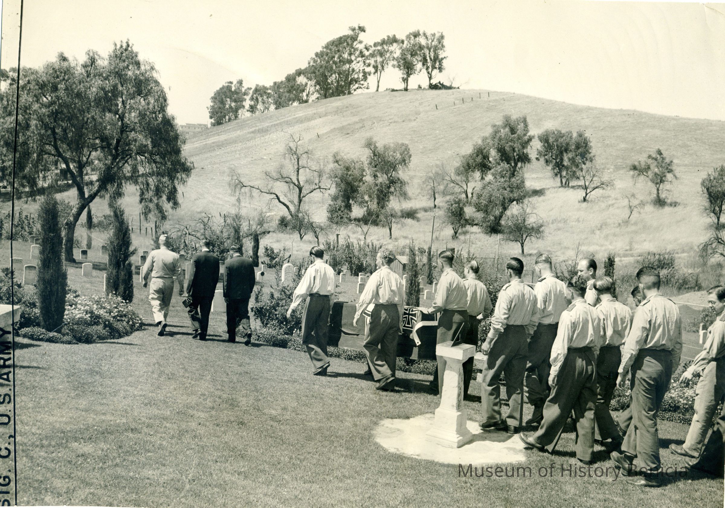 This is a photograph of the Benicia Military cemetery. It shows a funeral for a German Prisoner-of-War. Photo taken by Signal Corps of US Army.Collection