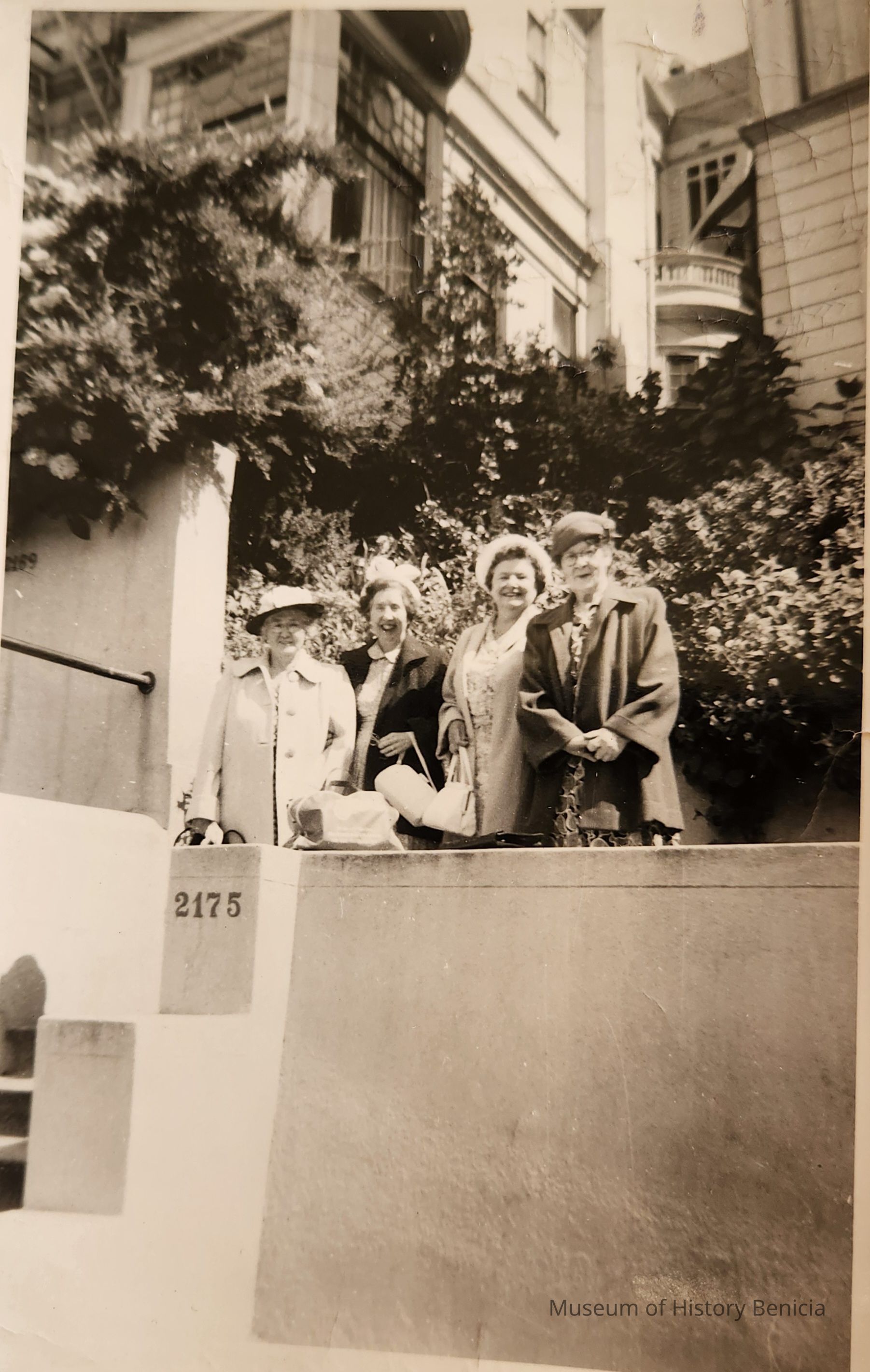 B/W Photograph of four ladies in front of a house in San Francisco. The house number is 2175 but the street is unknown.