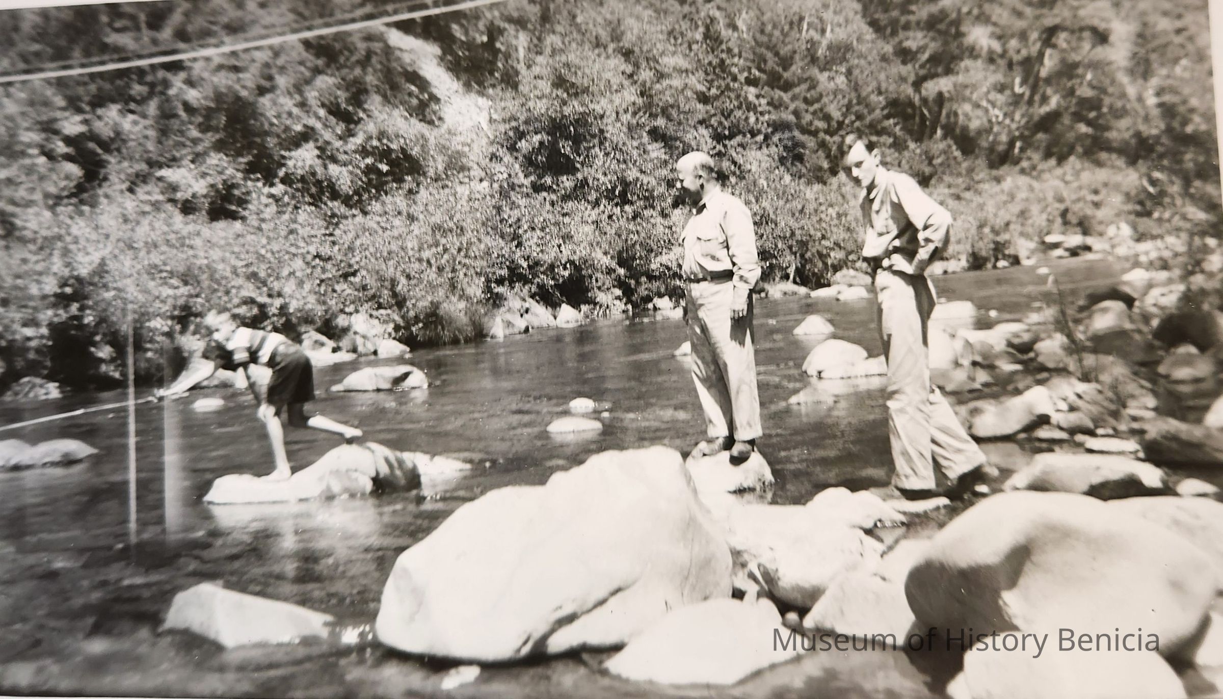 B/W Photograph of two men and a boy standing on rocks by a river.