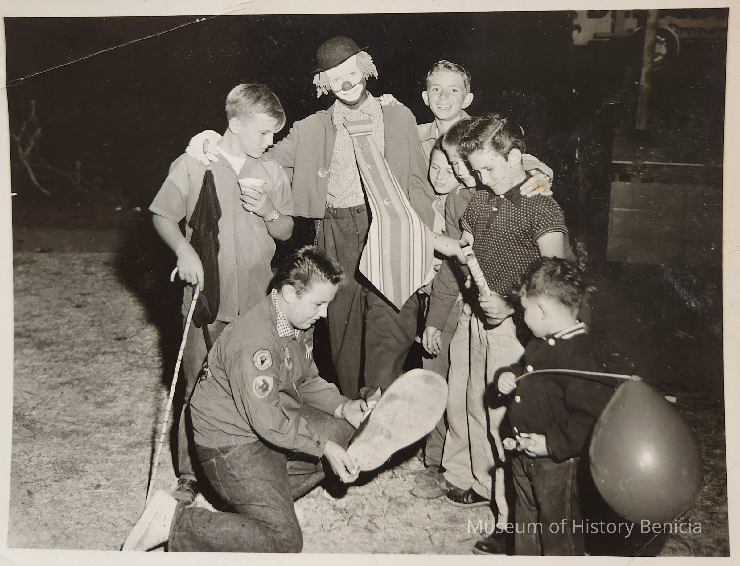 B/W Photograph of seven boys with a clown. They are looking at the clown's feet at a Scout Carnival.