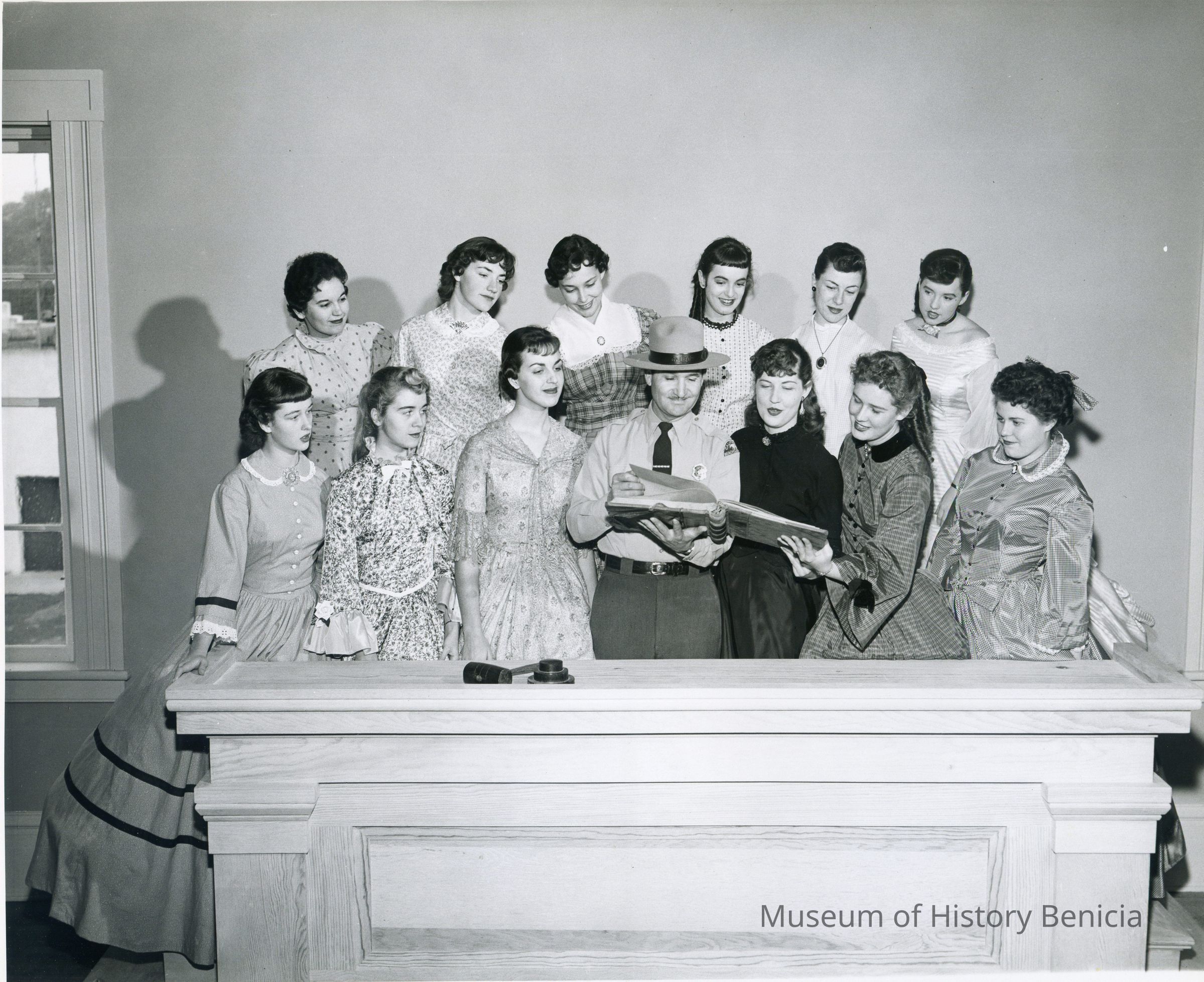 This is a photo of a group of young ladies who served as hostesses for the dedication of the Old State Capitol in 1958 studying the Capitol history with a State Ranger.