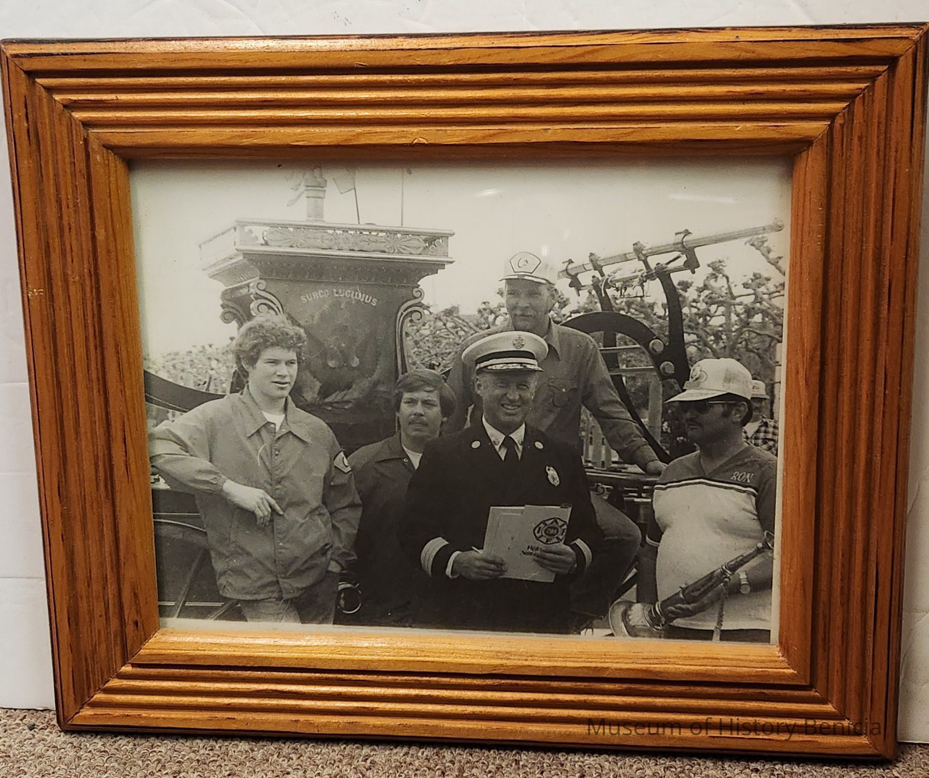 B/W Photograph of five men in a wooden frame, under glass L-R: Scott Brooks; Tim Winfield; Chief S.F. Fire Department; Allen Hodges; Ron Rice.