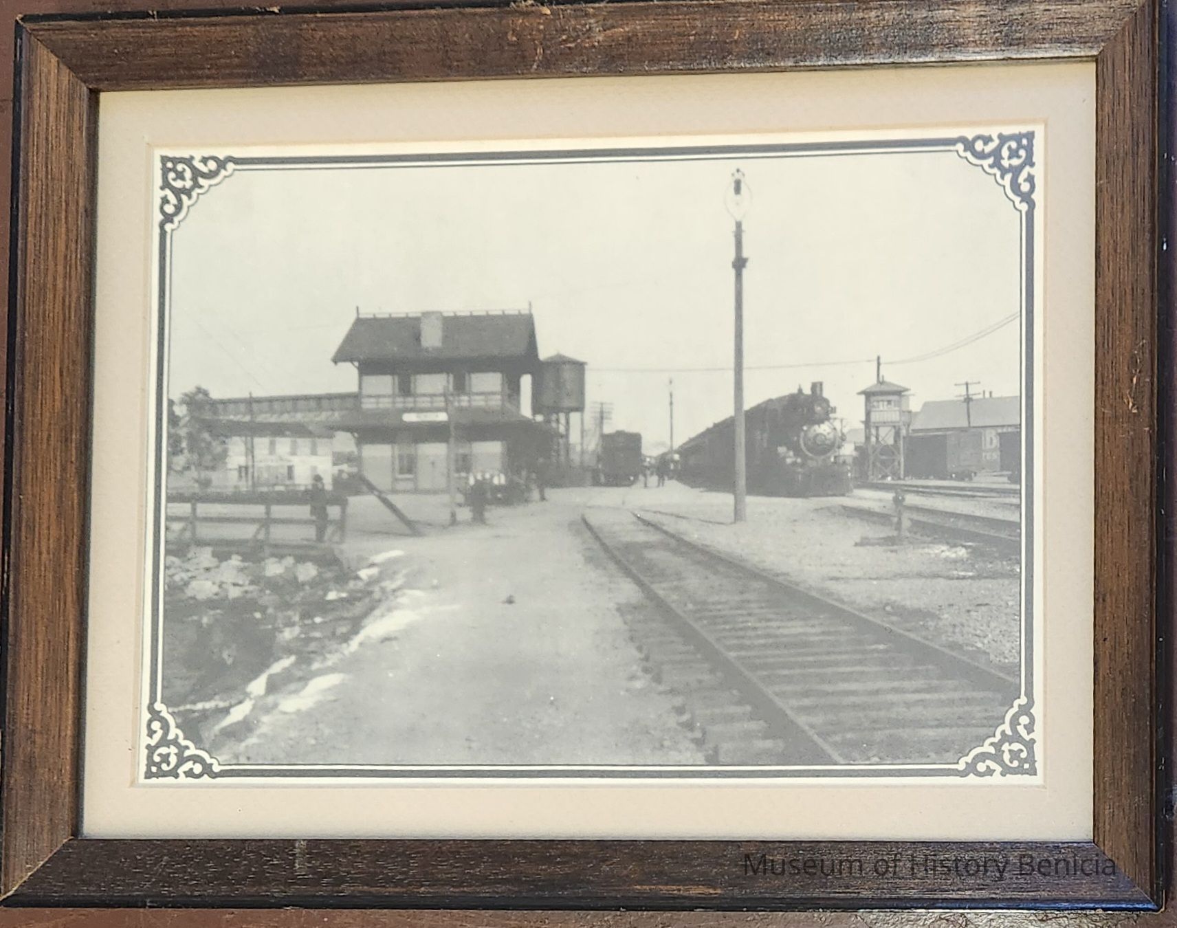 A picture of the Benicia Railroad Depot, brown wooden frame, a black and white photo. On back of frame there is a description of the photograph.Photograph Details