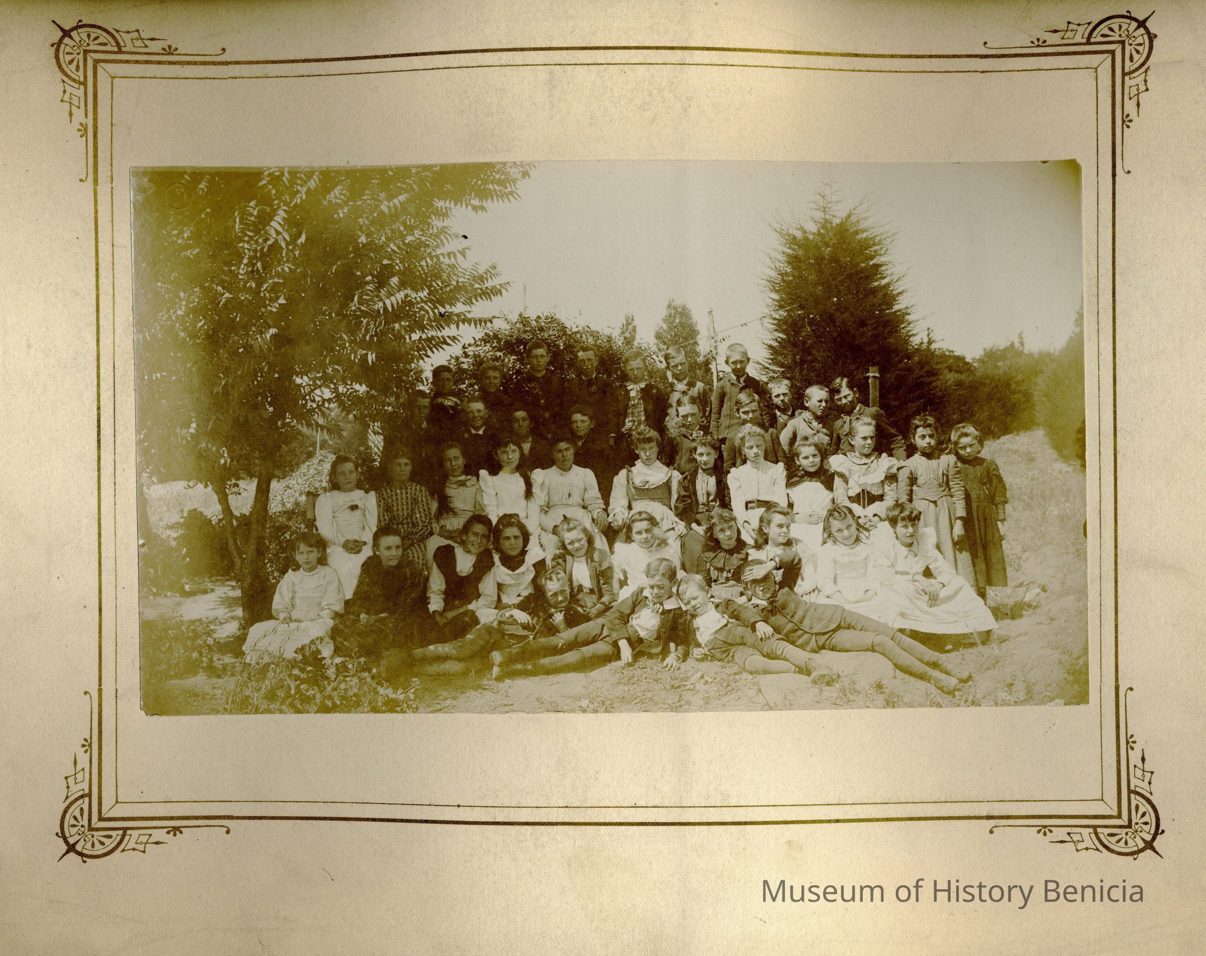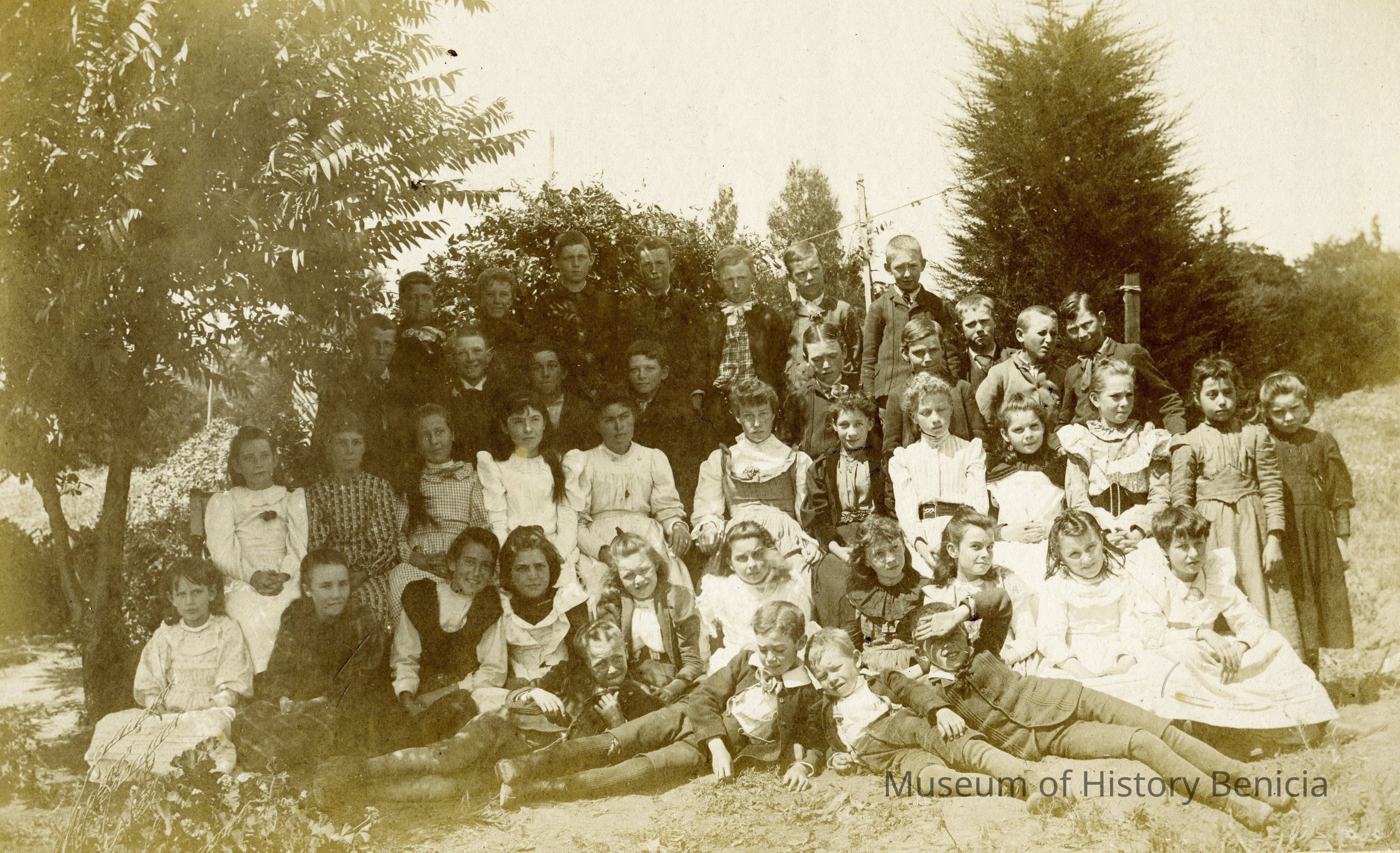 This is cabinet card of a group of young men and women outside. The back identifies this as "V. Miss Reed". The timeframe looks like 1910 to 1920. This may be a class photo. Stamped on the back is "Department of Public Instruction State of California Benicia District Library Solano County".Collection