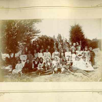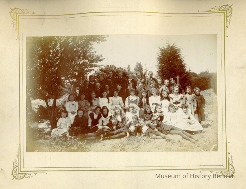 This is cabinet card of a group of young men and women outside. The back identifies this as "#5 P.S. Miss Reed". The timeframe looks like 1910 to 1920. This may be a class photo. Stamped on the back is "Department of Public Instruction State of California Benicia District Library Solano County".Collection