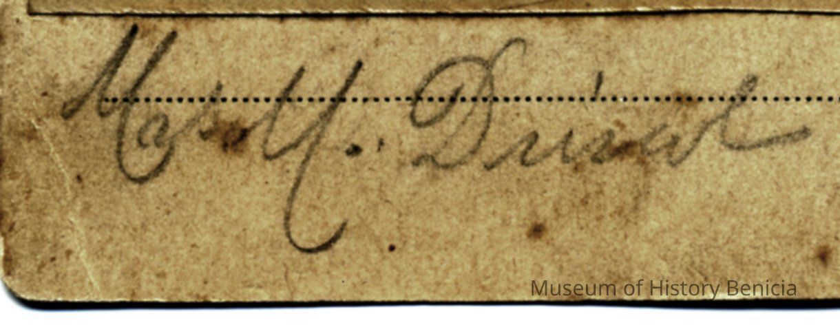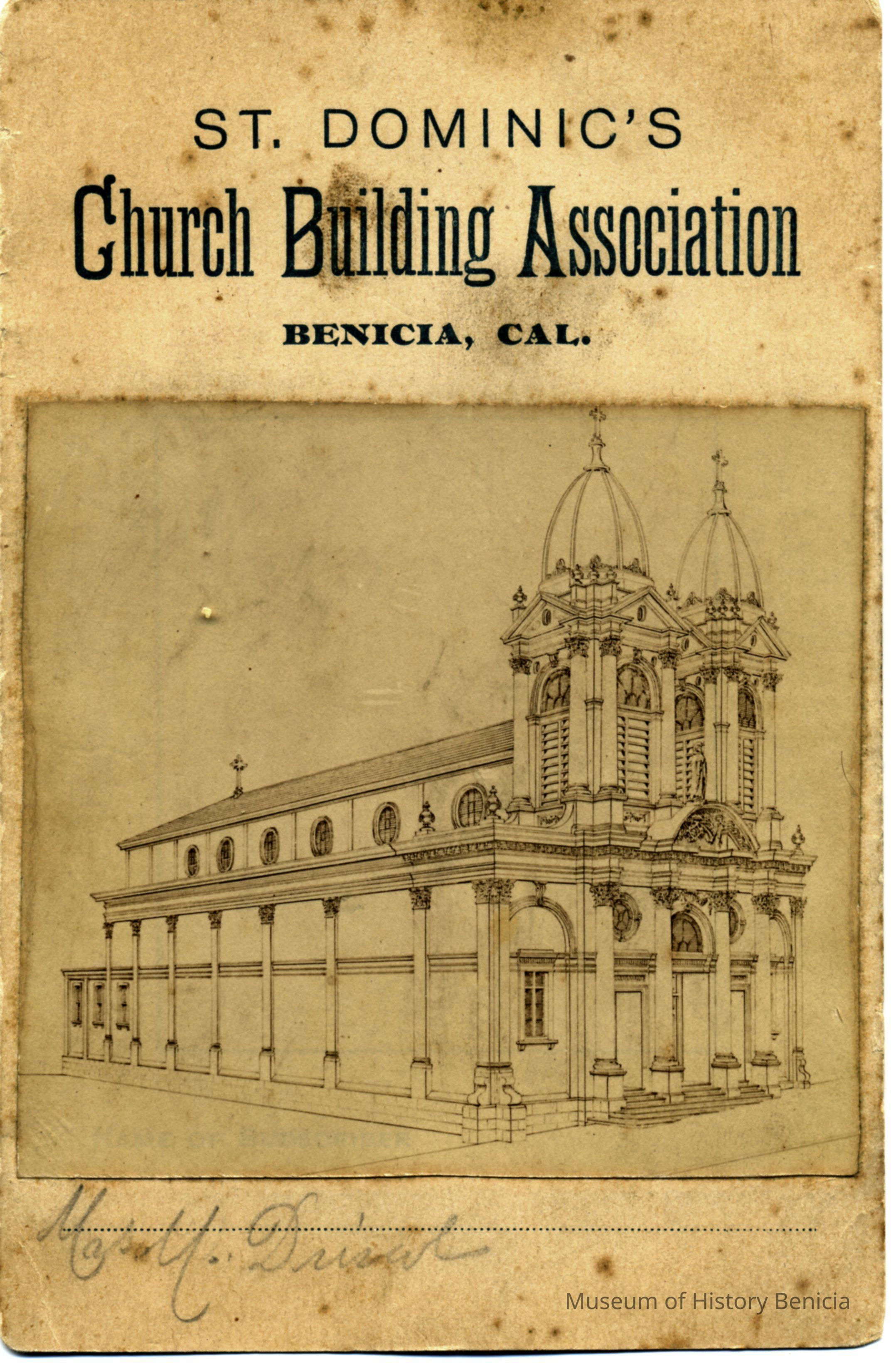 This is card of St. Dominic's Church Building Association in Benicia, Cal. Not sure of the year but it shows a drawing of the church on the front and a name is written on the bottom.Collection