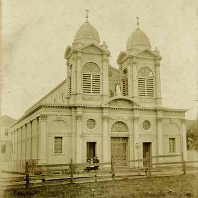 This is cabinet card of St. Dominic's Church. There are a few kids on the steps.