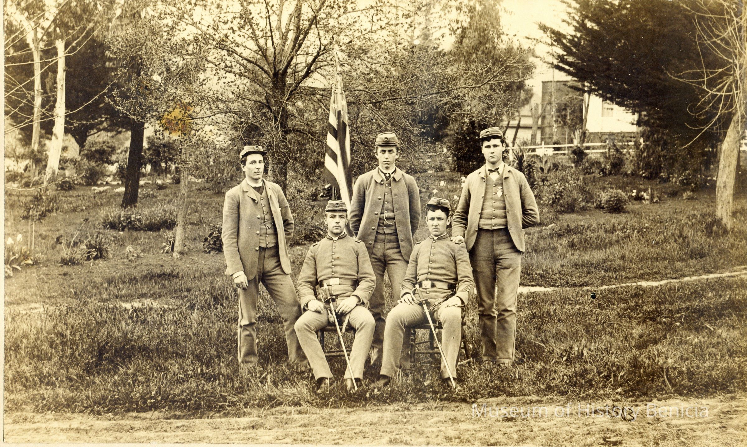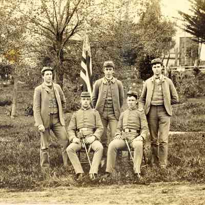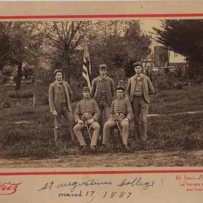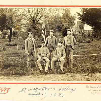 B/W photograph: Five St. Augustine's College cadets, photographed March 17, 1887. Cadets not identified.