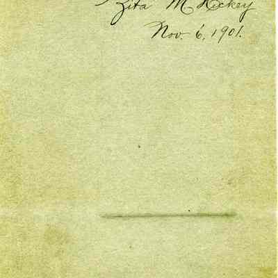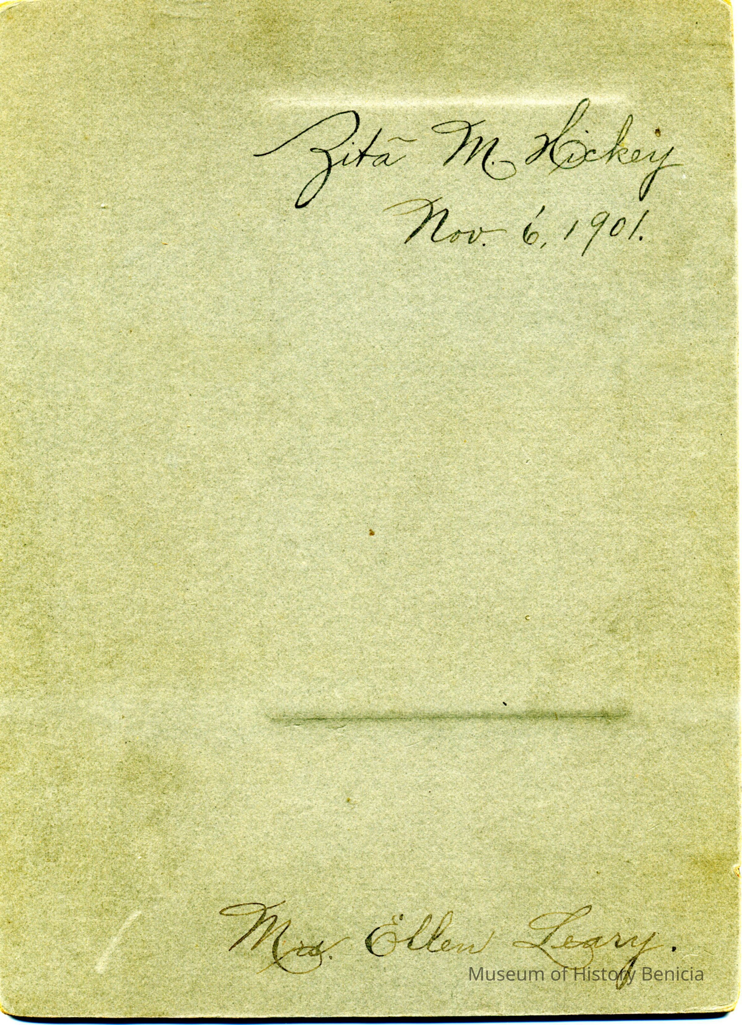 This is a small cabinet card of a woman from the early 1900s. The back says it is Rita M. Hickey and the date taken is 11/06/1901. The photo once belonged to Mrs. Ellen LearyCollection