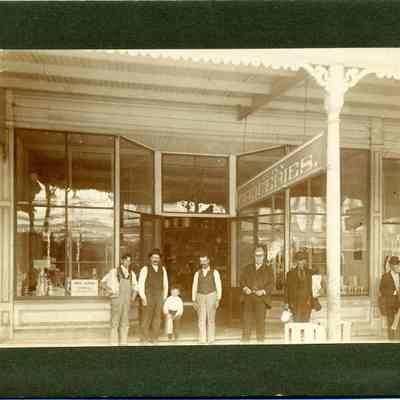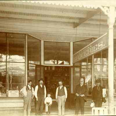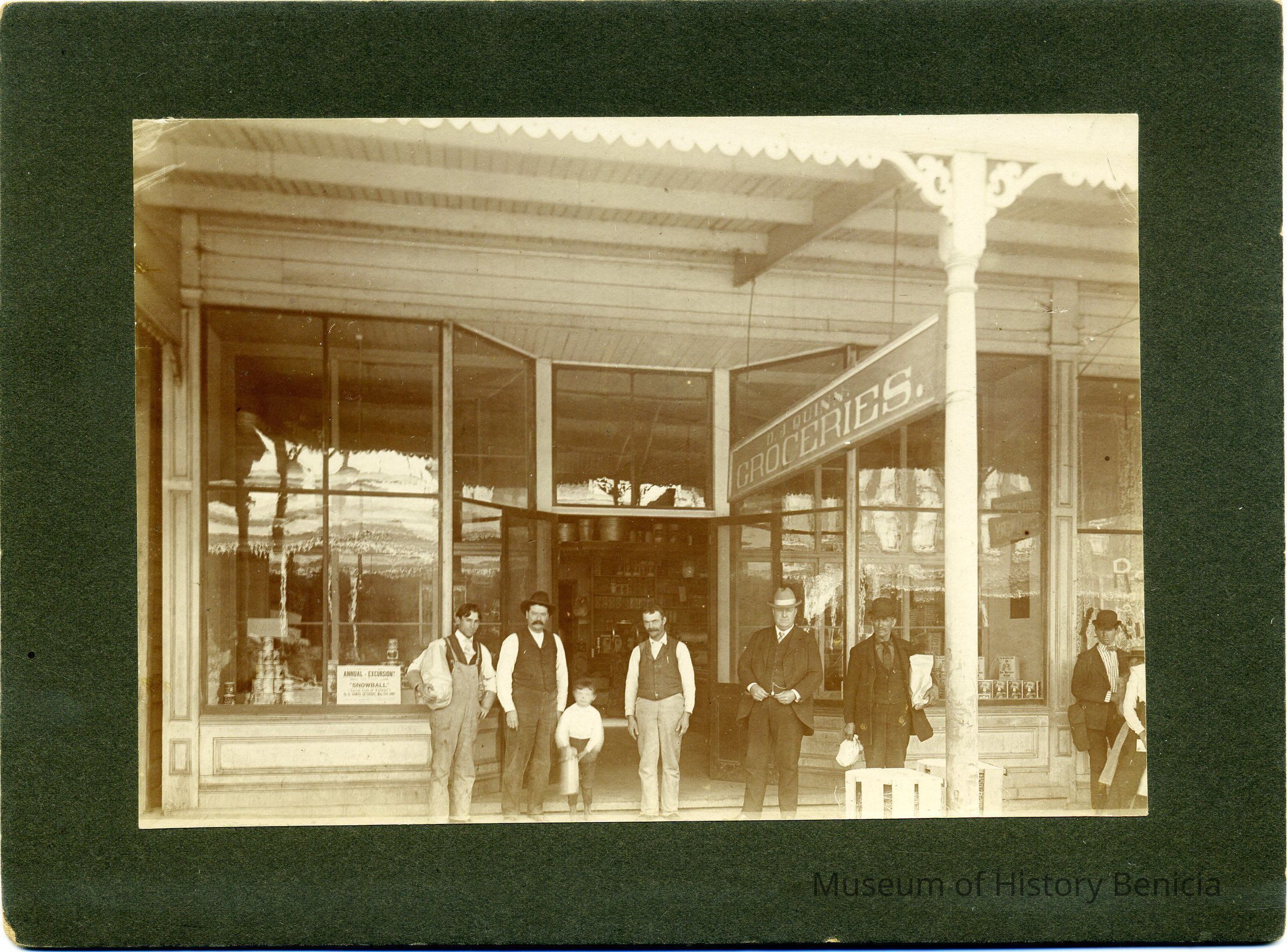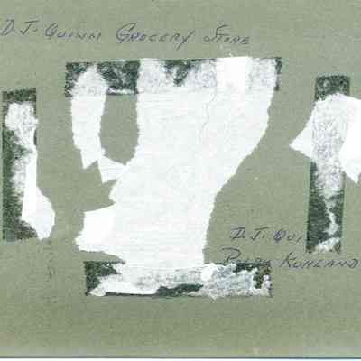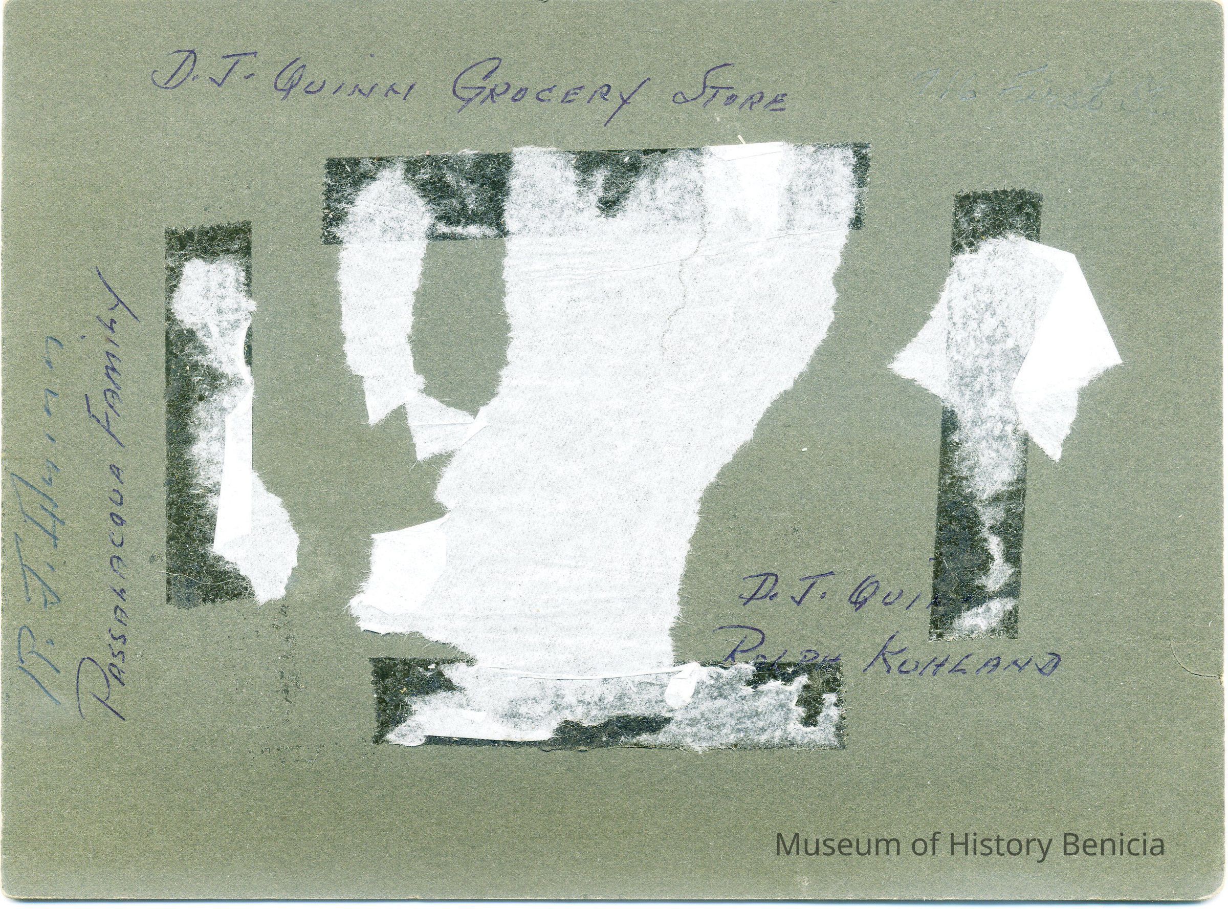 This is a photo of D.J. Quinn's grocery store. Identified on the back is also Ralph Kuhland and the address 716 First Street.