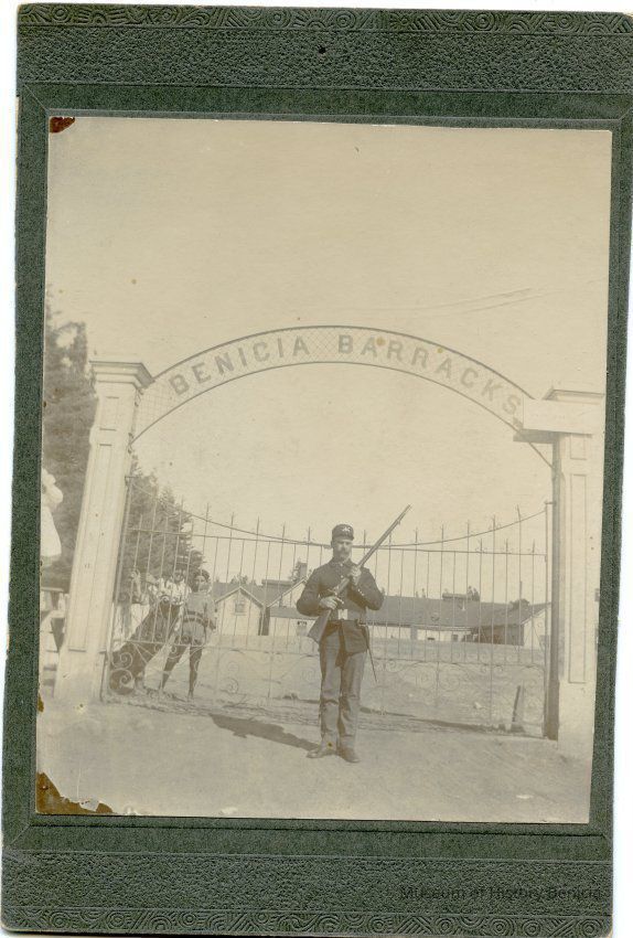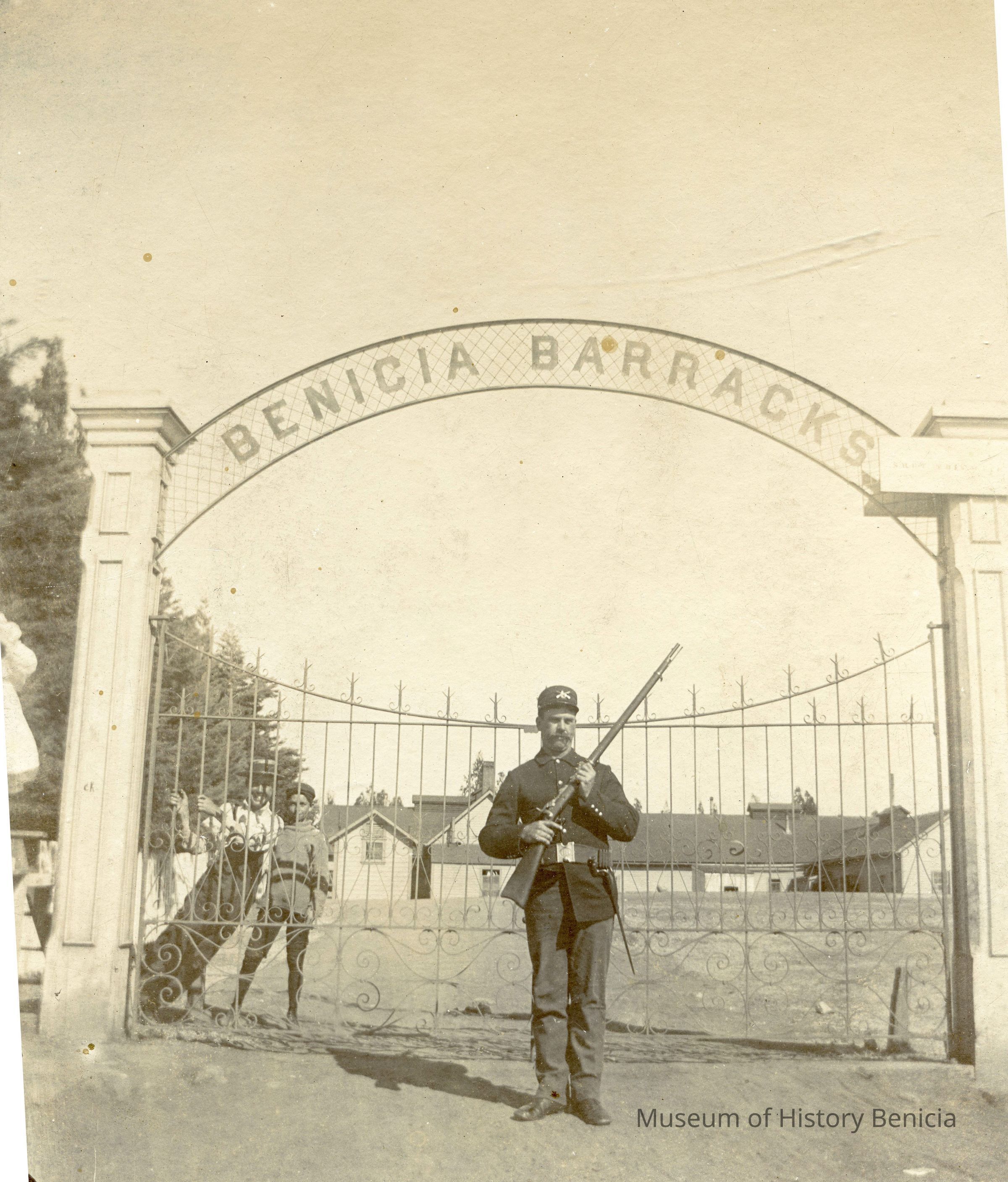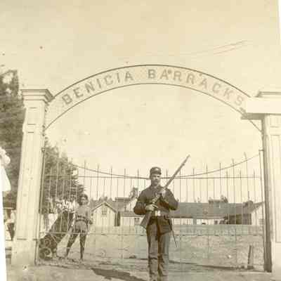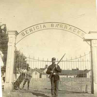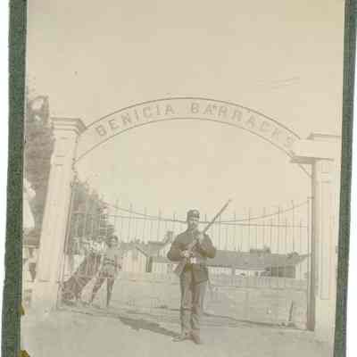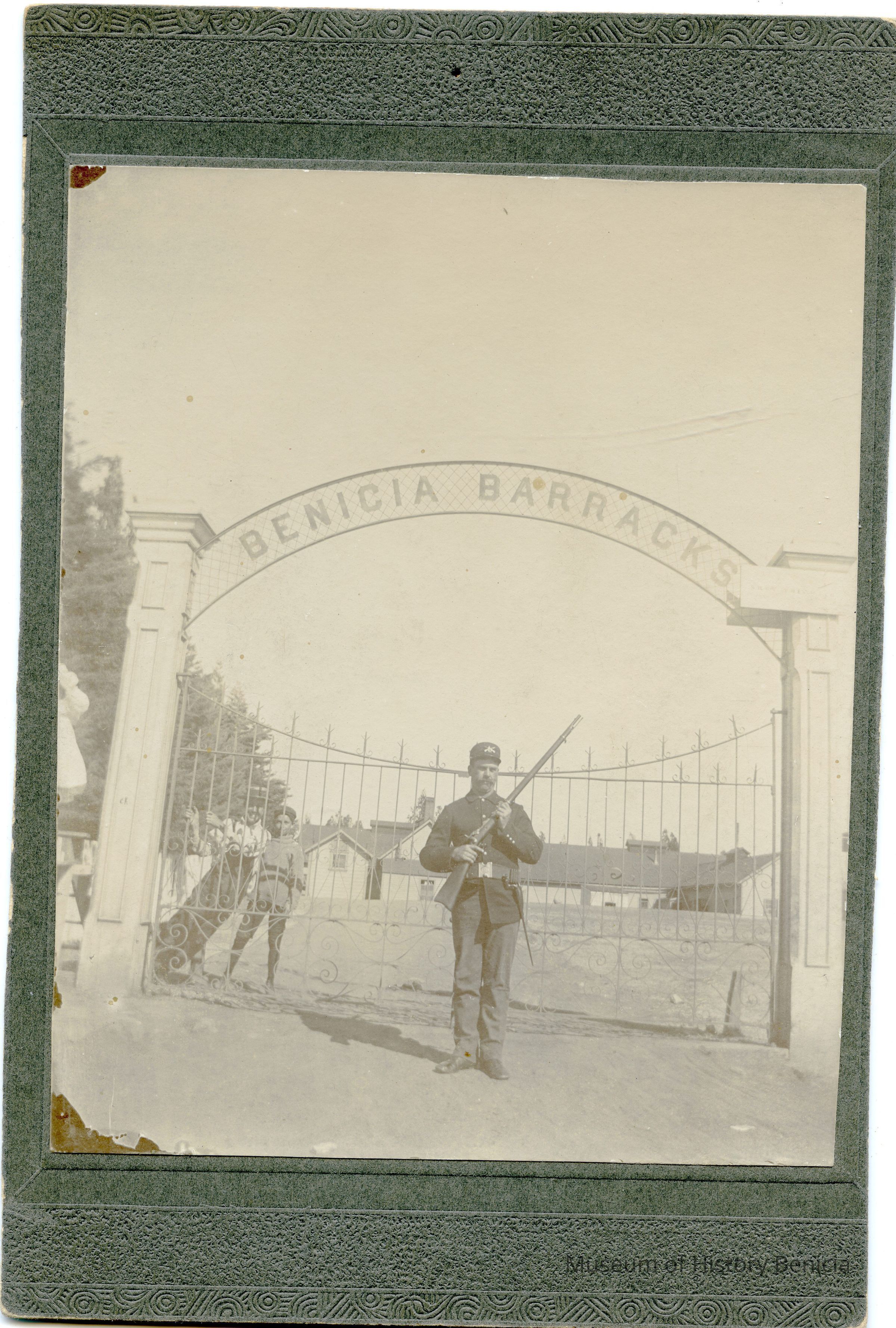 This is a small cabinet card of the Benicia Arsenal main gate in 1897. There is a soldier on duty with his rifle and two young boys in the background behind the fence. There is also an 8" x 10" copy of the photo done by the Army in 1962.Collection