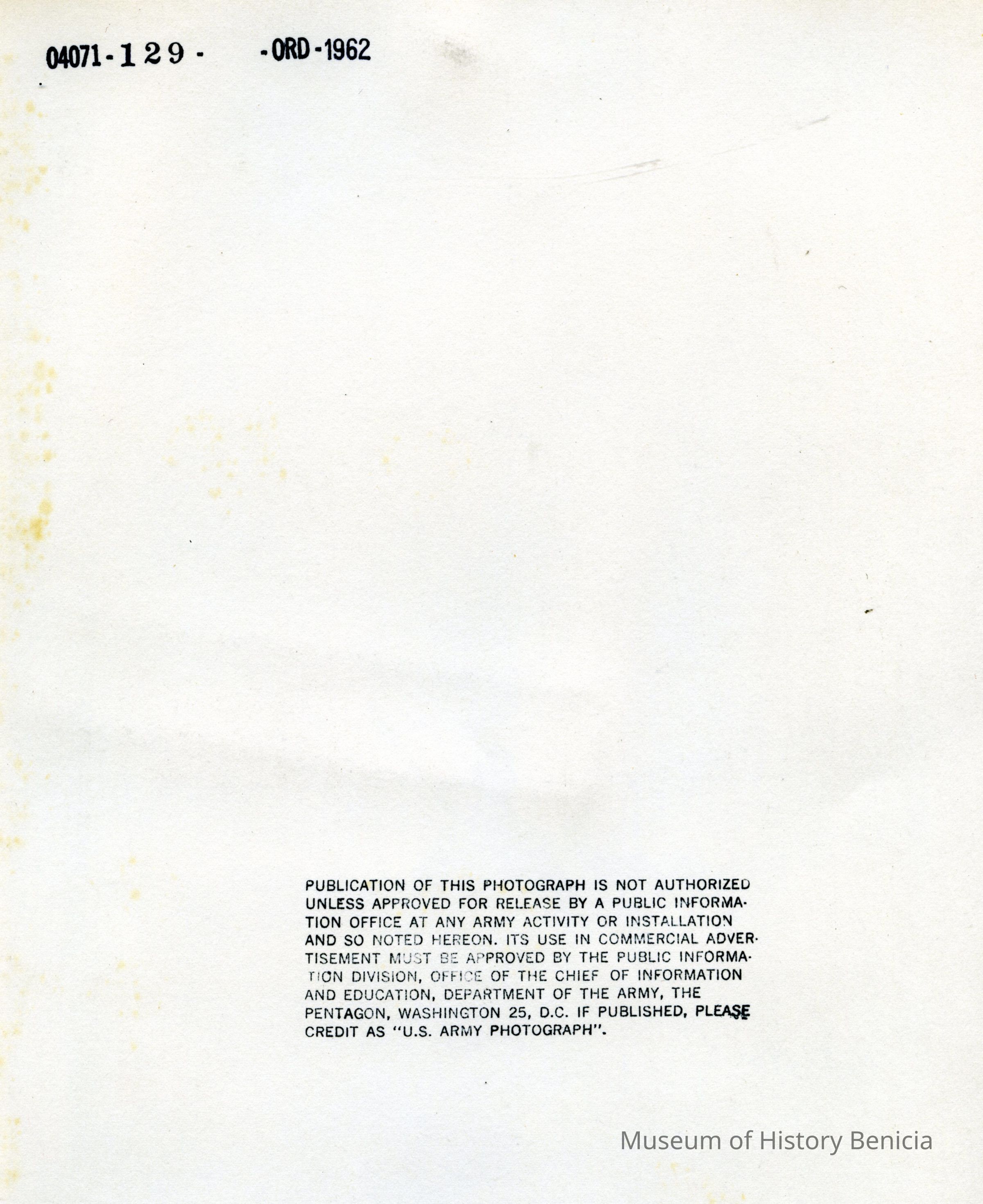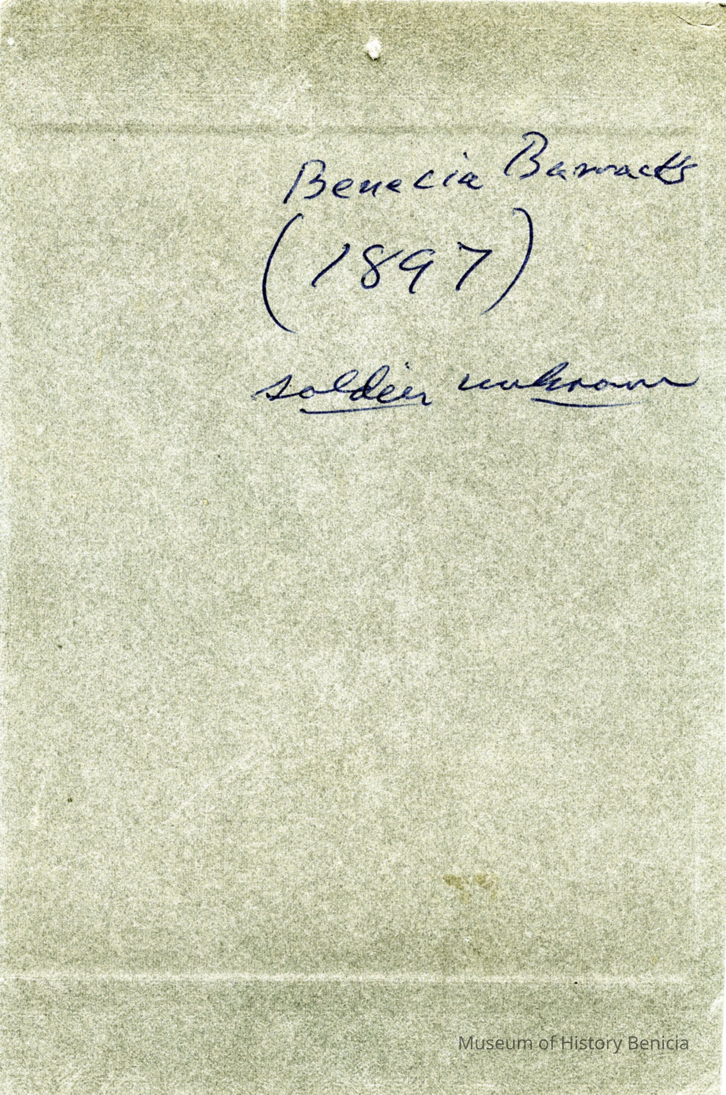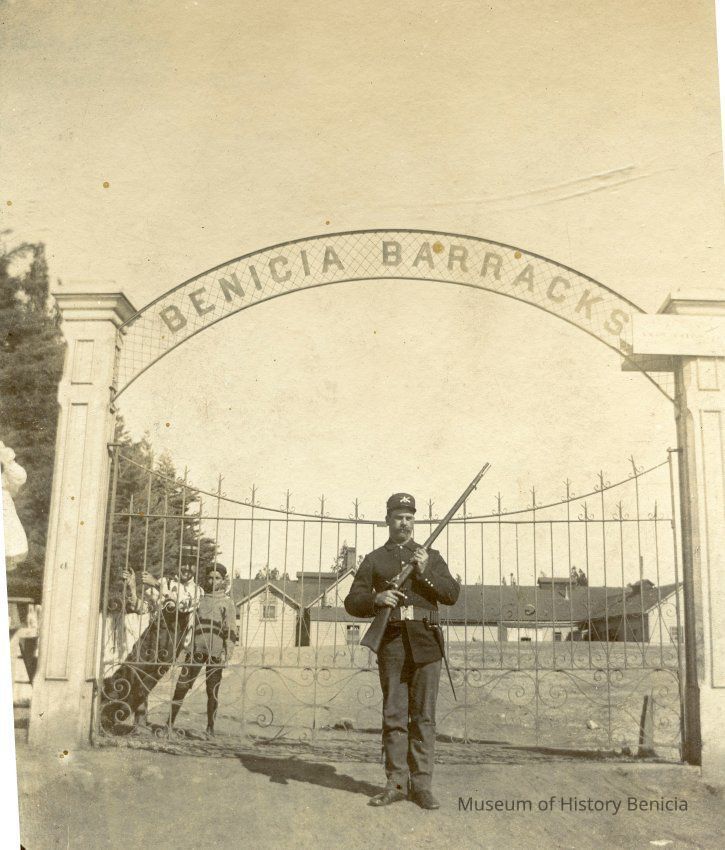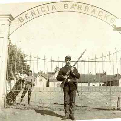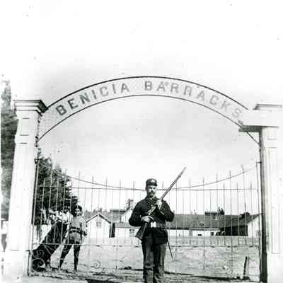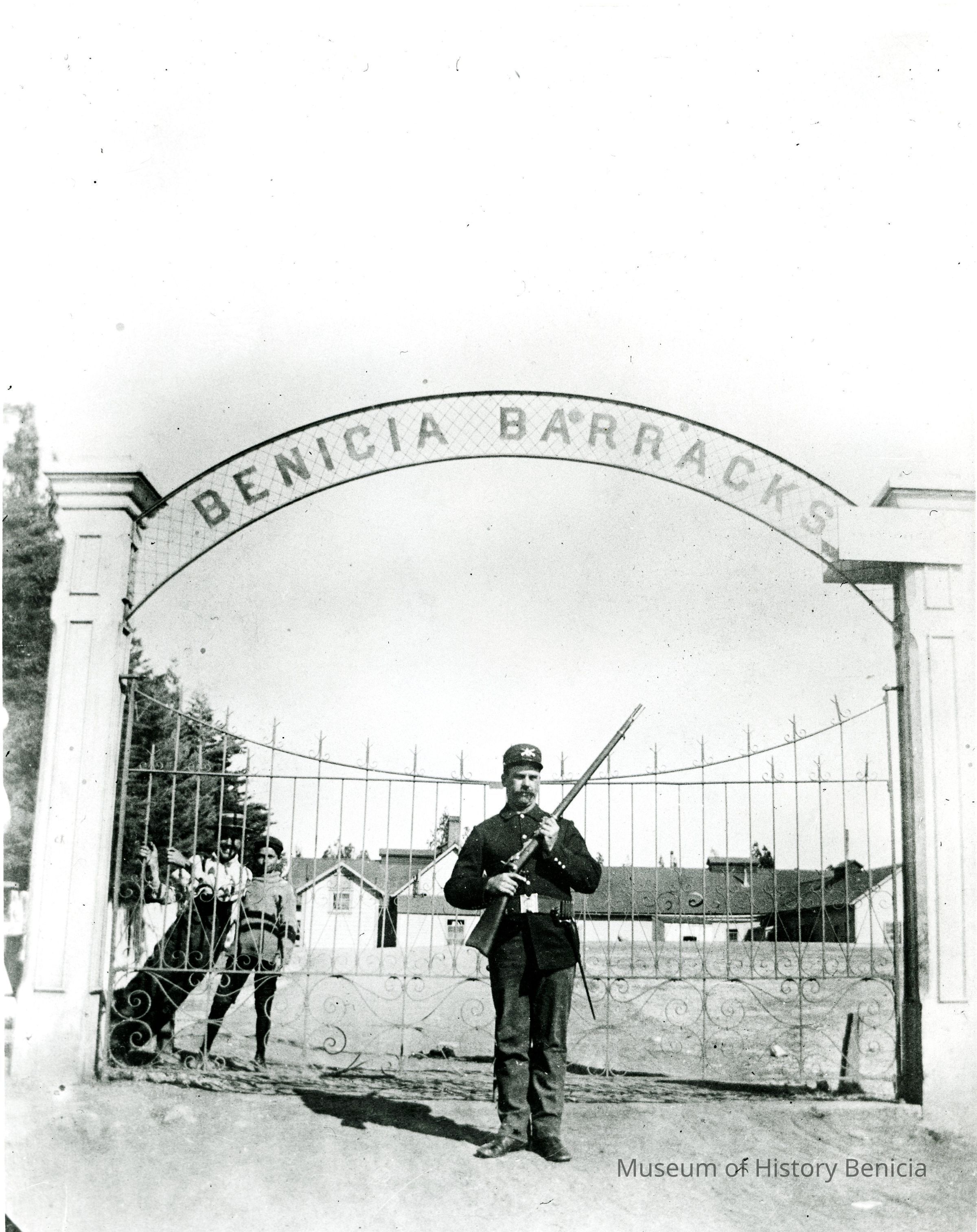 This is a small cabinet card of the Benicia Arsenal main gate in 1897. There is a soldier on duty with his rifle and two young boys in the background behind the fence. There is also an 8" x 10" copy of the photo done by the Army in 1962.Collection