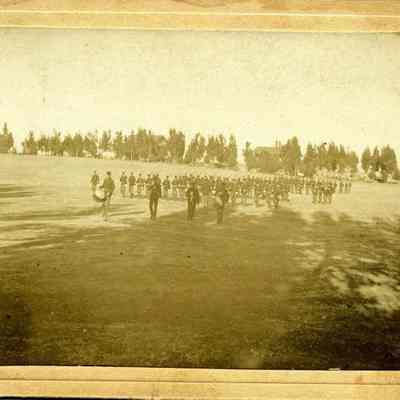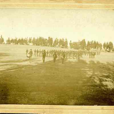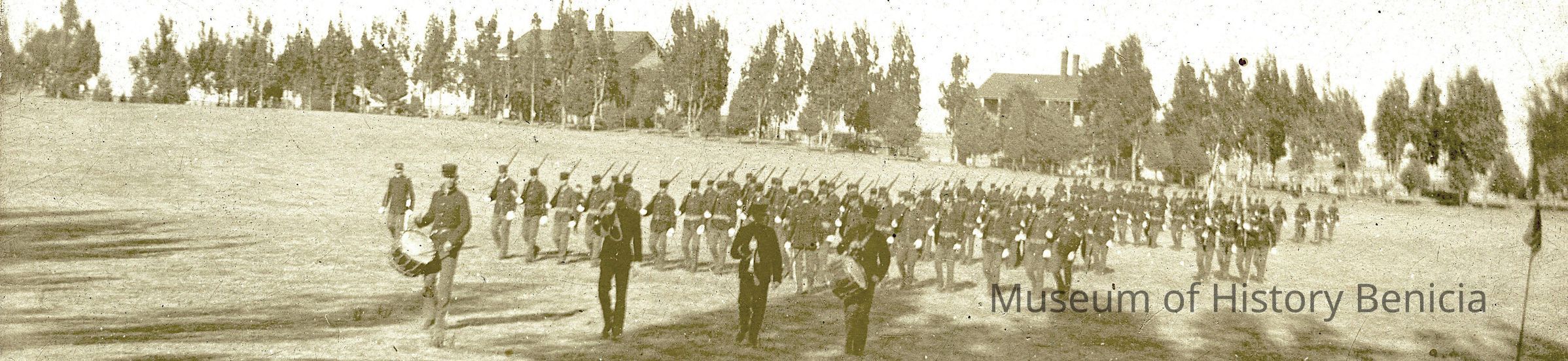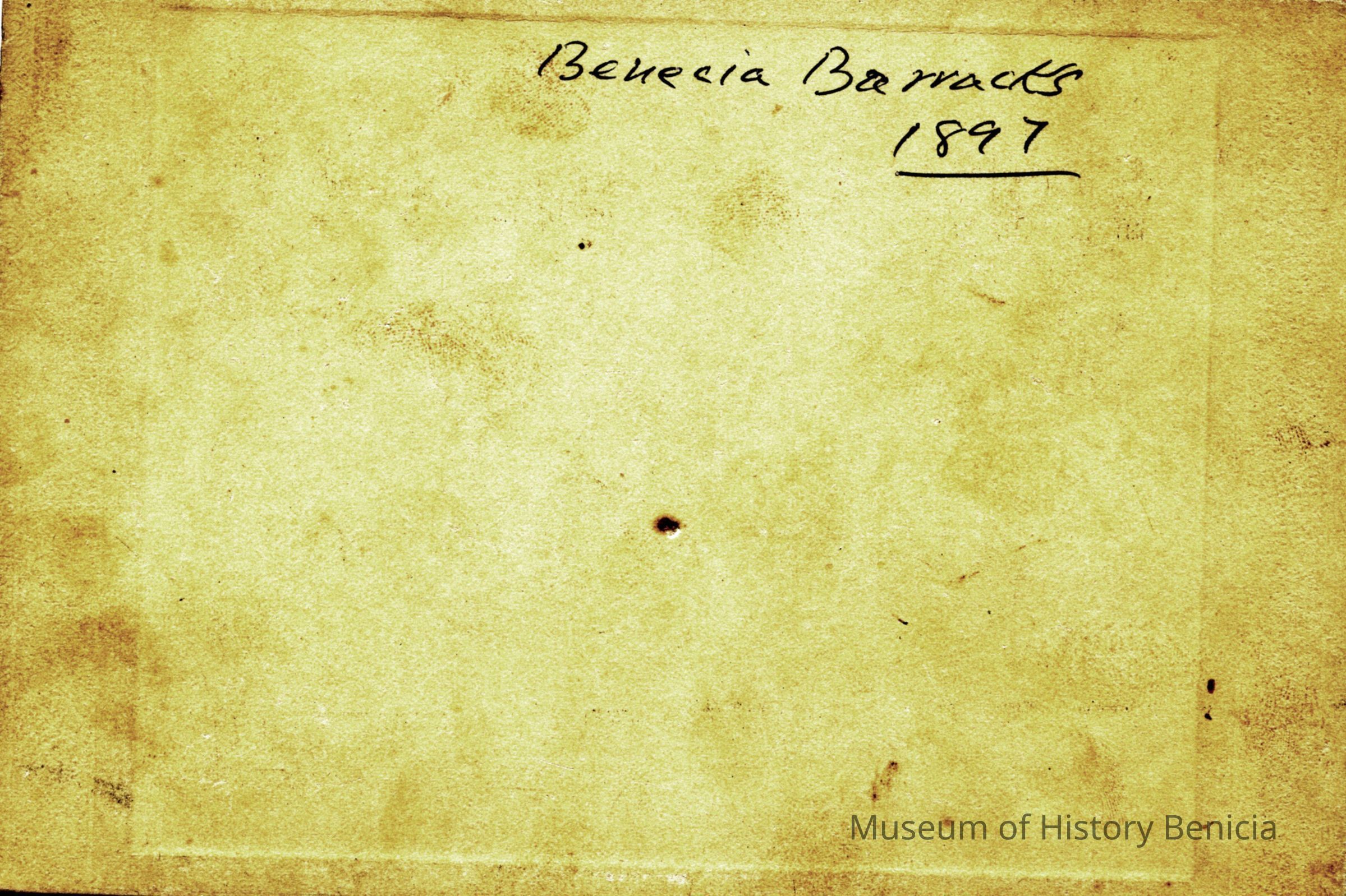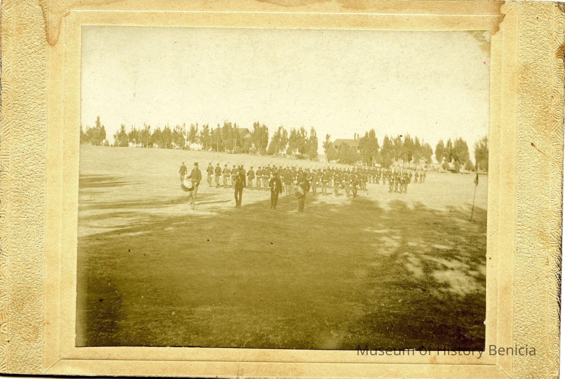 This is a small cabinet card of the Benicia Arsenal parade grounds in 1897. It is very faded but shows a group of soldiers in formation with drum and bugle.Collection