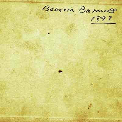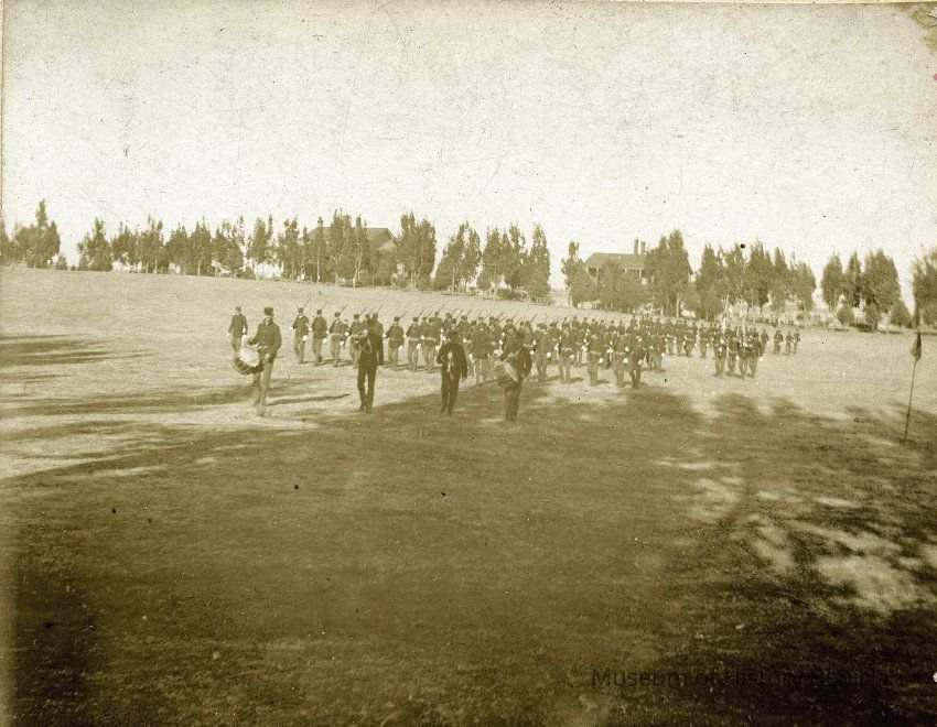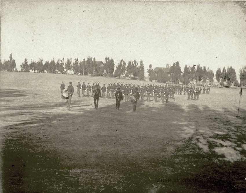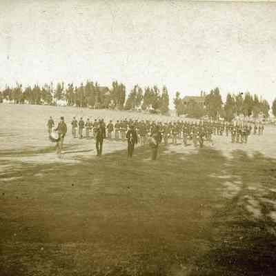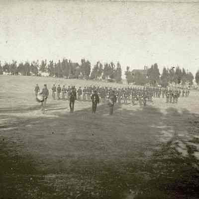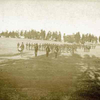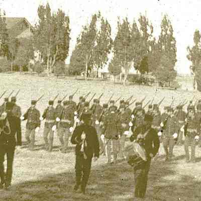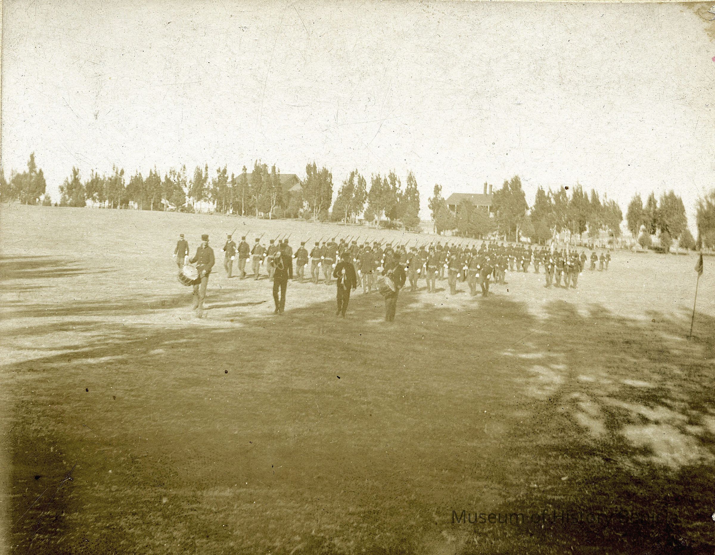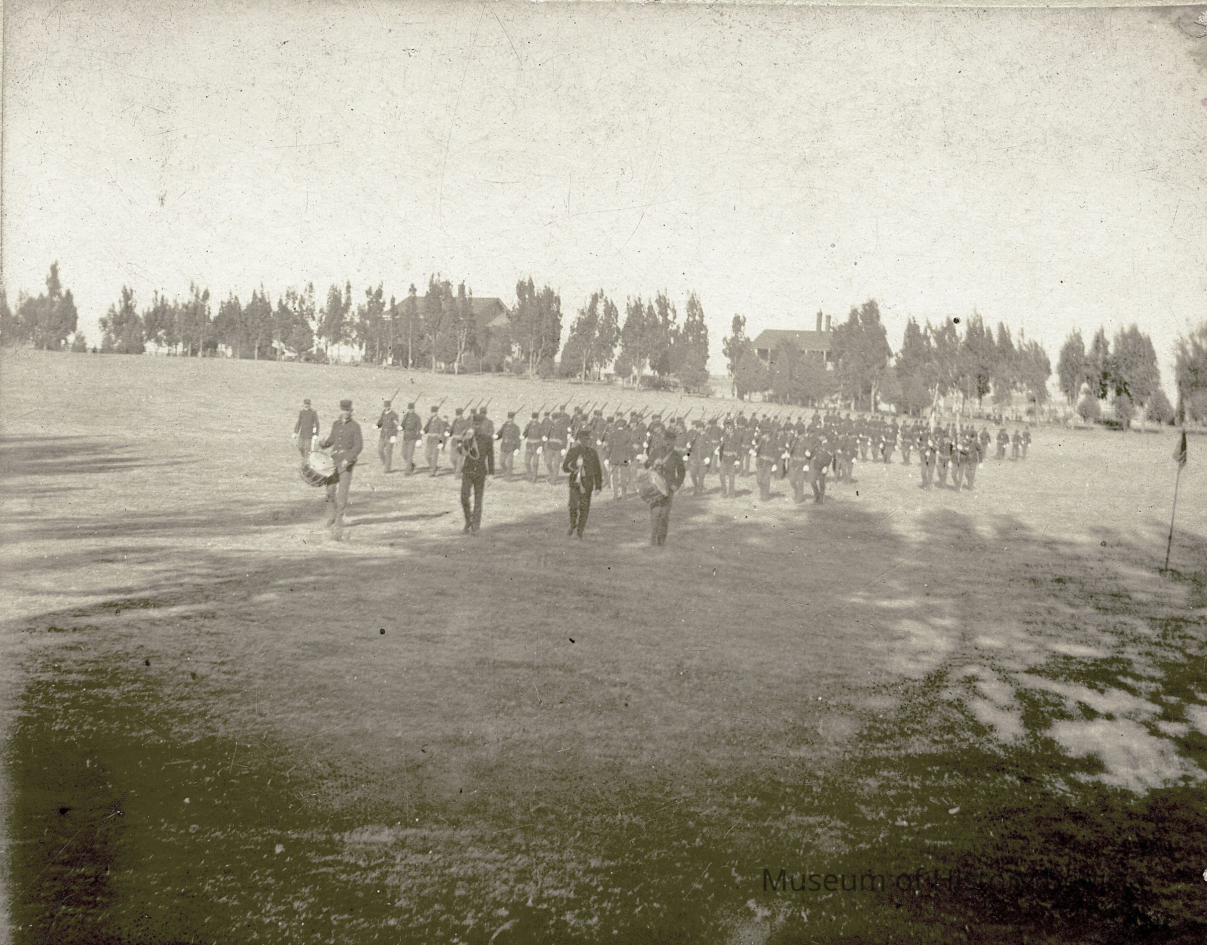 This is a small cabinet card of the Benicia Arsenal parade grounds in 1897. It is very faded but shows a group of soldiers in formation with drum and bugle.Collection