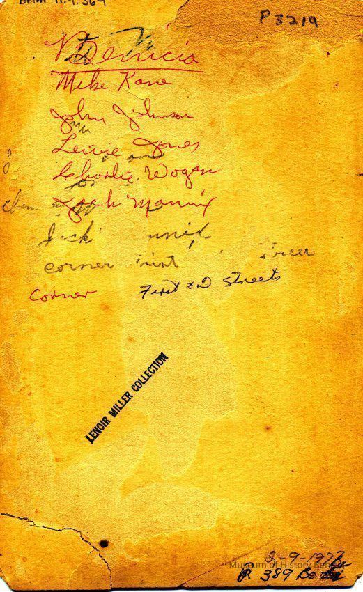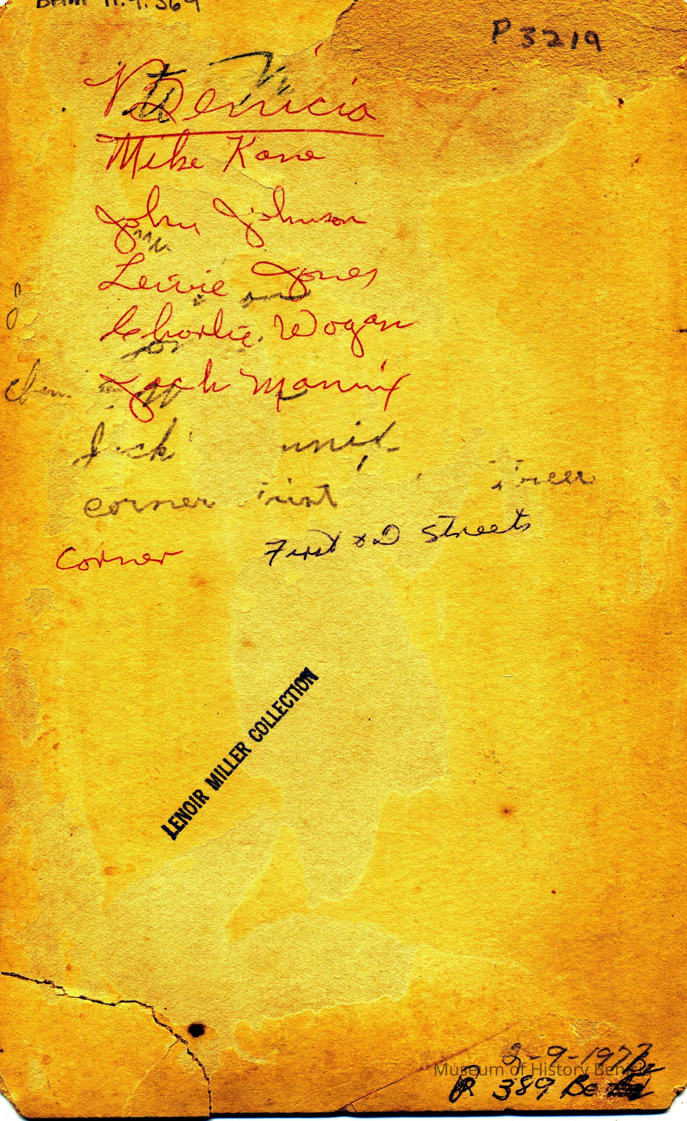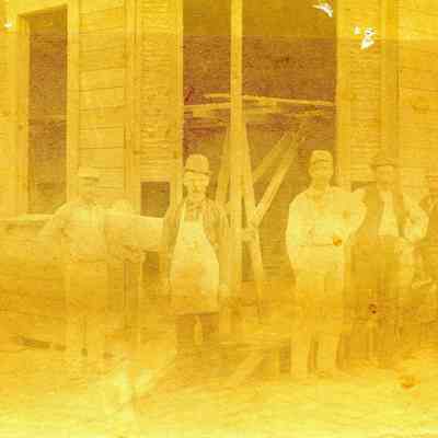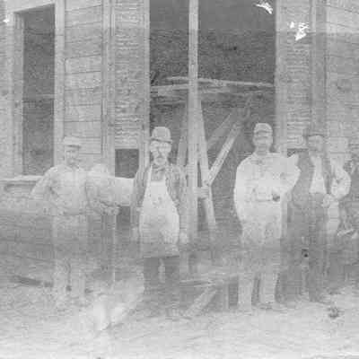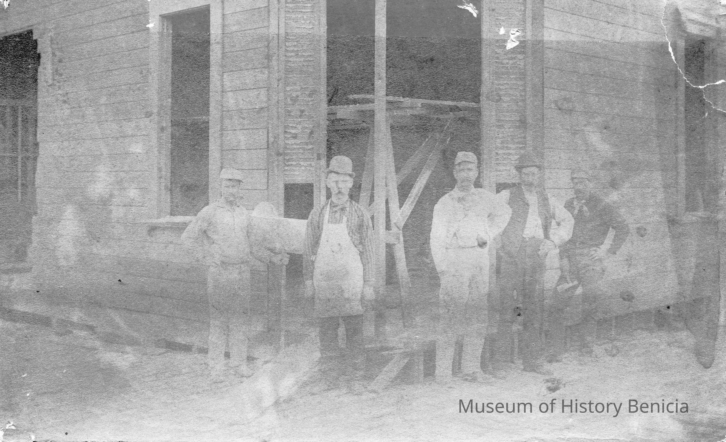 B/W photograph: workers in front of an unfinished building in early Benicia. Names of the workers are on the back: Mike Kane, John Johnson, Leivie Jones, Charlie Wogan, Jack Mannix; and the supposed location of First and D Streets (which corner is not indicated)Collection
