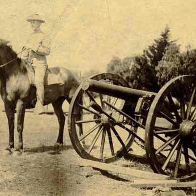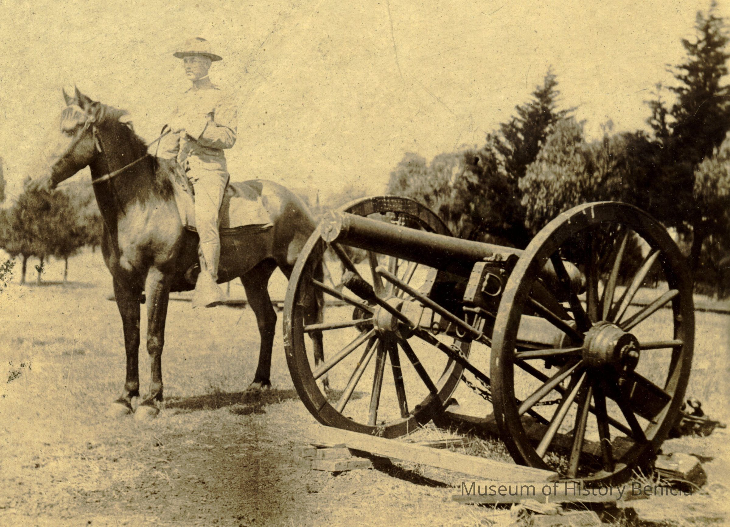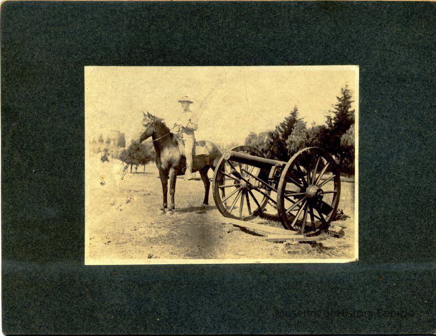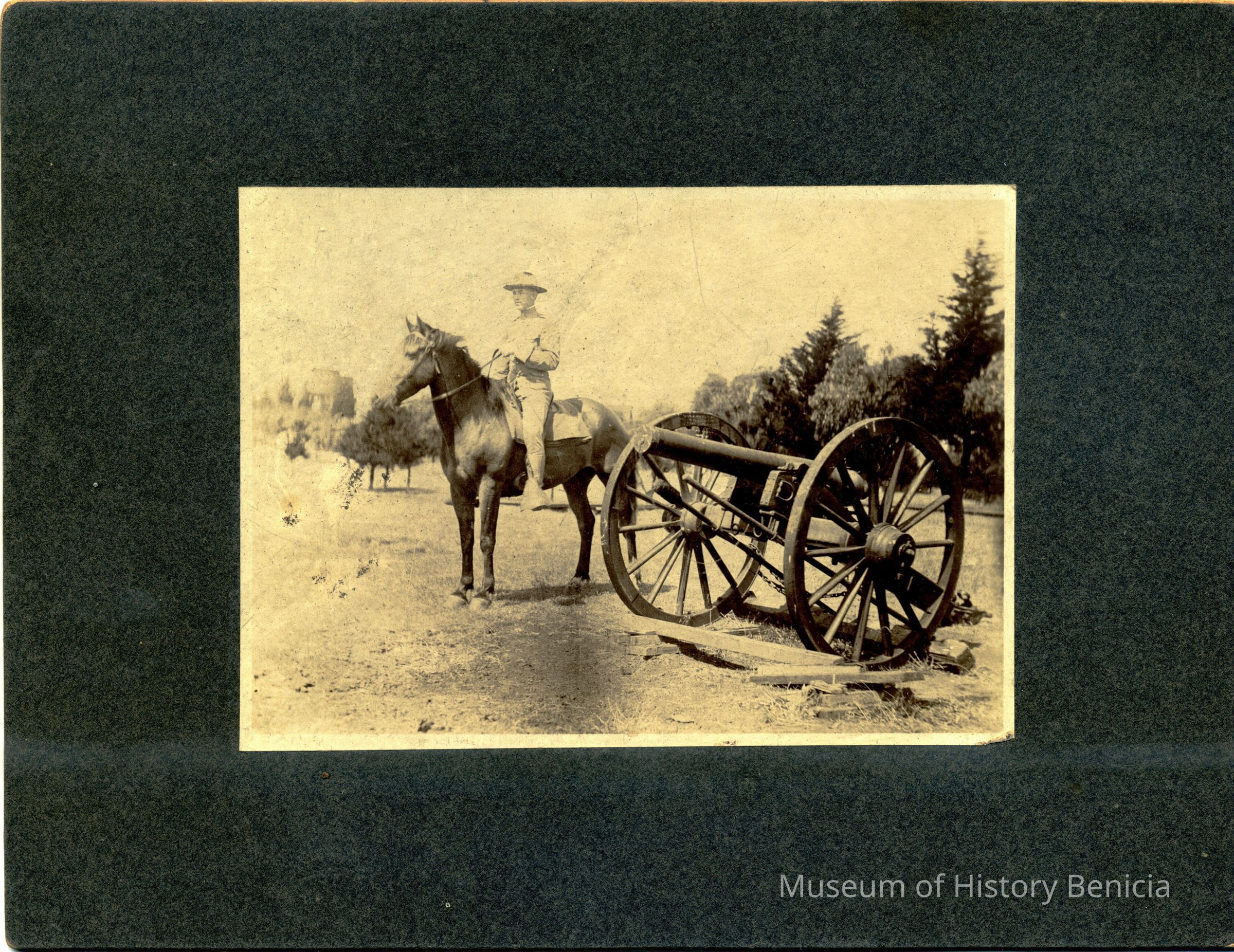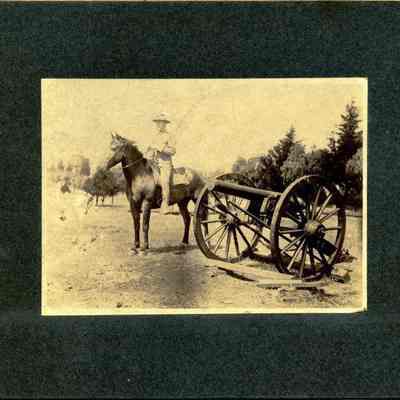 This is a cabinet card of a man on a horse next to a canon. The man is in uniform, possibly WWI. The man is the same man that is in 2021.28.6.6. It looks like Charles Erwin.Collection