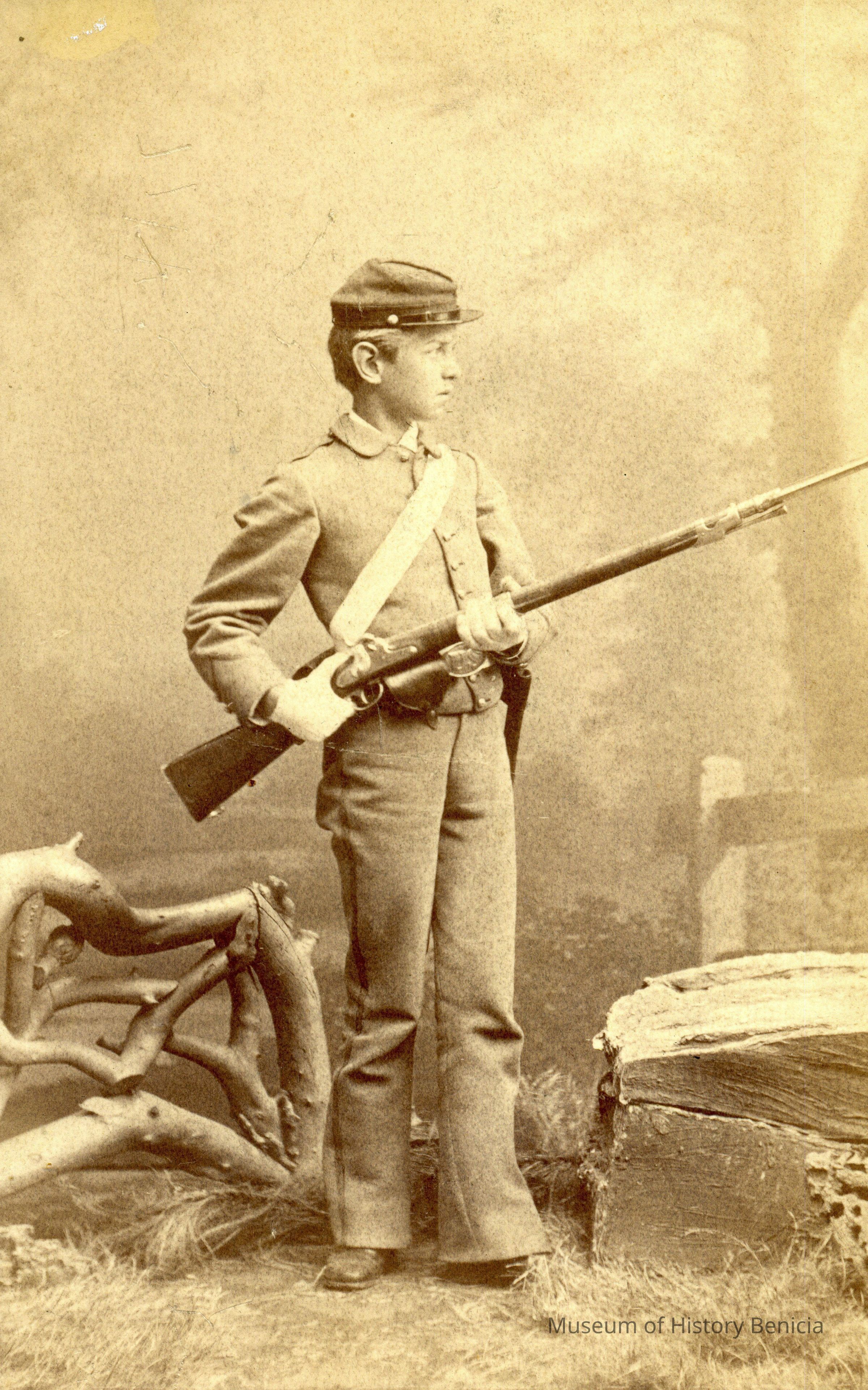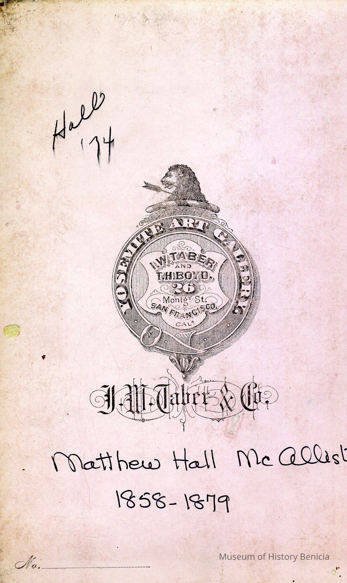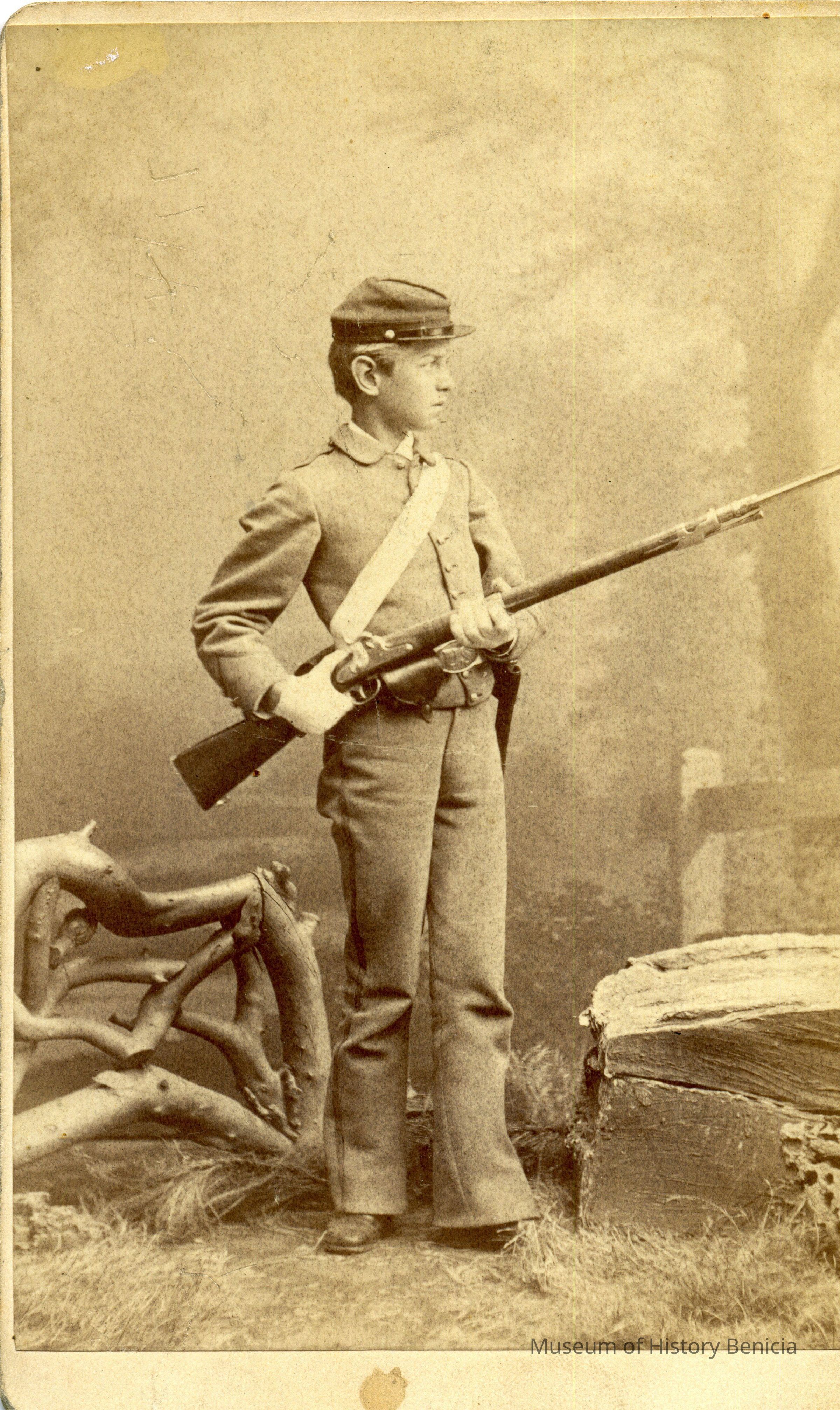 This is a photo Matthew Hall McAllister who was the son of Cutler McAllister who is the brother of Col. Julian McAllister, commanding officer of the Benicia Arsenal. M. Hall McAllister was born in 1861 and died about 1948. The back of this photo gives the dates as 1858 - 1879. These are the dates for Julian McAllister. I believe this is a photo of Matthew not julian and that the dates were added later and are incorrect.Collection