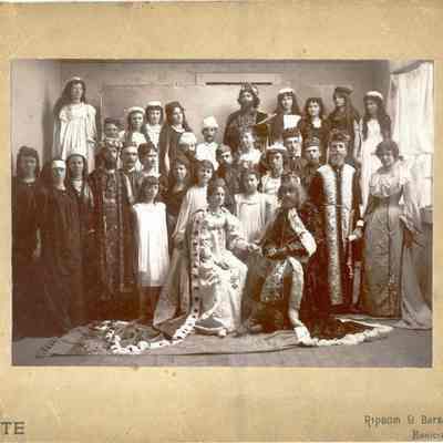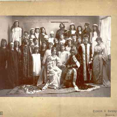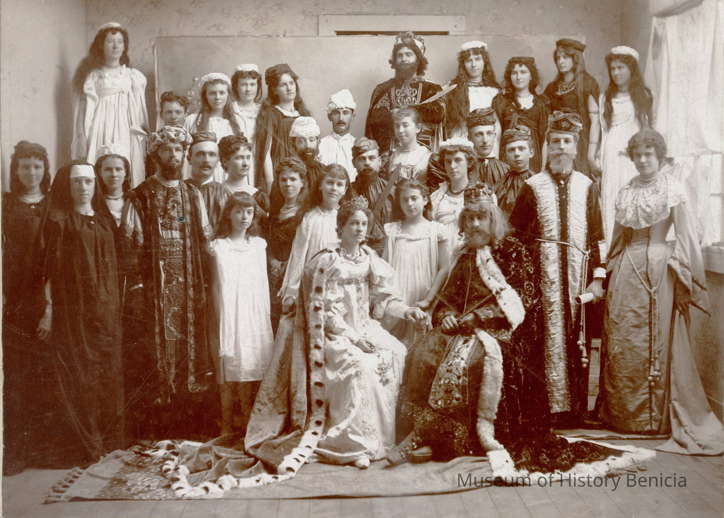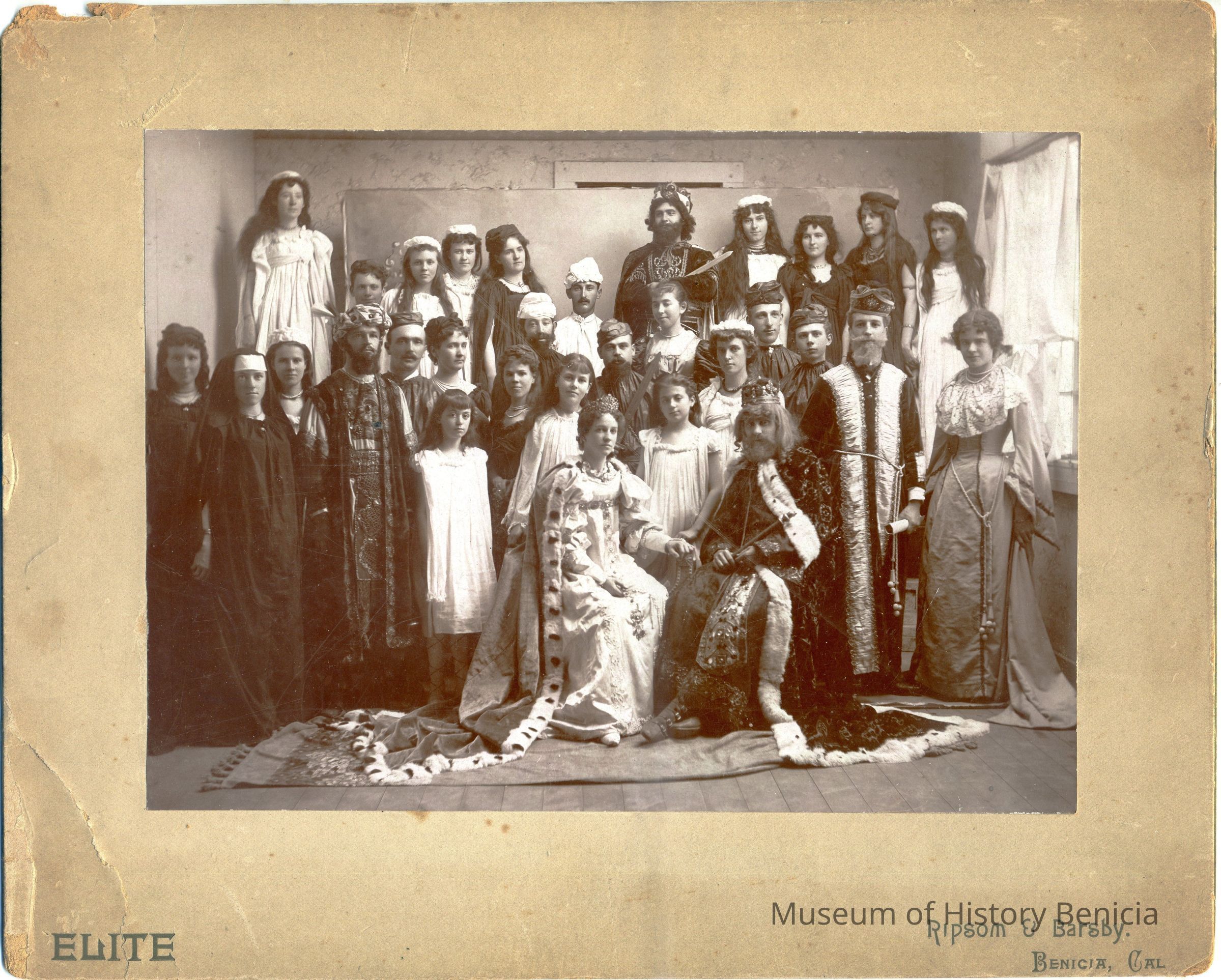 This is a photograph of the Benicia Opera company. Not sure of the date and only a few people are identified on the back. The players are in costume. On the back only Godfrey Rueger Jr., Zoe Durner, Rose Durner, Freida Rueger, and Oliver Gerrish are mentioned.Collection