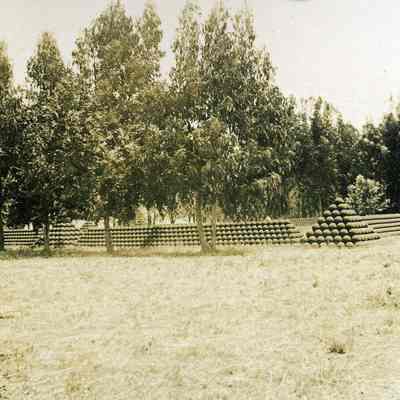 This photo shows stacks of cannonballs in a field.Collection