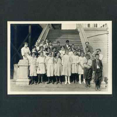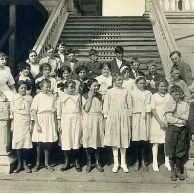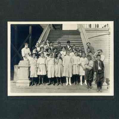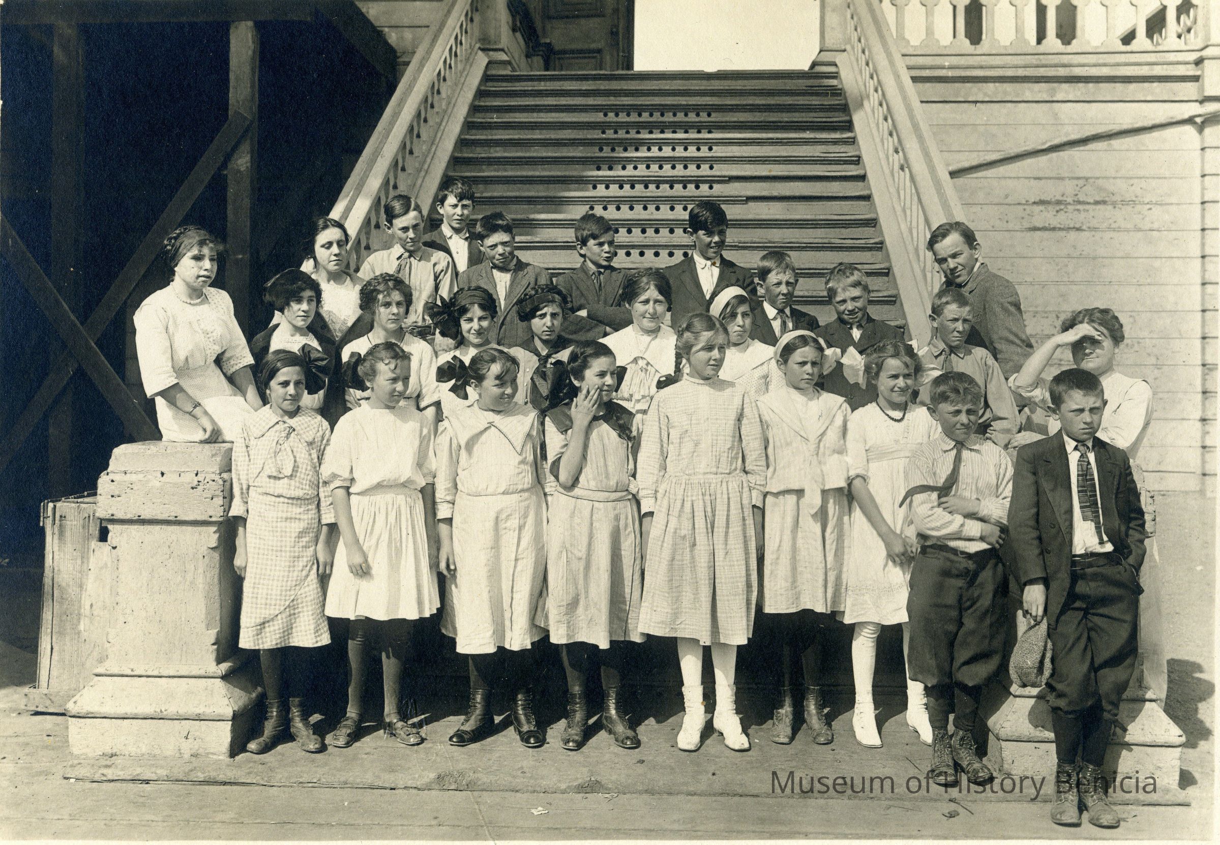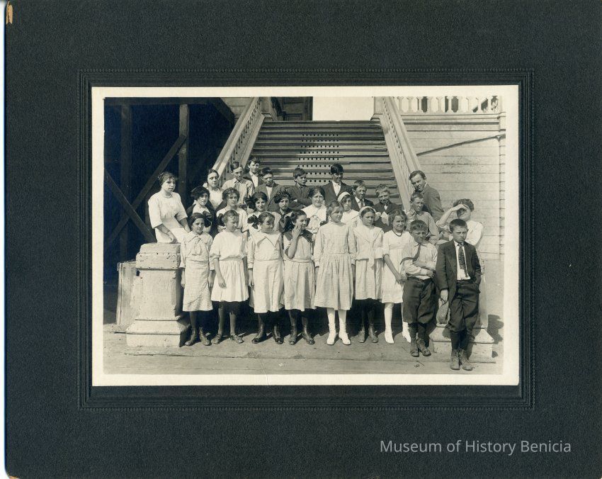 Benicia class photo taken in the 1900s. The photo was taken on the steps of the grammar school in Benicia. The name Emily Christensen is written on the back. Emily was the sister of Anna Christensen Pine who was City Clerk in Benicia for years.Collection