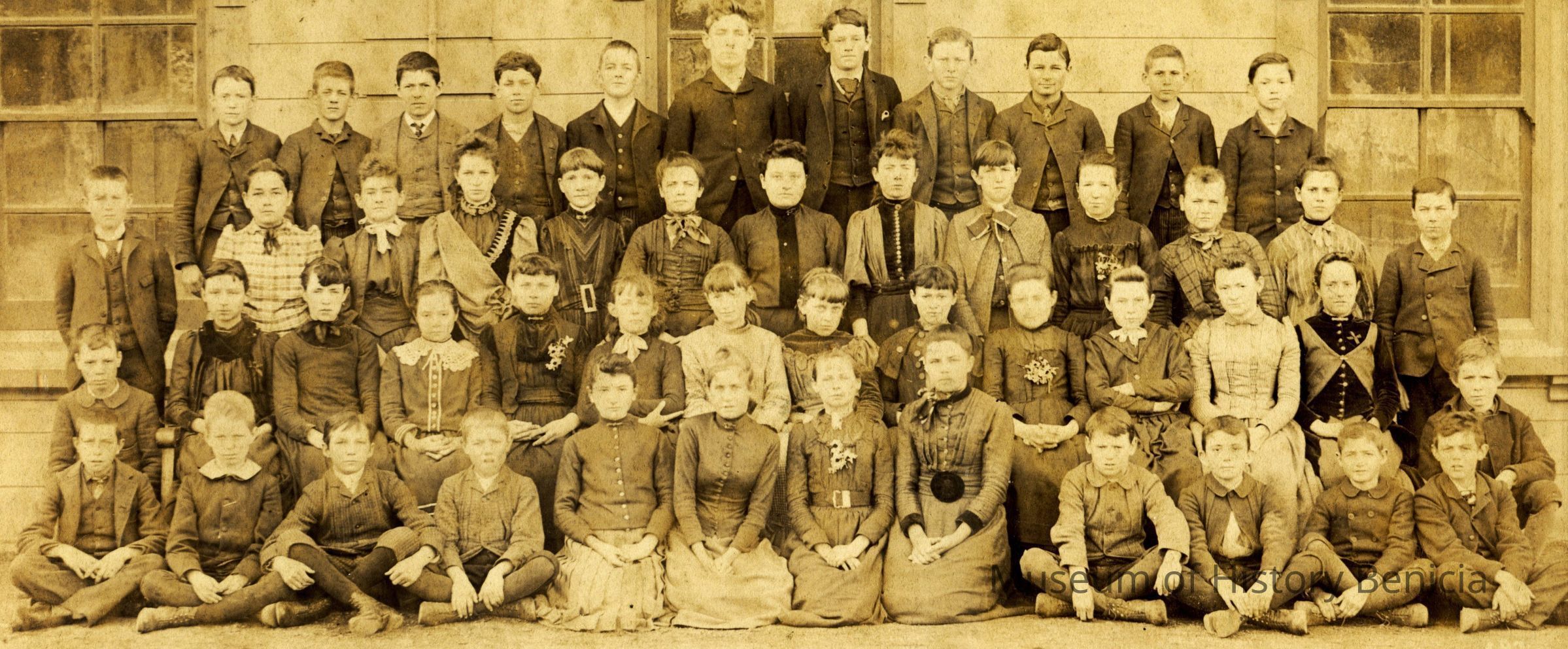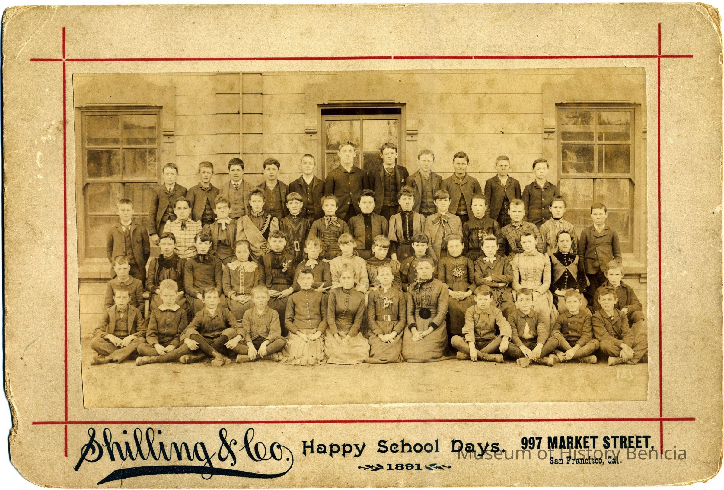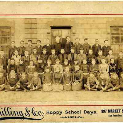 This is a photograph of a Benicia school class taken in 1891 at the old grammar school. (The window trim matches the trim in other class photos taken about this time - 1999.100.0010 from 1909.)