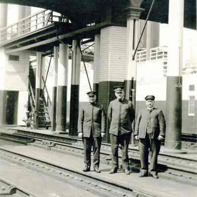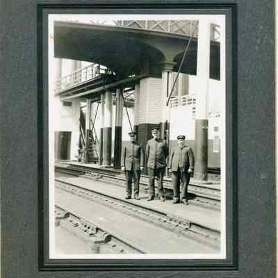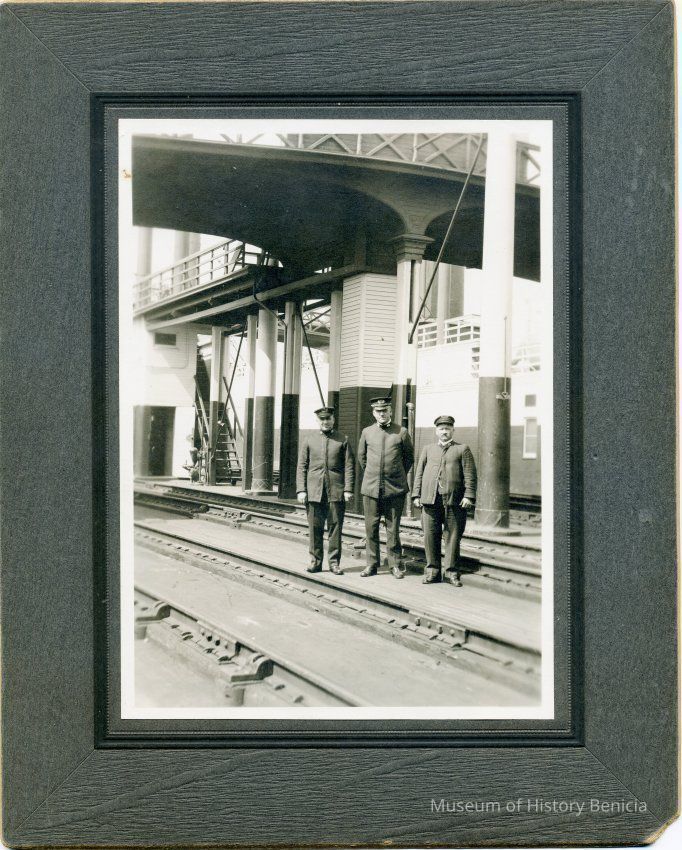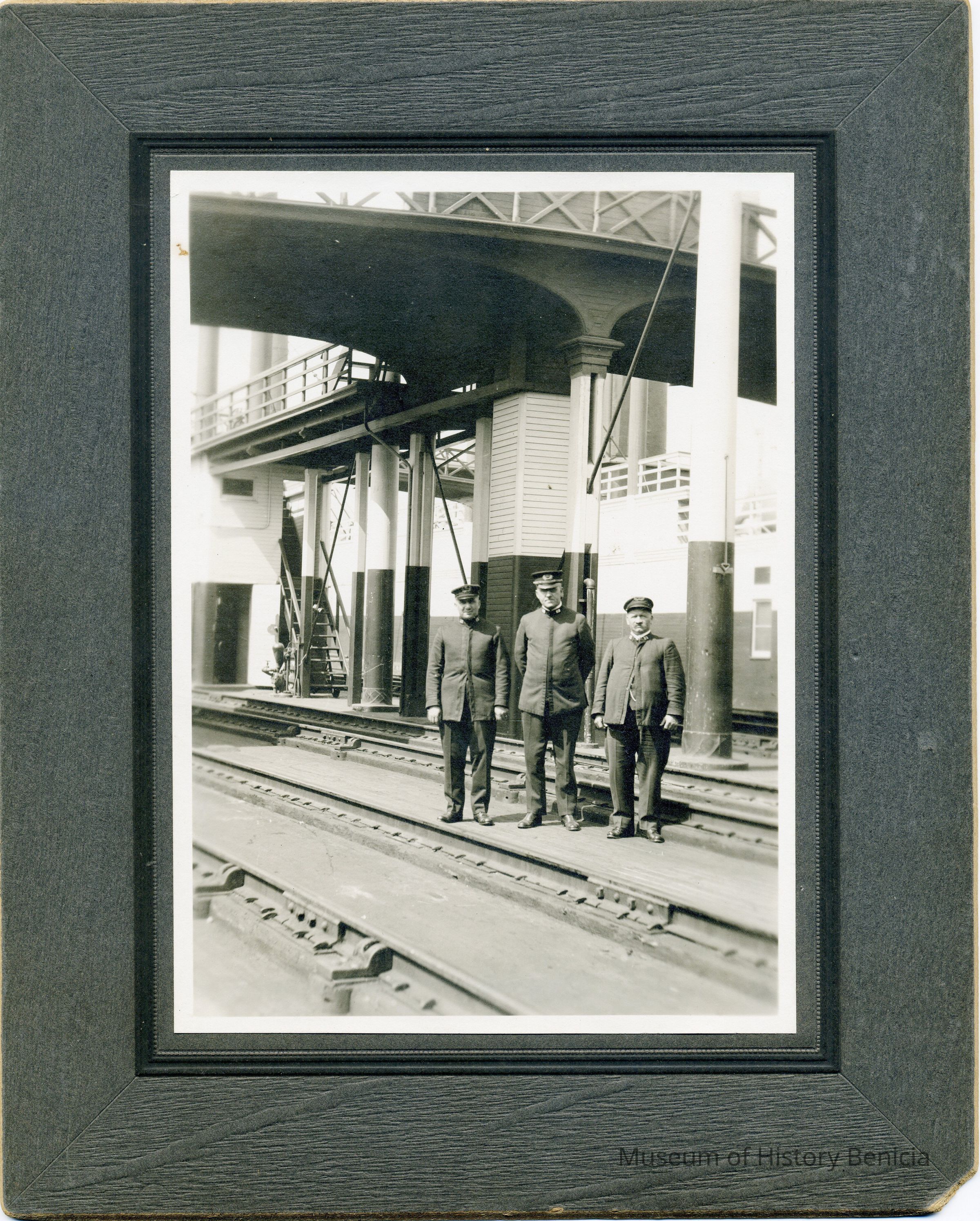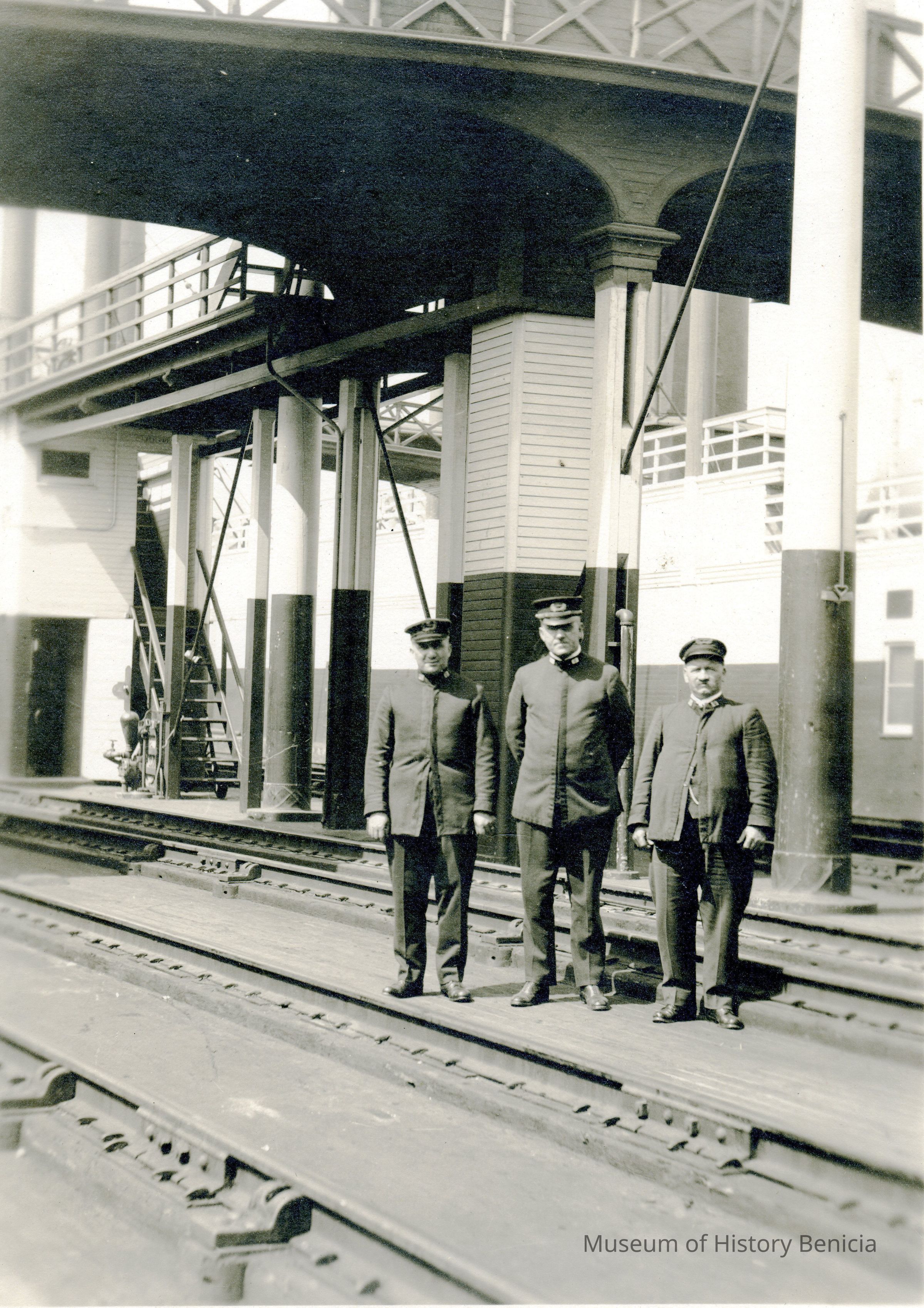 This is a photograph of three conductors from the Benicia Ferry standing on the railroad tracks leading to the ferry. The back says the photo is the property of Mary G Casey 157 East "G" St. Benicia.Collection