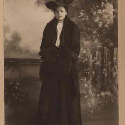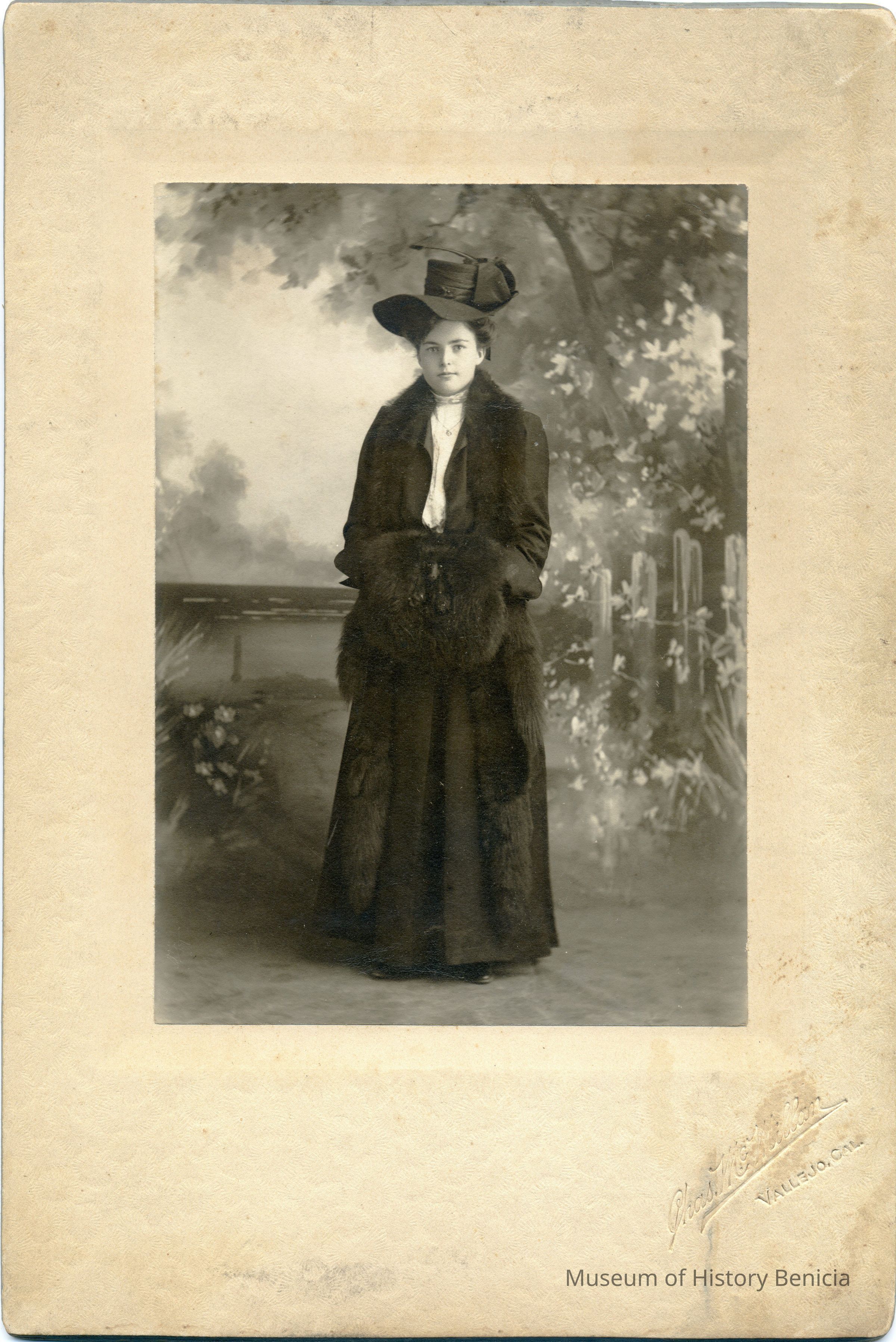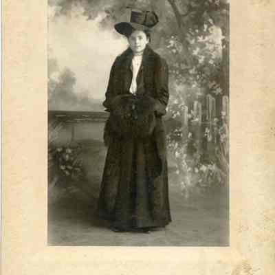 shows a young woman in a dark coat and hat with a fur muff standing in front of a painted backdropCollection