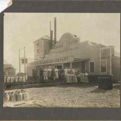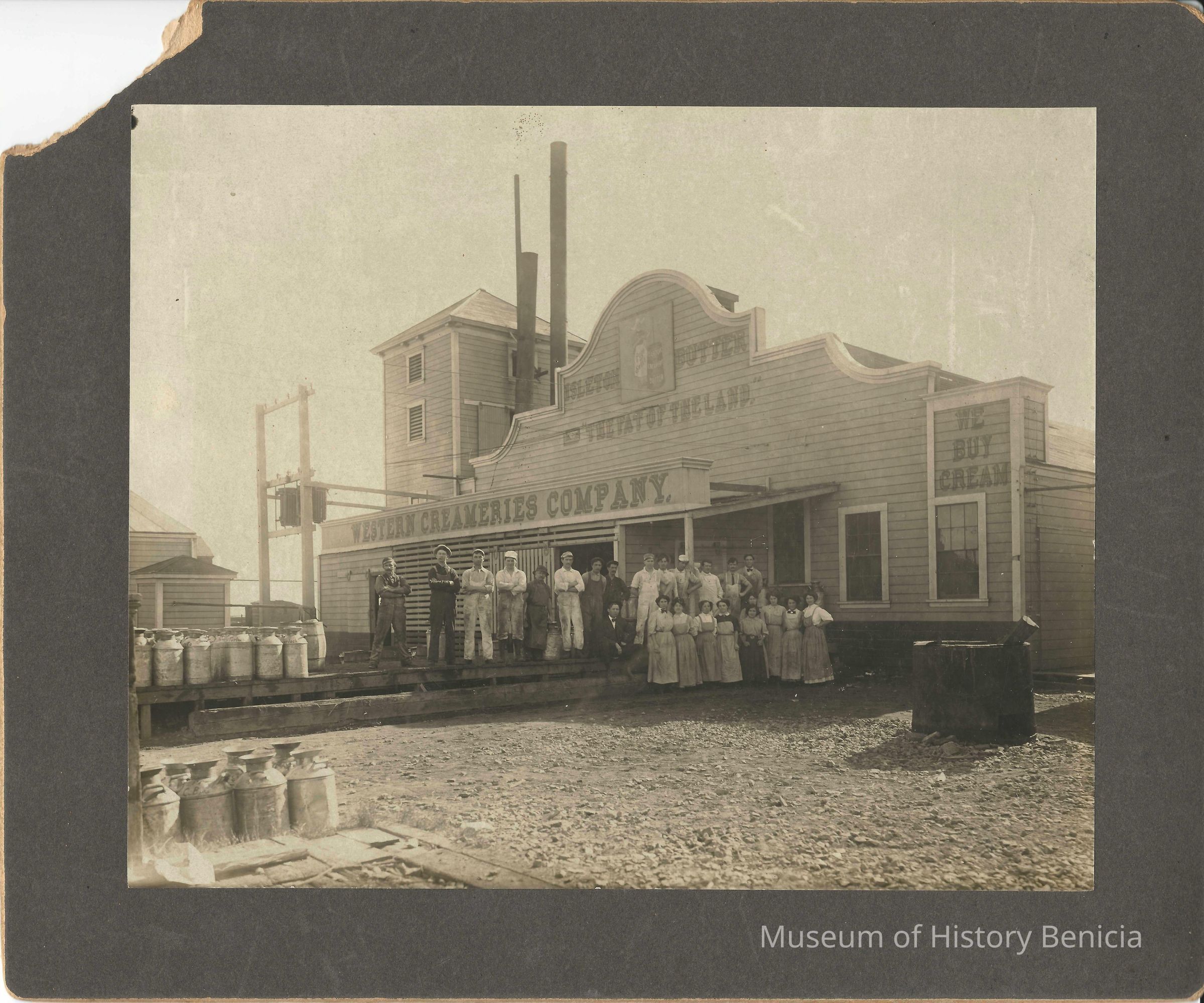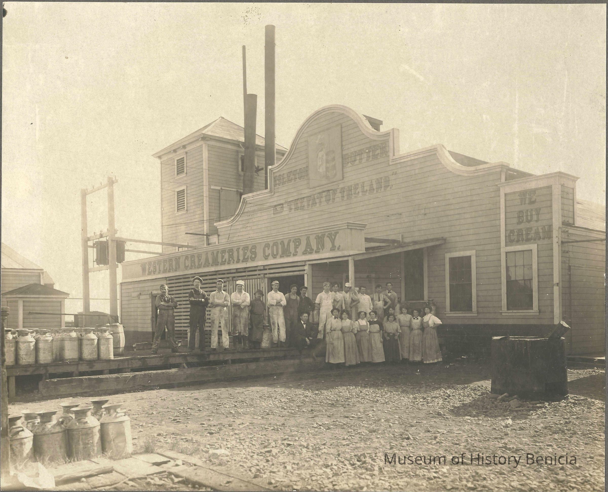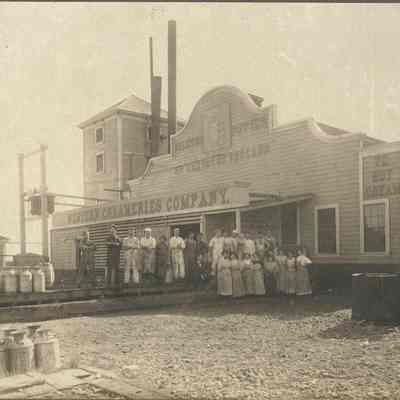 Employees of Western Creamery standing in front of the creamery. B/W photo.