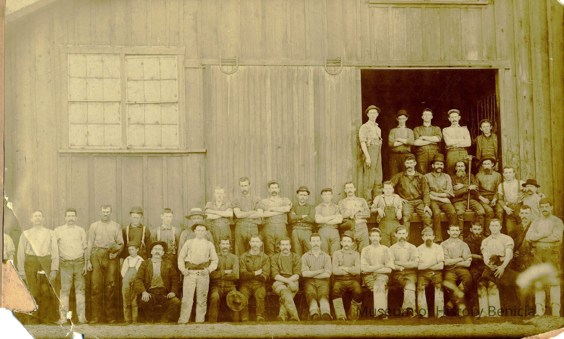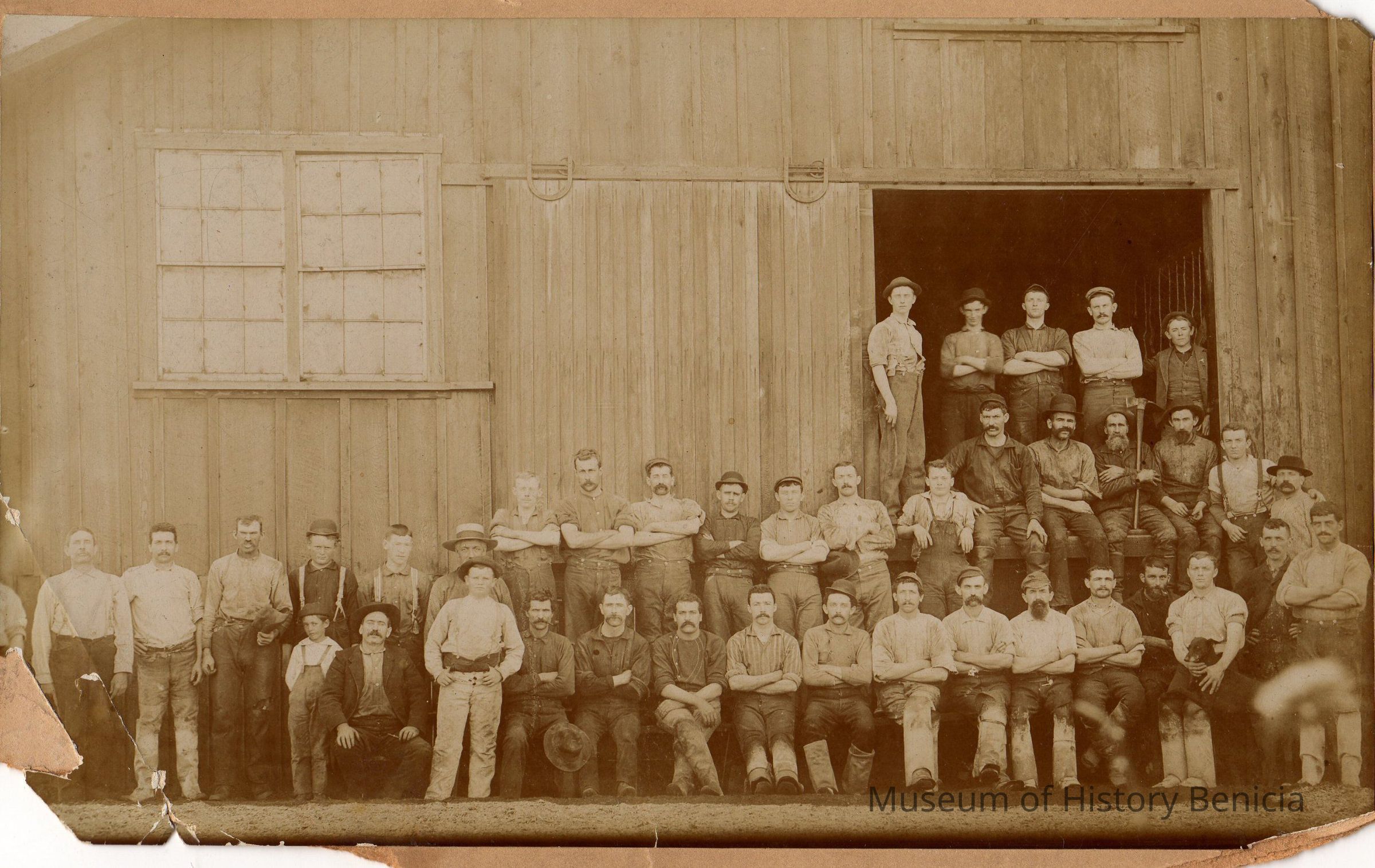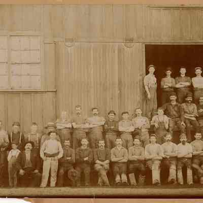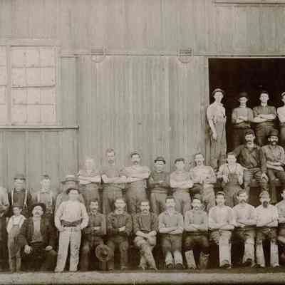 Black and white photo of tannery workers in front of tannery.
