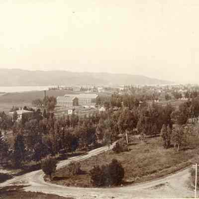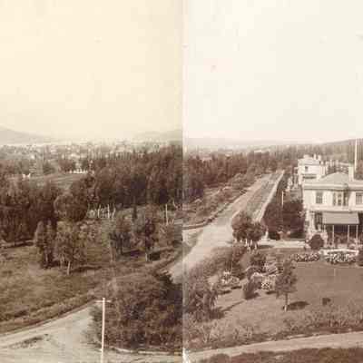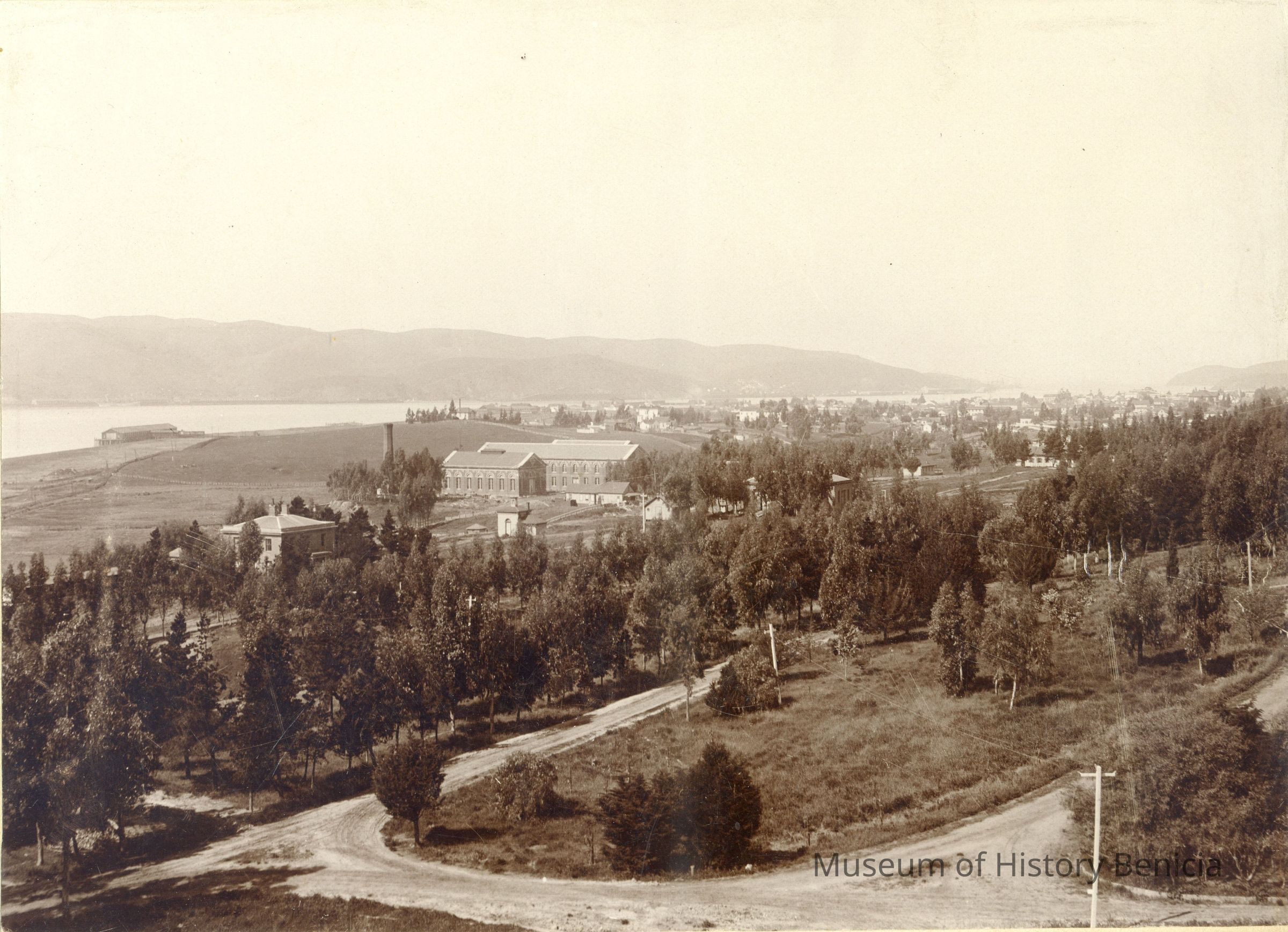 This is half of a cabinet card of Benicia. It shows the shops in the Arsenal and the Carquinez Straits towards the Silver Gate. The two halves are being accessioned separately.