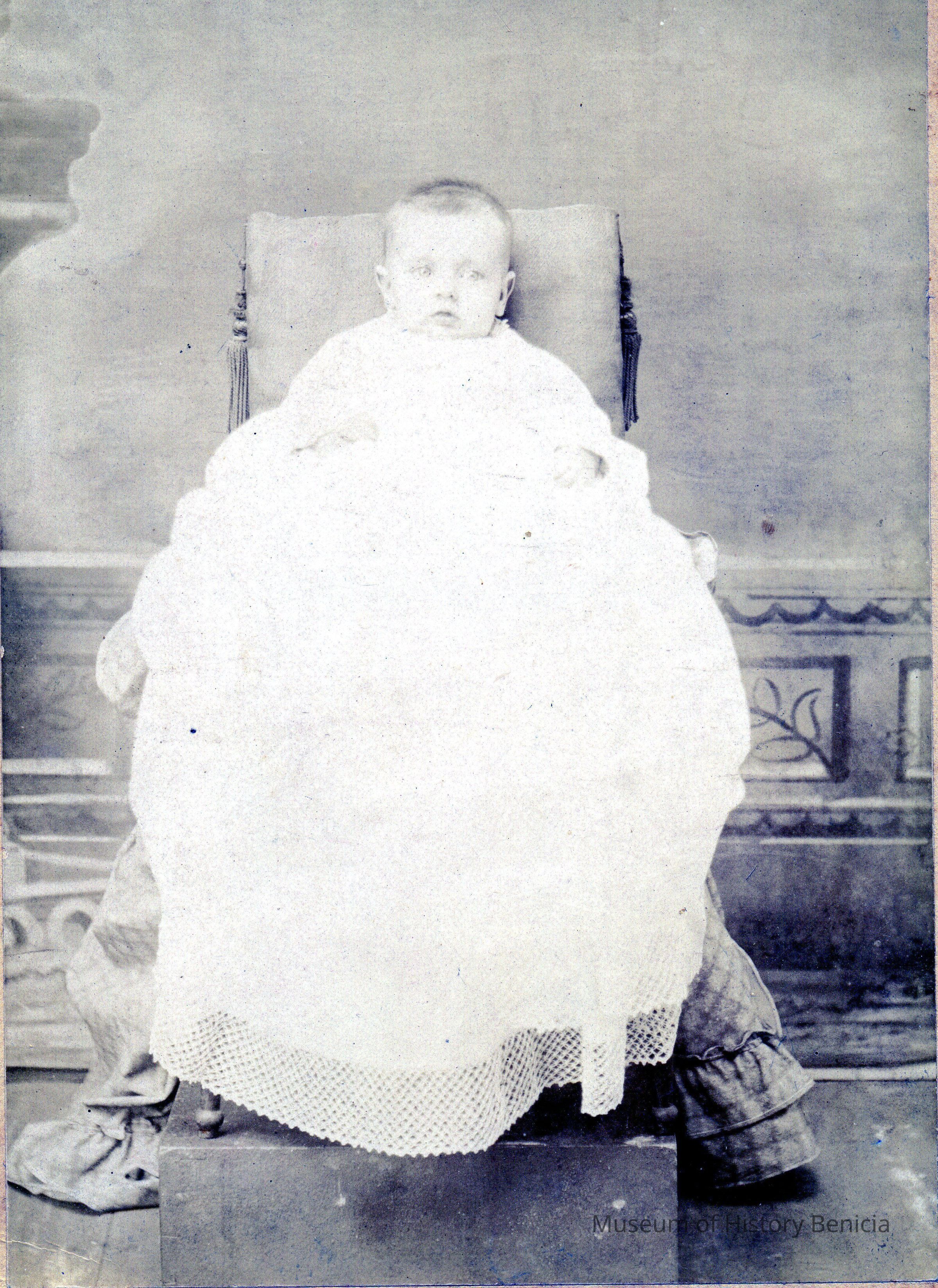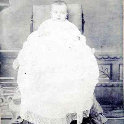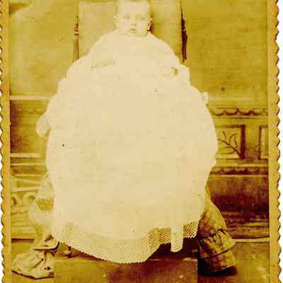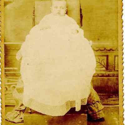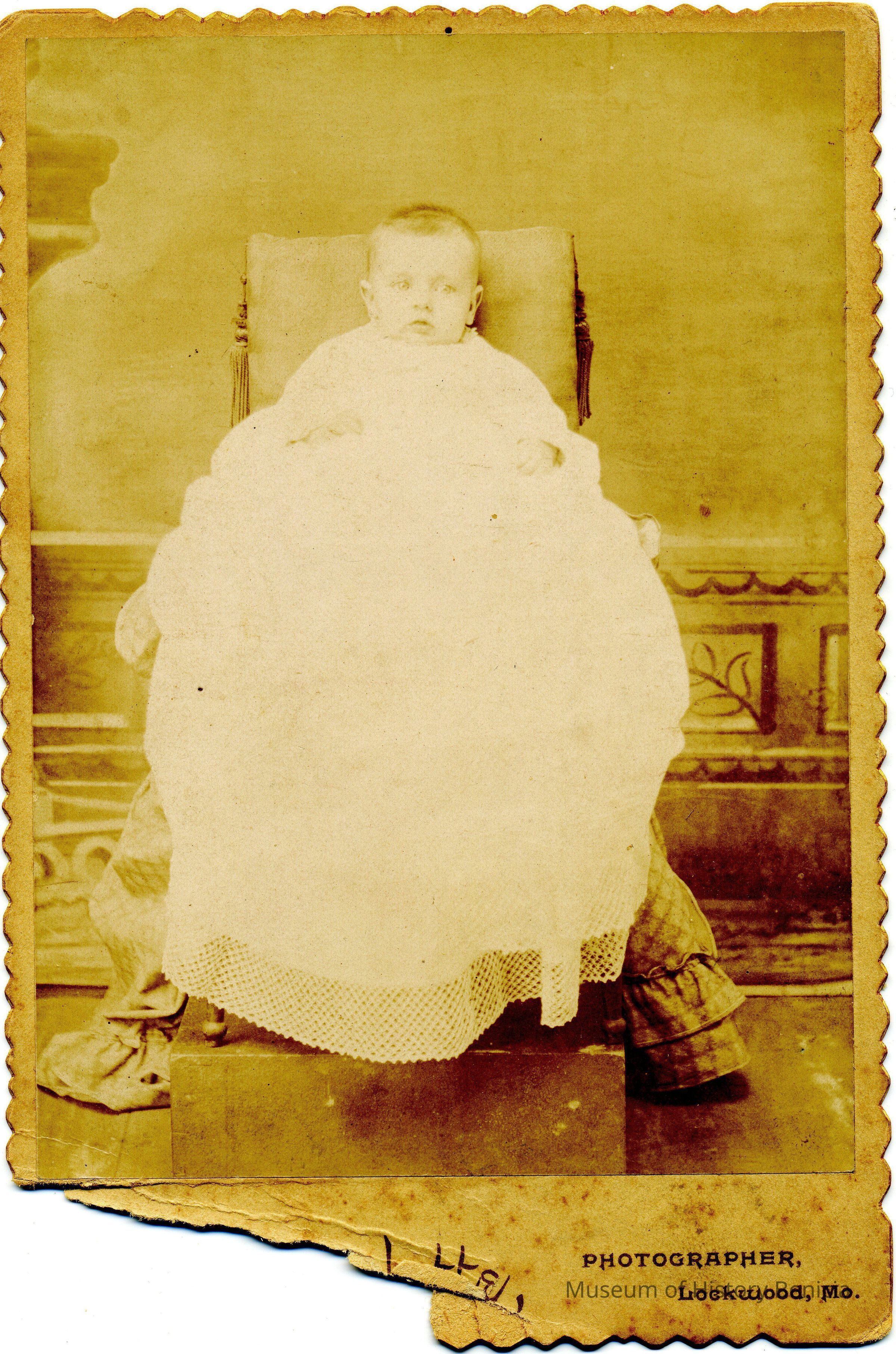 A cabinet card showing a small baby being held in a chair by an unseen person. The back of the photo identifies this as "Erma". Probably Erma Montgomery Wright, wife of Thomas Wright. The photo was taken in Lockwood, Missouri. Erma was born 11/18/1891.Collection