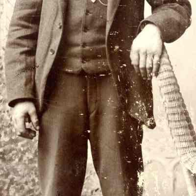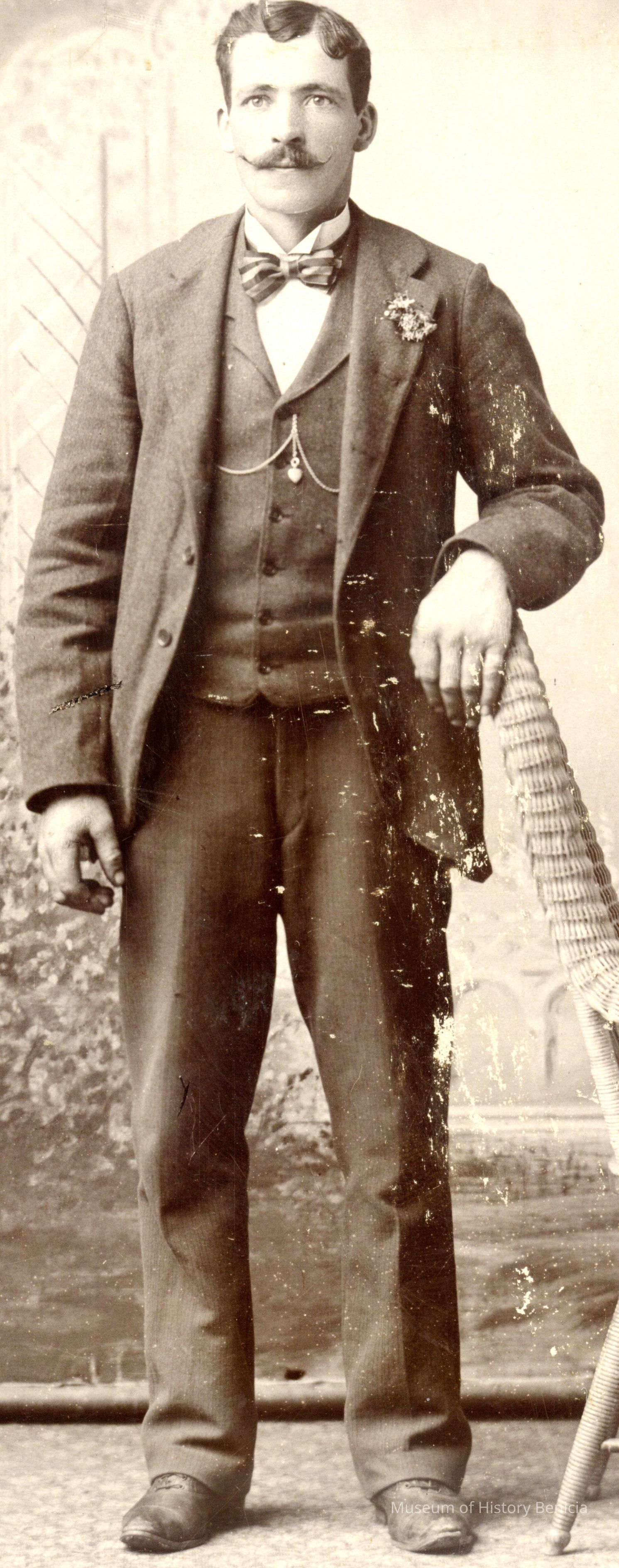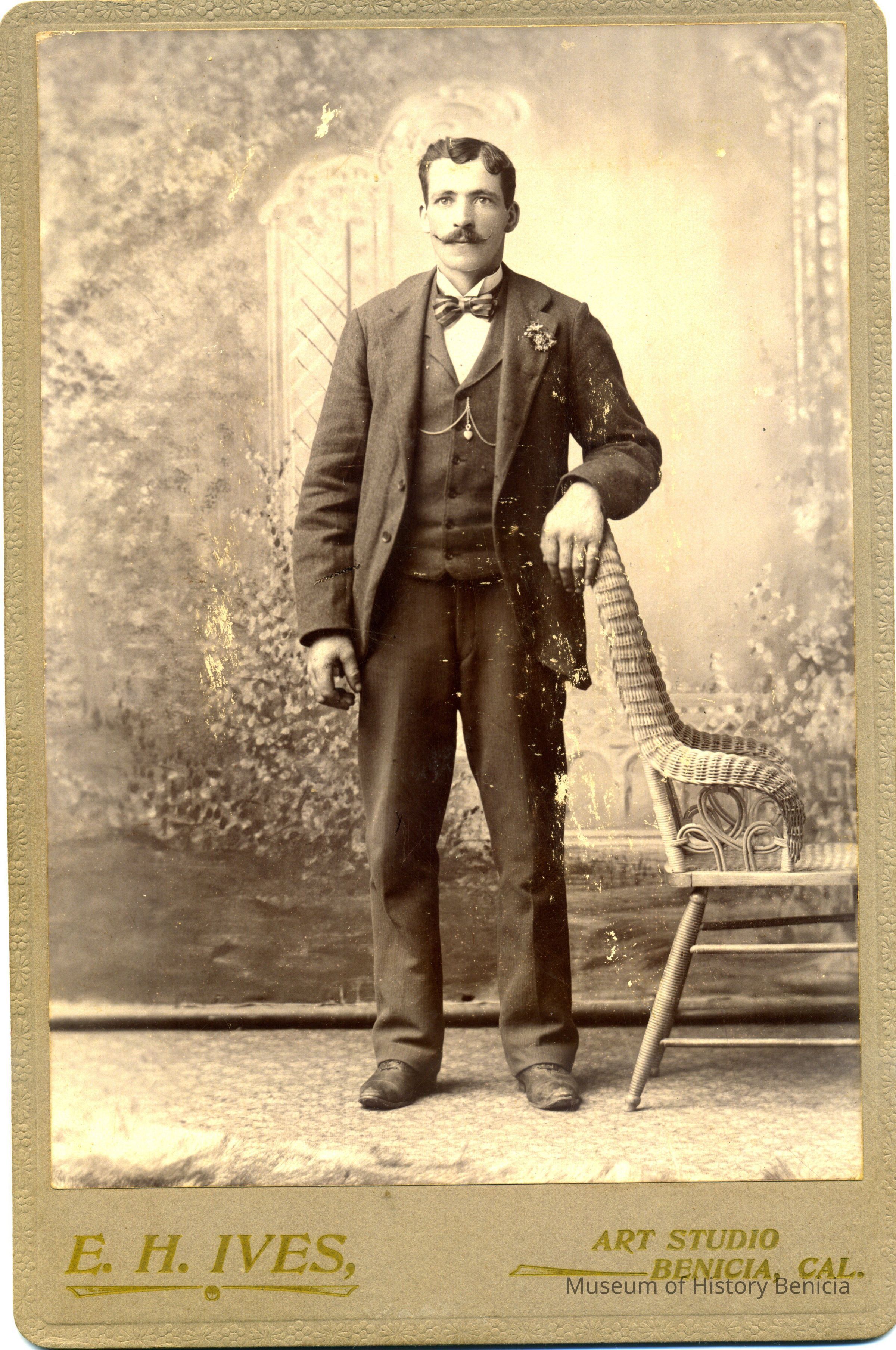 This is a cabinet card showing a studio portrait of a man in a suit. He has a flower in his lapel and a heart shaped watch fob. He also has a handlebar mustache with the ends waxed upward. The photo was taken at the E.H. Ives photo studio in Benicia, CA. Probably early 1900's.Collection