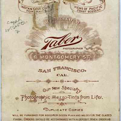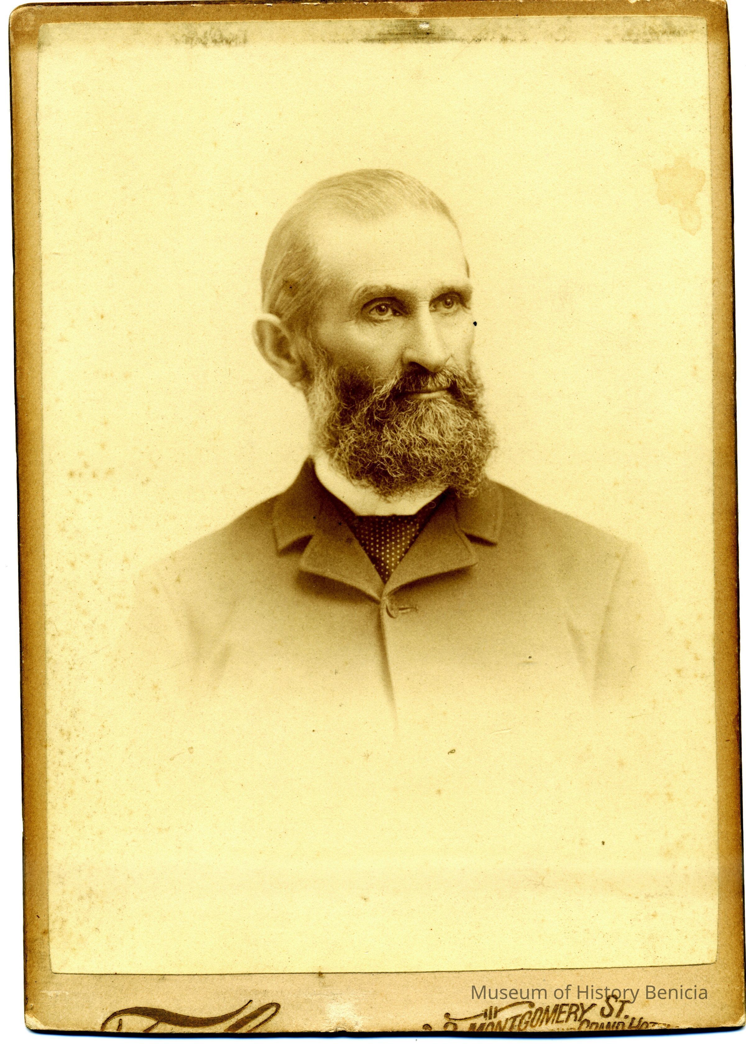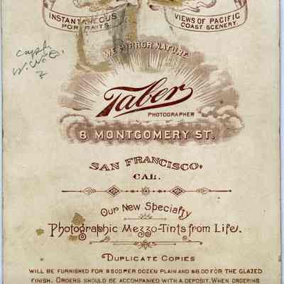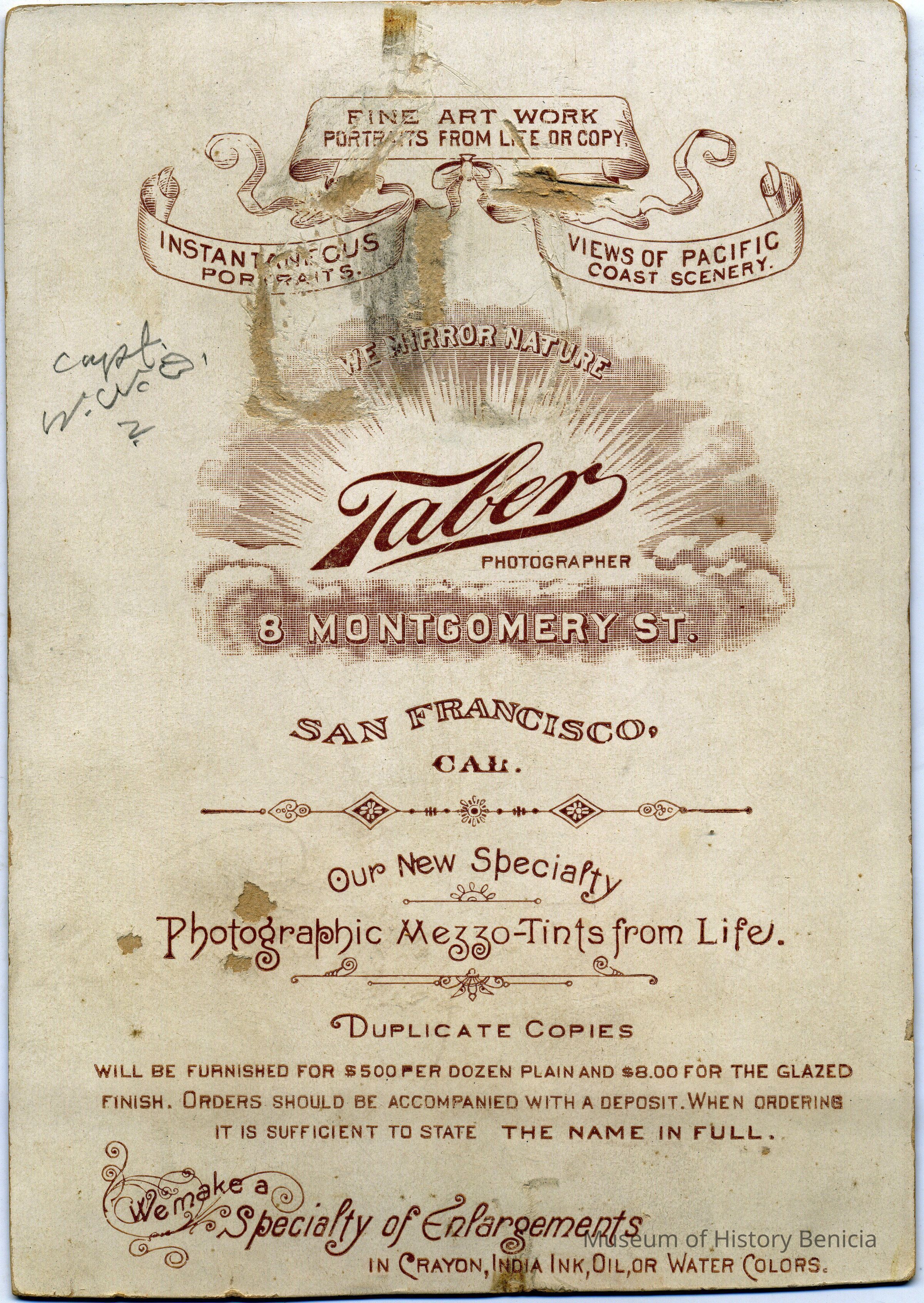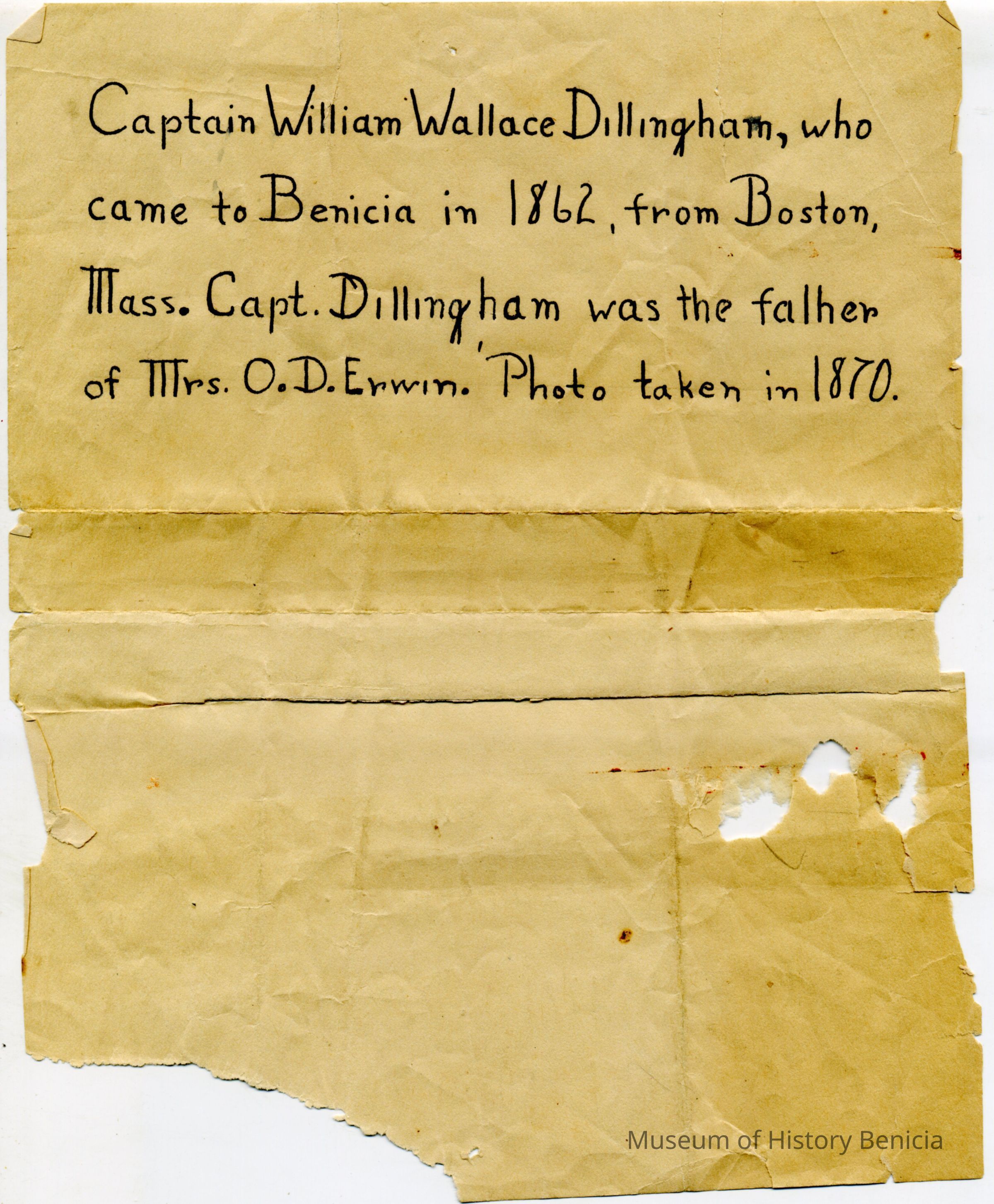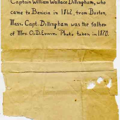 This is a Cabinet Card of Captain William Wallace Dillingham (1834 - 1894). He was married to Jane C. Paladina. It was with a note saying that Capt. Dillingham came to Benicia in 1862 from Boston, MA. He was the father of O.D. Erwin. Photo taken in 1862.