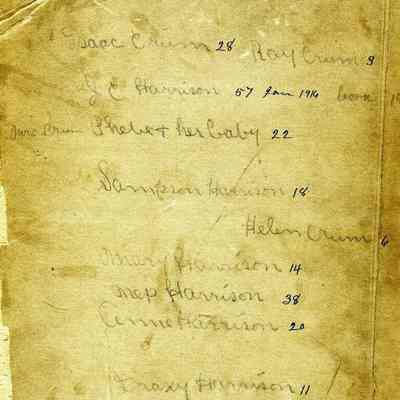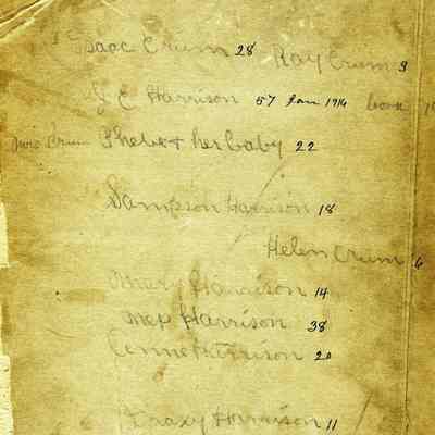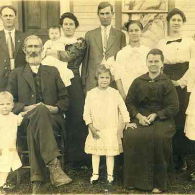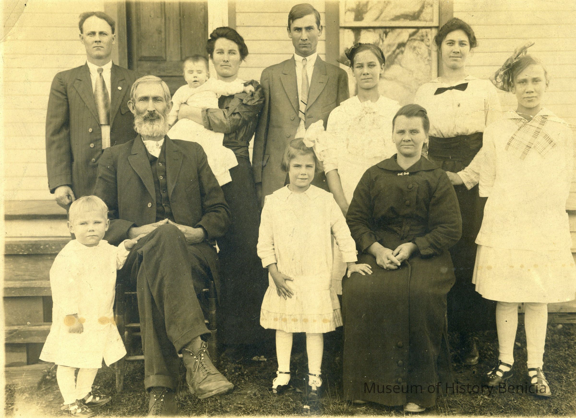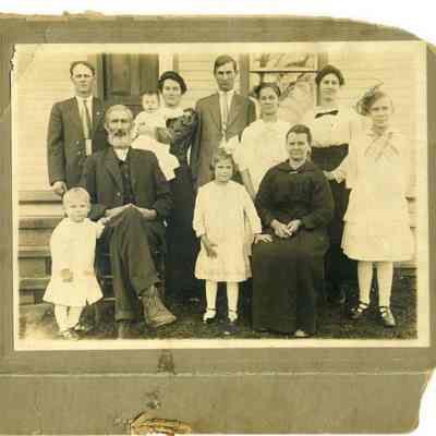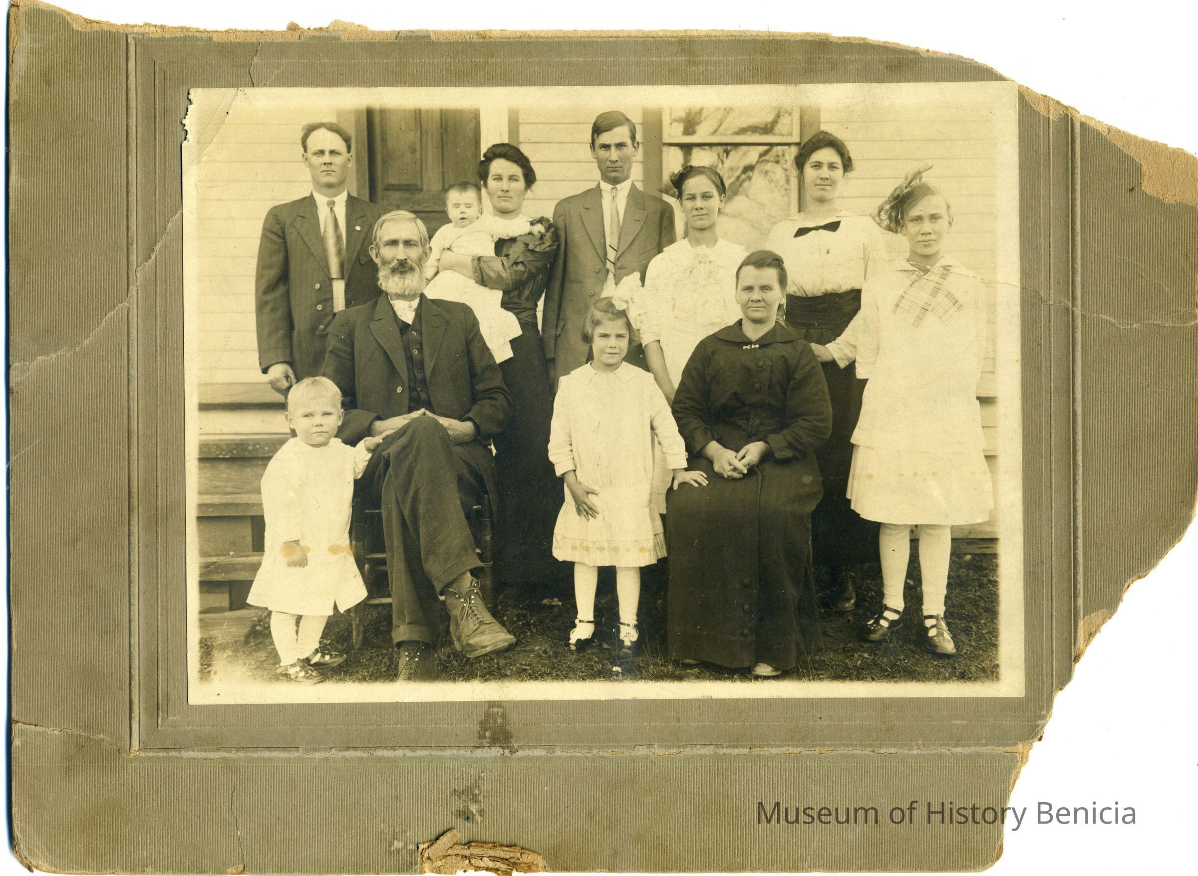 This is a photograph of the Harrison family in 1916. The cardboard around the photo has been damaged but the photo is intact. They are identified on the back as: