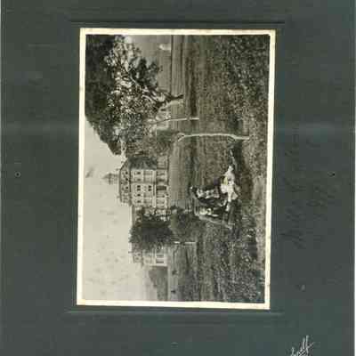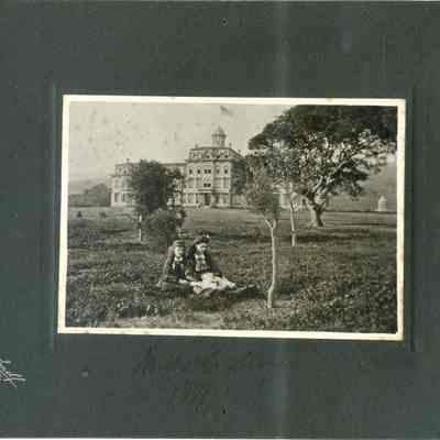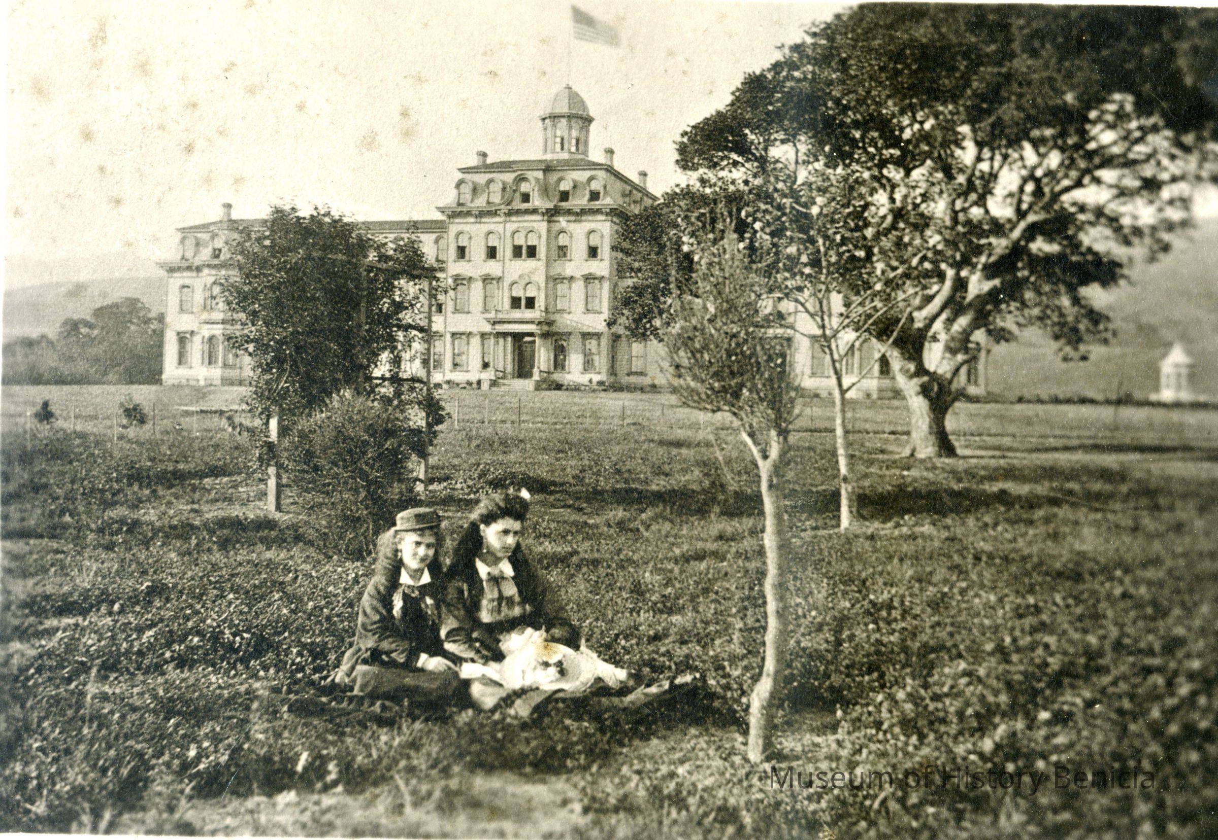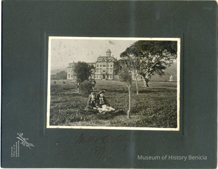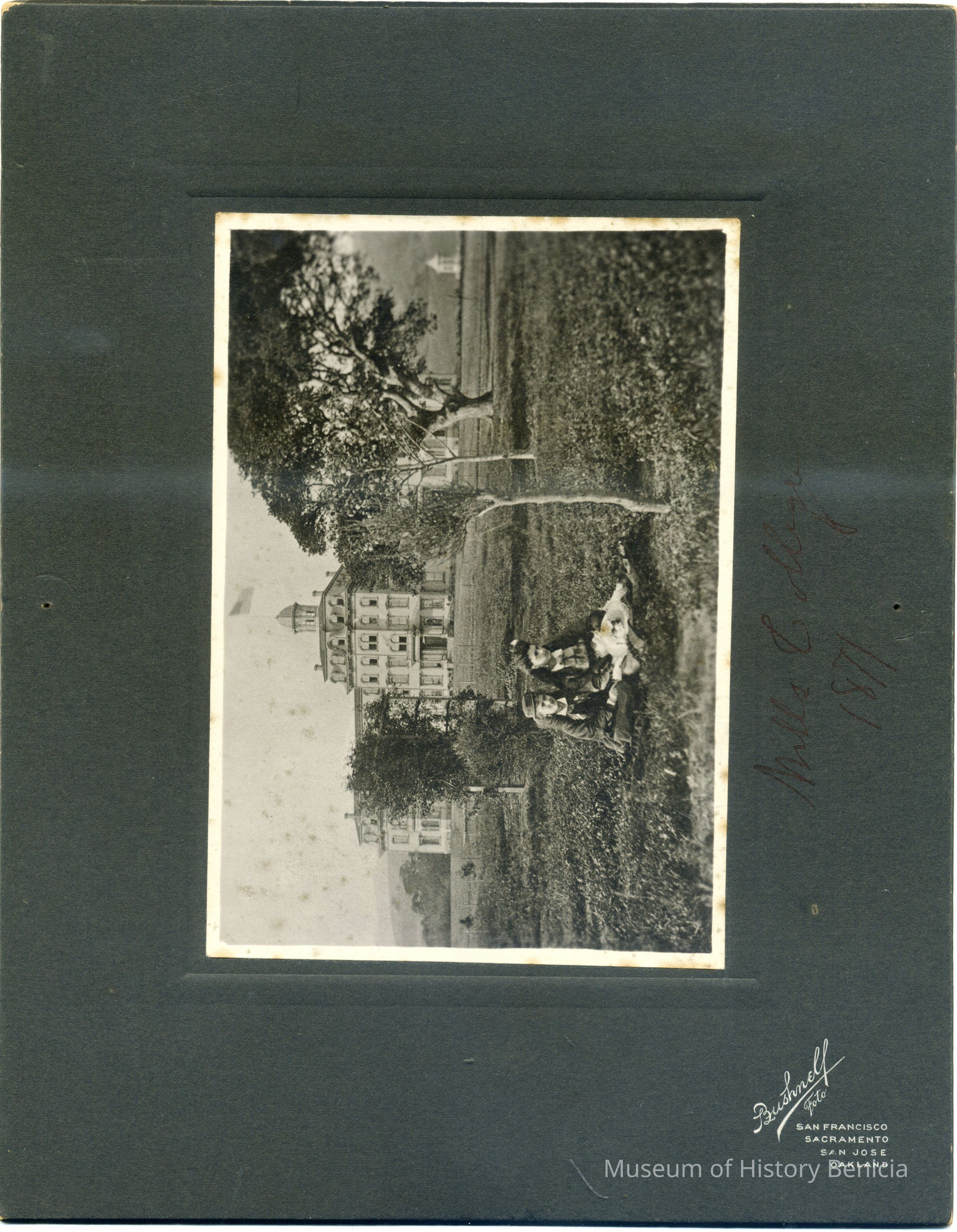 This is a cabinet card photo of Mills College. There are two young women having a picnic in the foreground. The photo was taken by Bushnell Foto studio of San Francisco, CA.Collection
