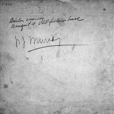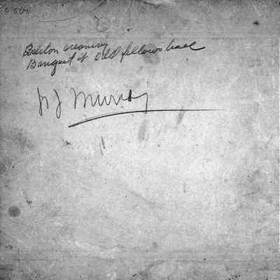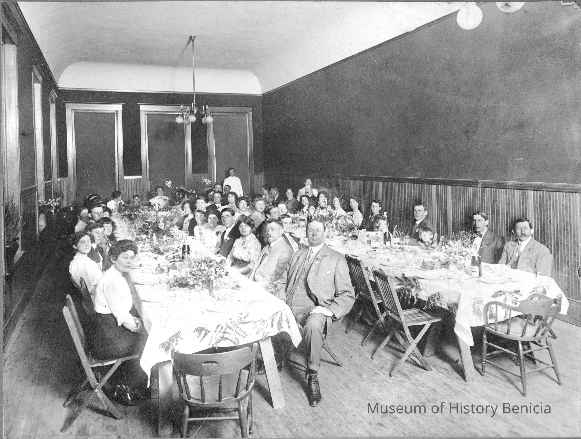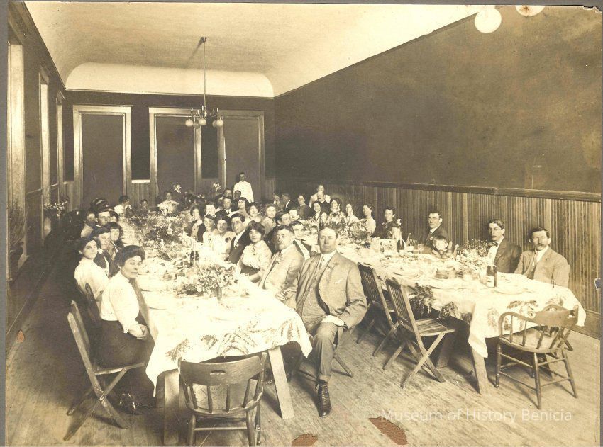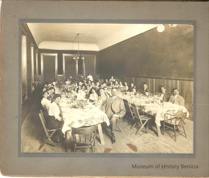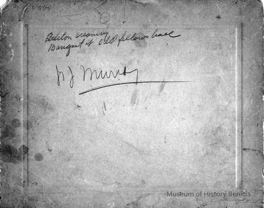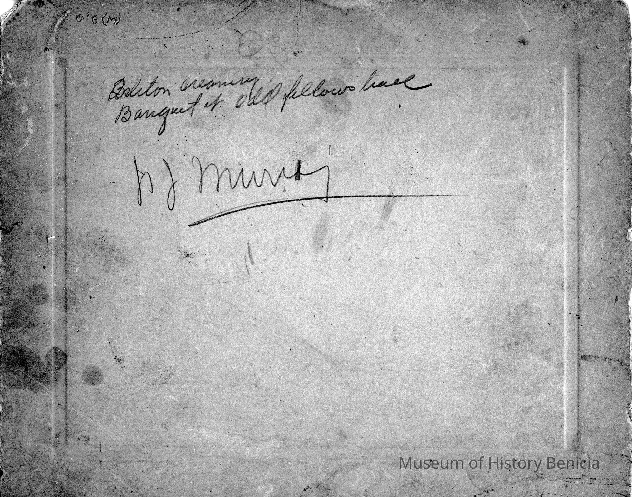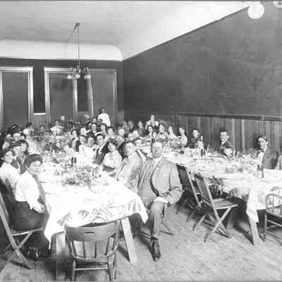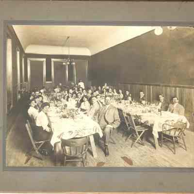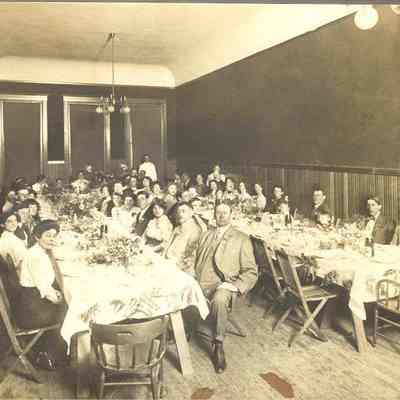 Photo of people at a luncheon. The photo is on a cardboard frame. The back says Isleton Creamery banquet at Odd Fellows hall and has the name N J Murry written on the back.Collection