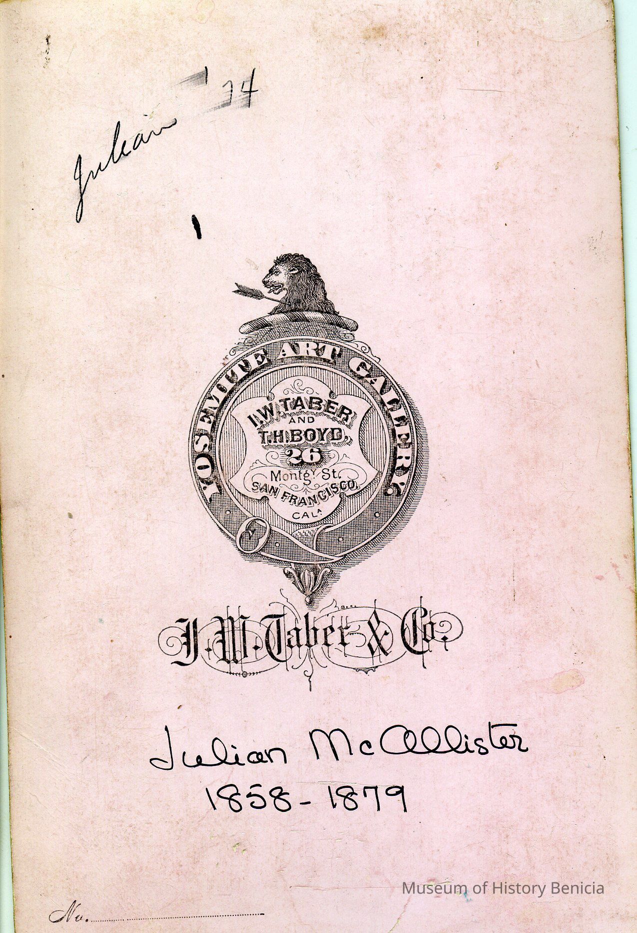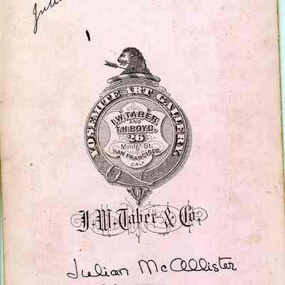 This is a photo Julian McAllister who was the son of Cutler McAllister who is the brother of Col. Julian McAllister, commanding officer of the Benicia Arsenal. Julian McAllister was born in 1858 and died about 1879 of pnuemonia.Collection