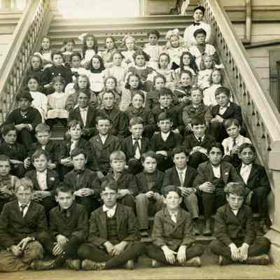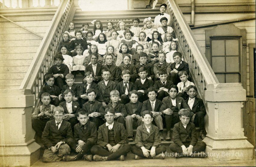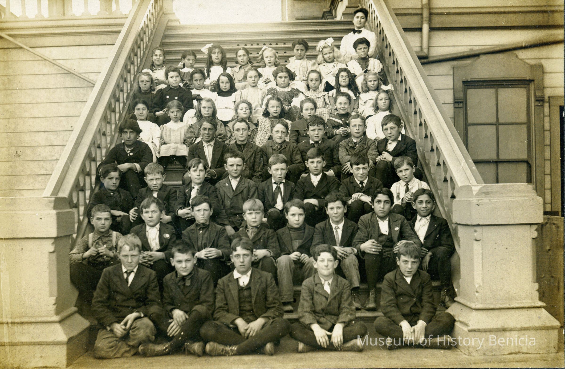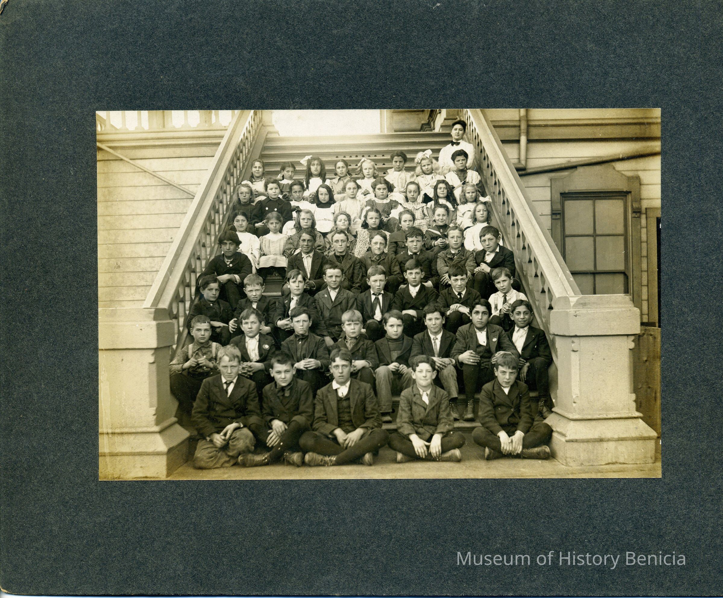Benicia school class photo. It is taken on the steps of the Benicia Grammar school. Another copy of this photo says that the boy in the fourth row and third from right is Donald Alexander Cameron and that this photo was taken about 1905.Collection