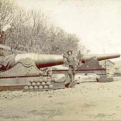 This photo shows soldiers standing on two artillery pieces. There are cannonballs in front of the artillery.Collection