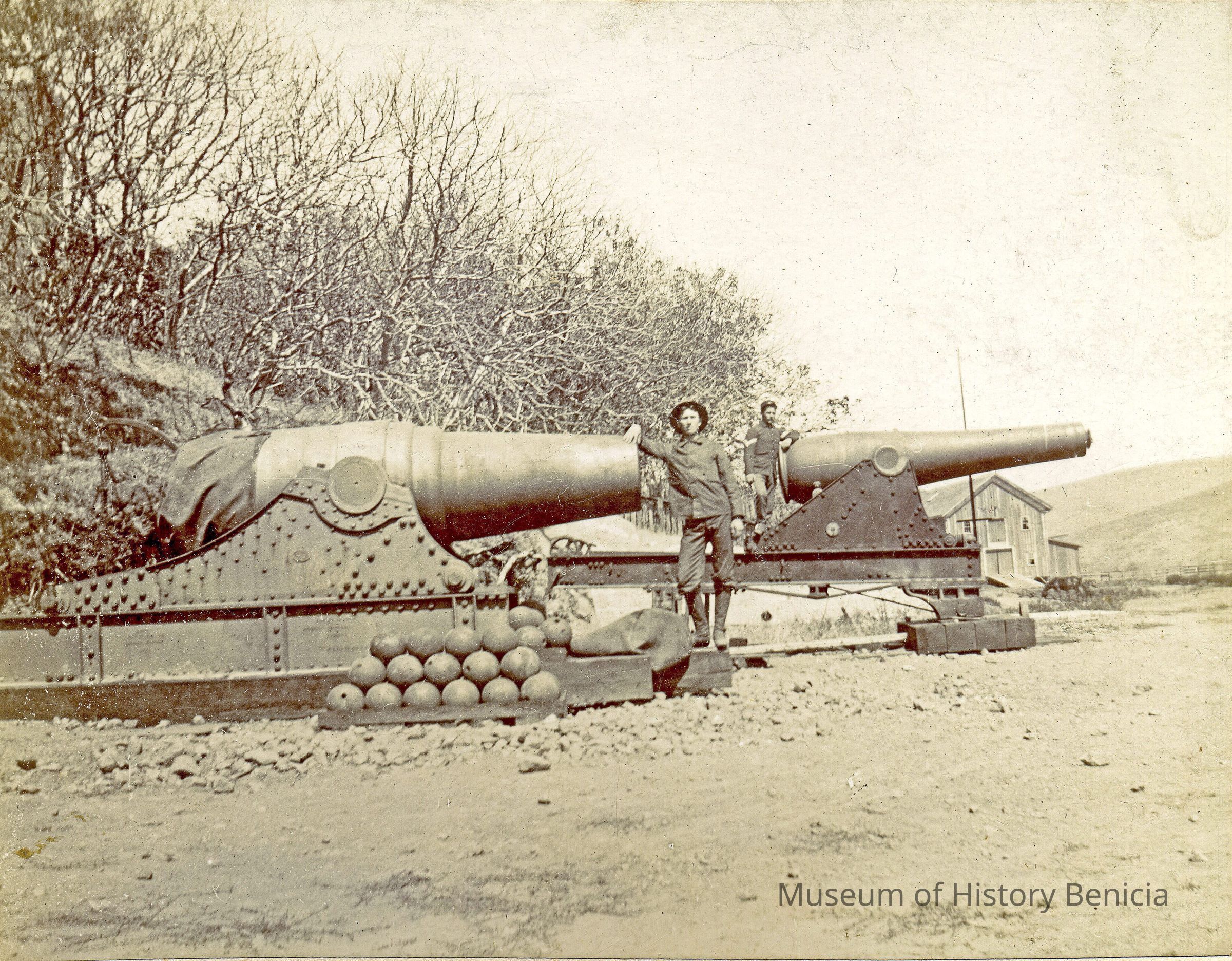 One of a set of 30 plus cabinet cards taken of the Benicia Arsenal and surrounding Benicia landmarks in 1898 according to the writing on the back of the photos.. We have 17 cards of the set. Most are of soldiers and material around the Arsenal.