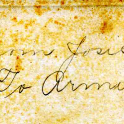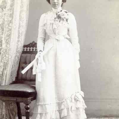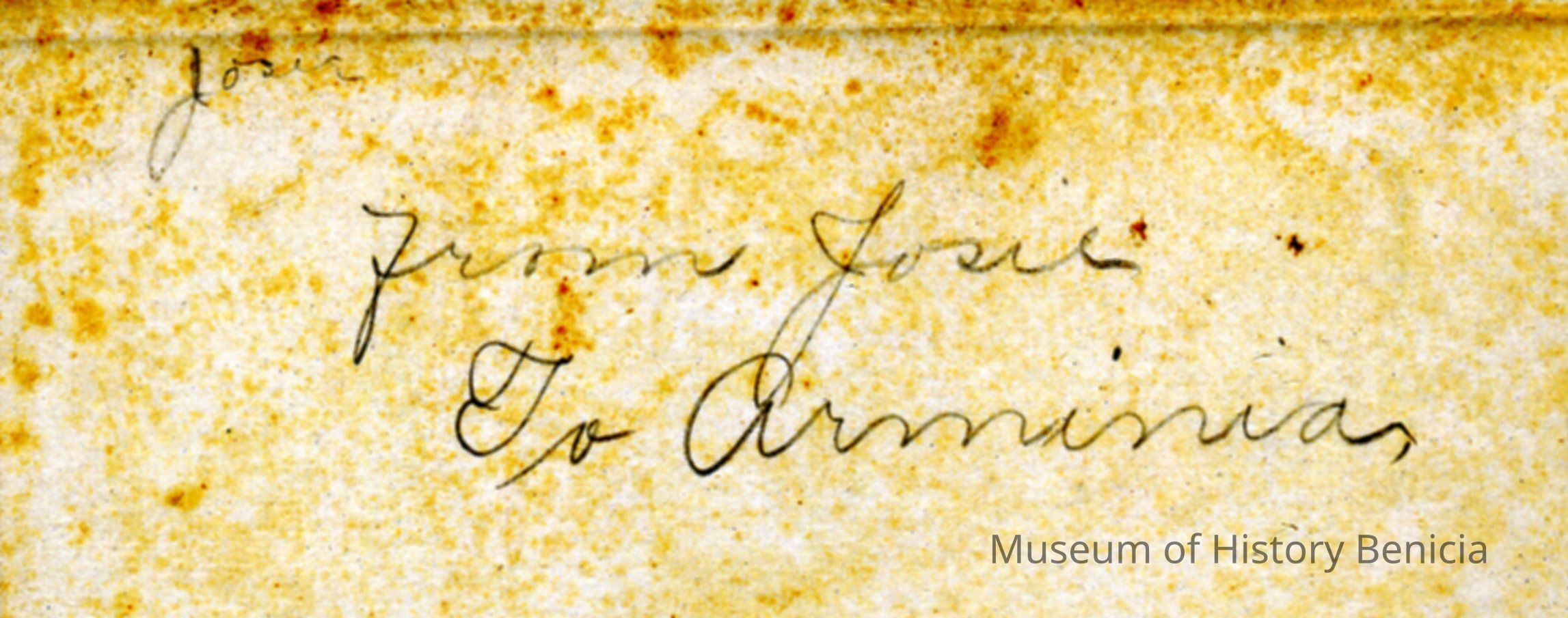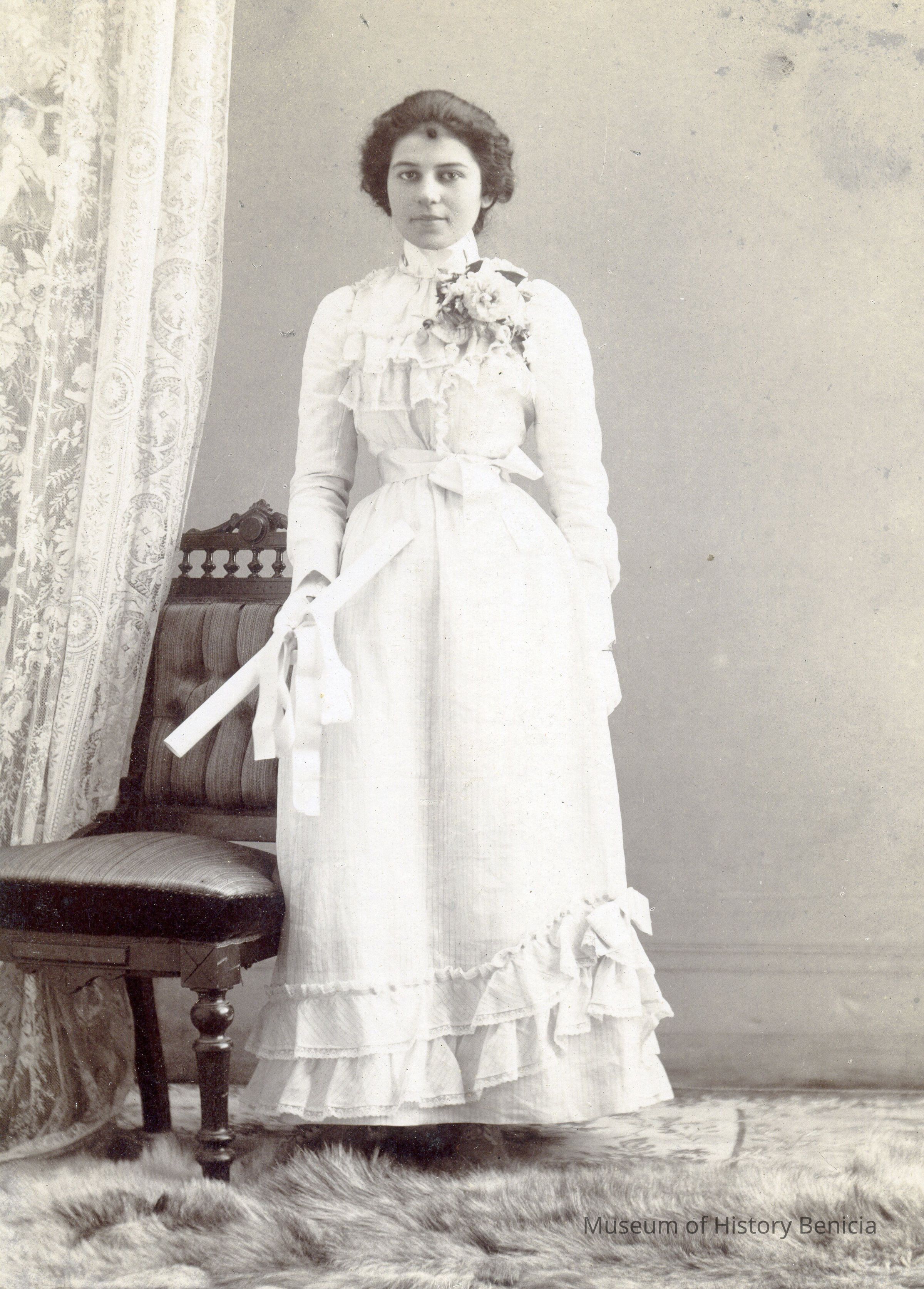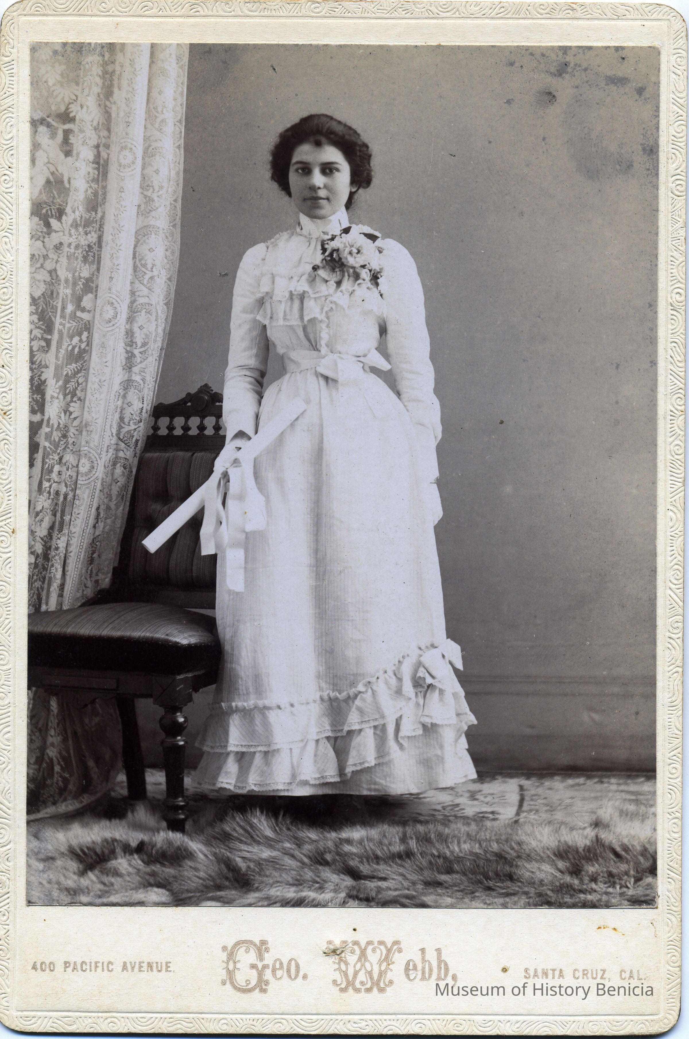 This is a photo from the album described below. It is a photo a woman by a photographer in Santa Cruz. She is in a fancy dress (wedding?) with a large coursage. The back says "from Josie to Arminia".