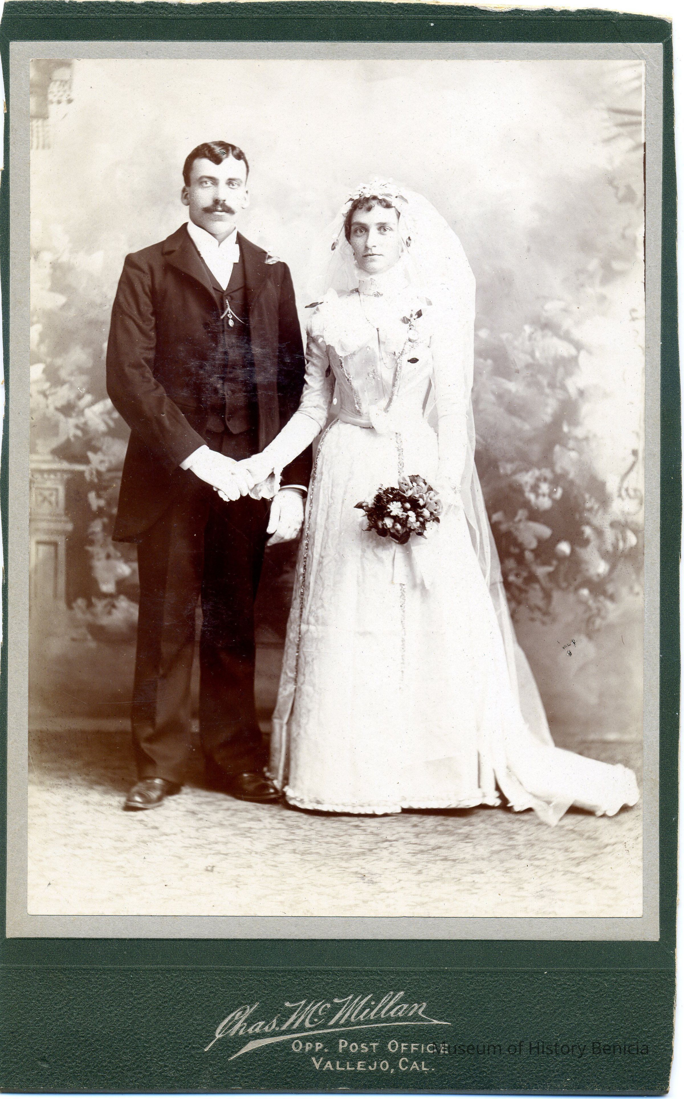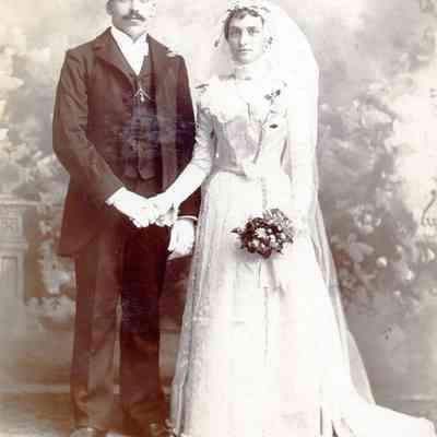 This is a photo from the album described below. It is a photo of a man and woman on their wedding day. The photo has been cut down to fit in the album slot.