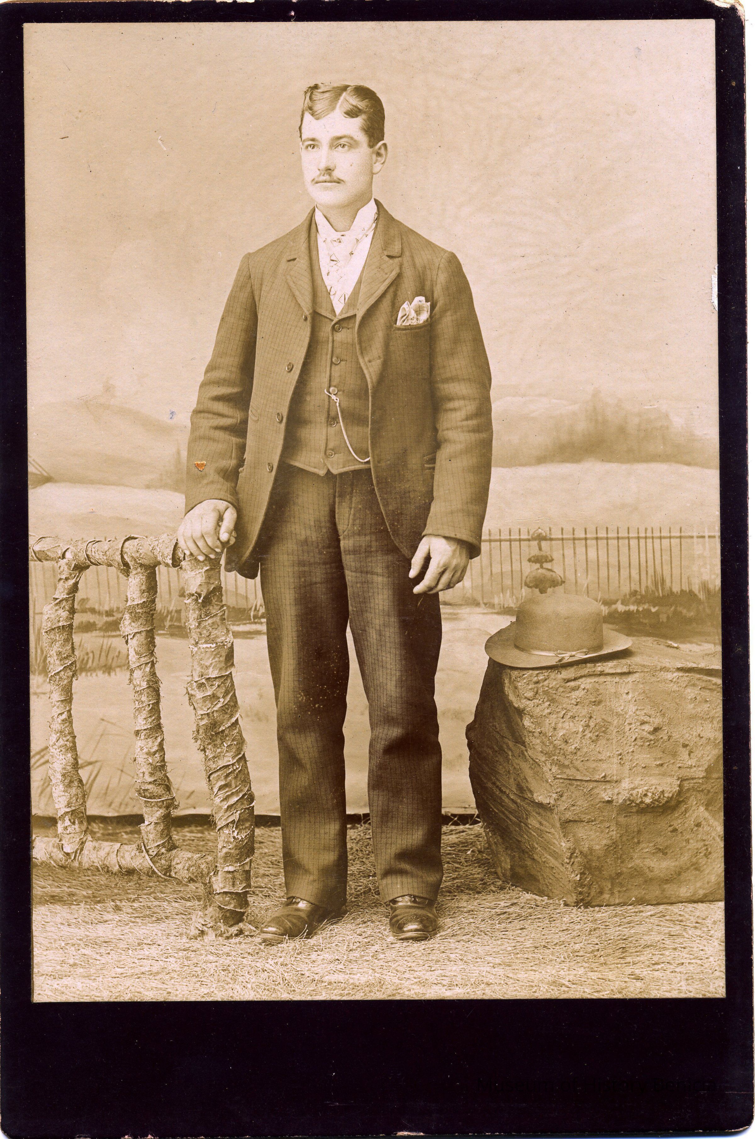 This is a photo from the album described below. It is a photo of a man and he has a wide brimmed hat next to him. There is no identifying information on the photo.